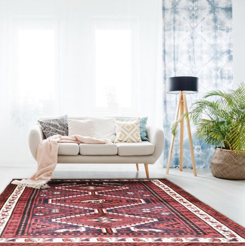Bright living room with Kazak oriental rug in bold red and beige tones.