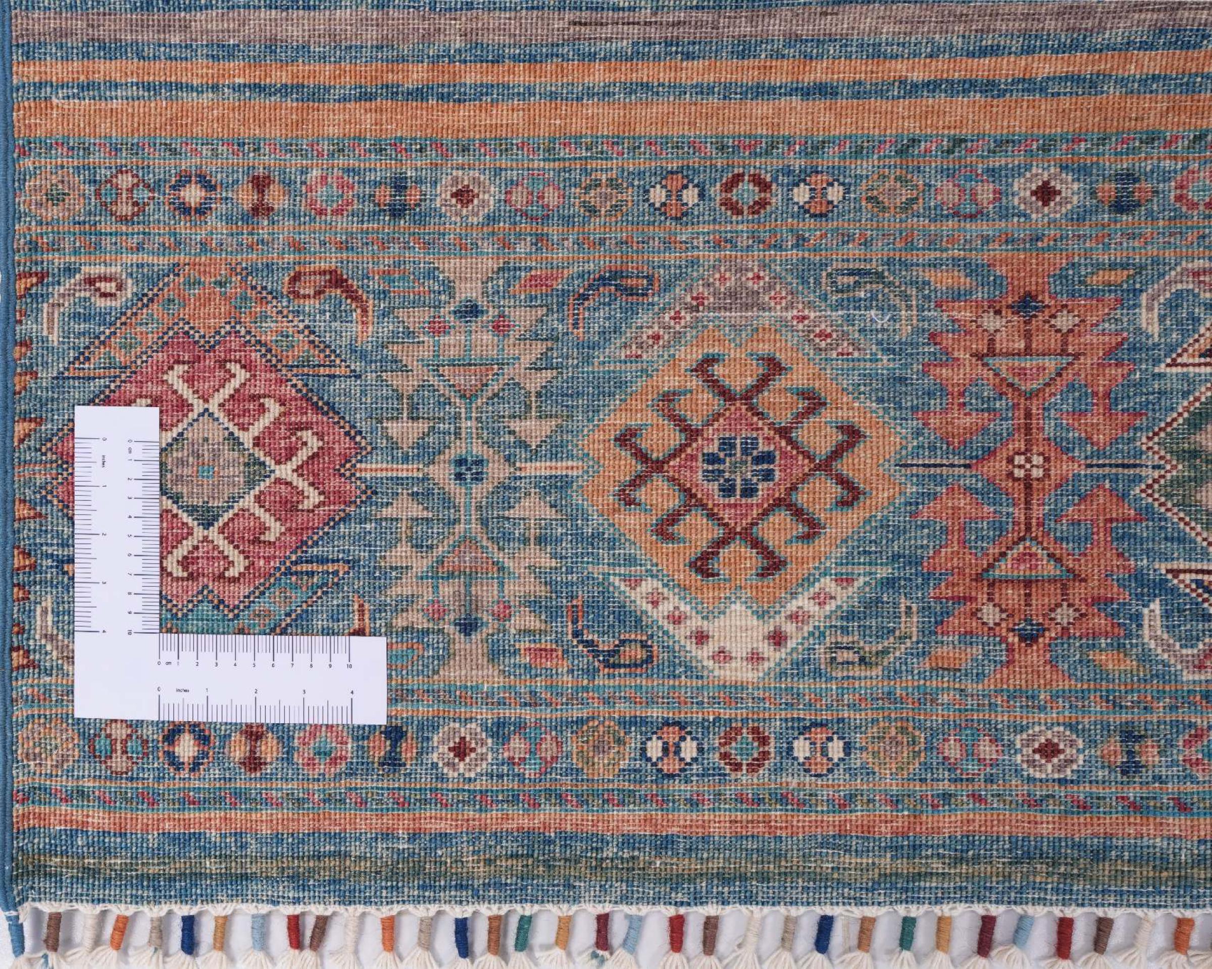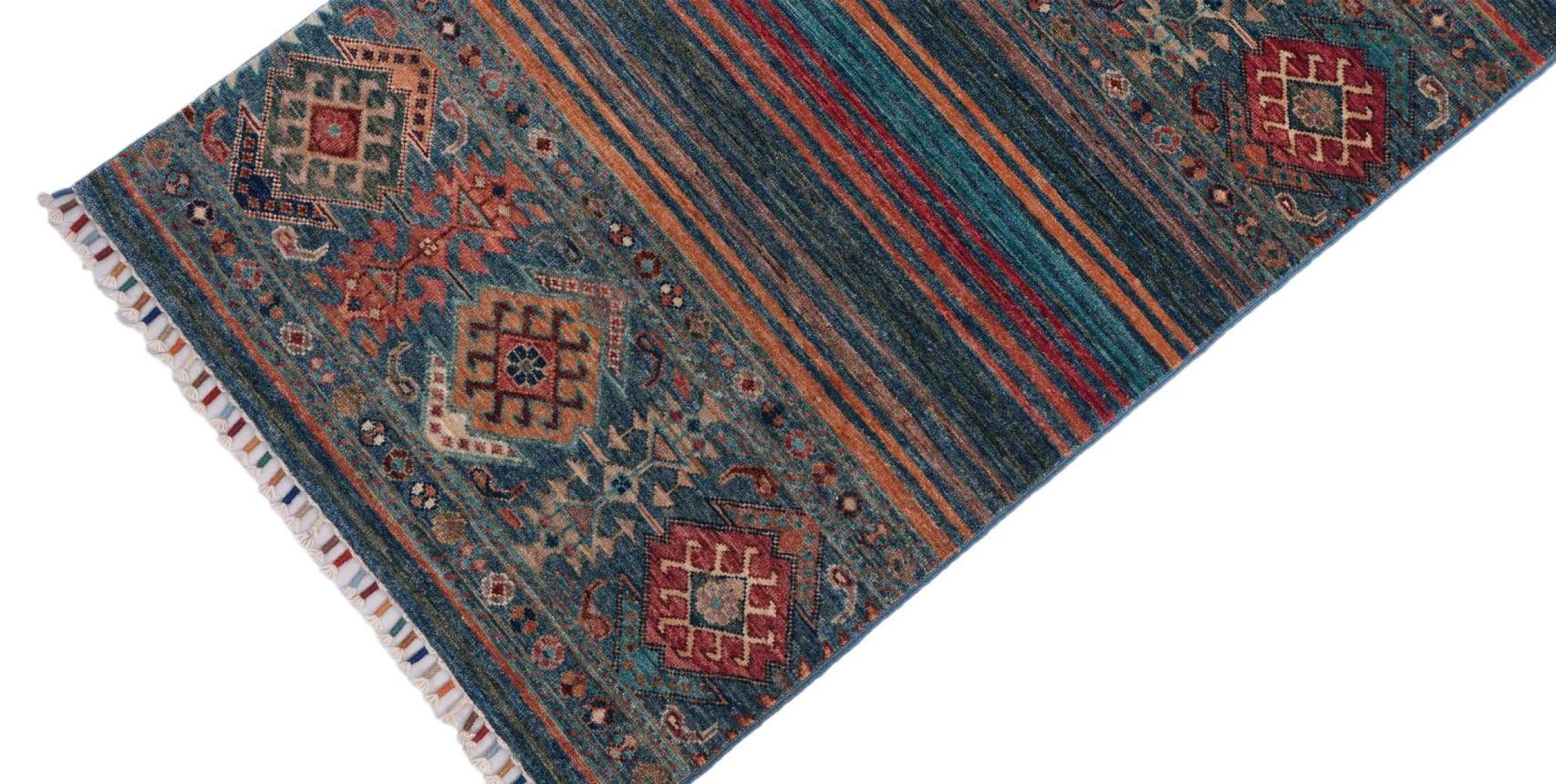 This Arijana Shaal carpet was knotted by hand in Pakistan. It promises a very high quality and thus offers long lasting pleasure. The pattern in stripes is varied and exciting. It was inspired by the well-known Moharamati design. If you find monochrome carpets too boring, you will certainly be delighted with this Arijana Shaal.