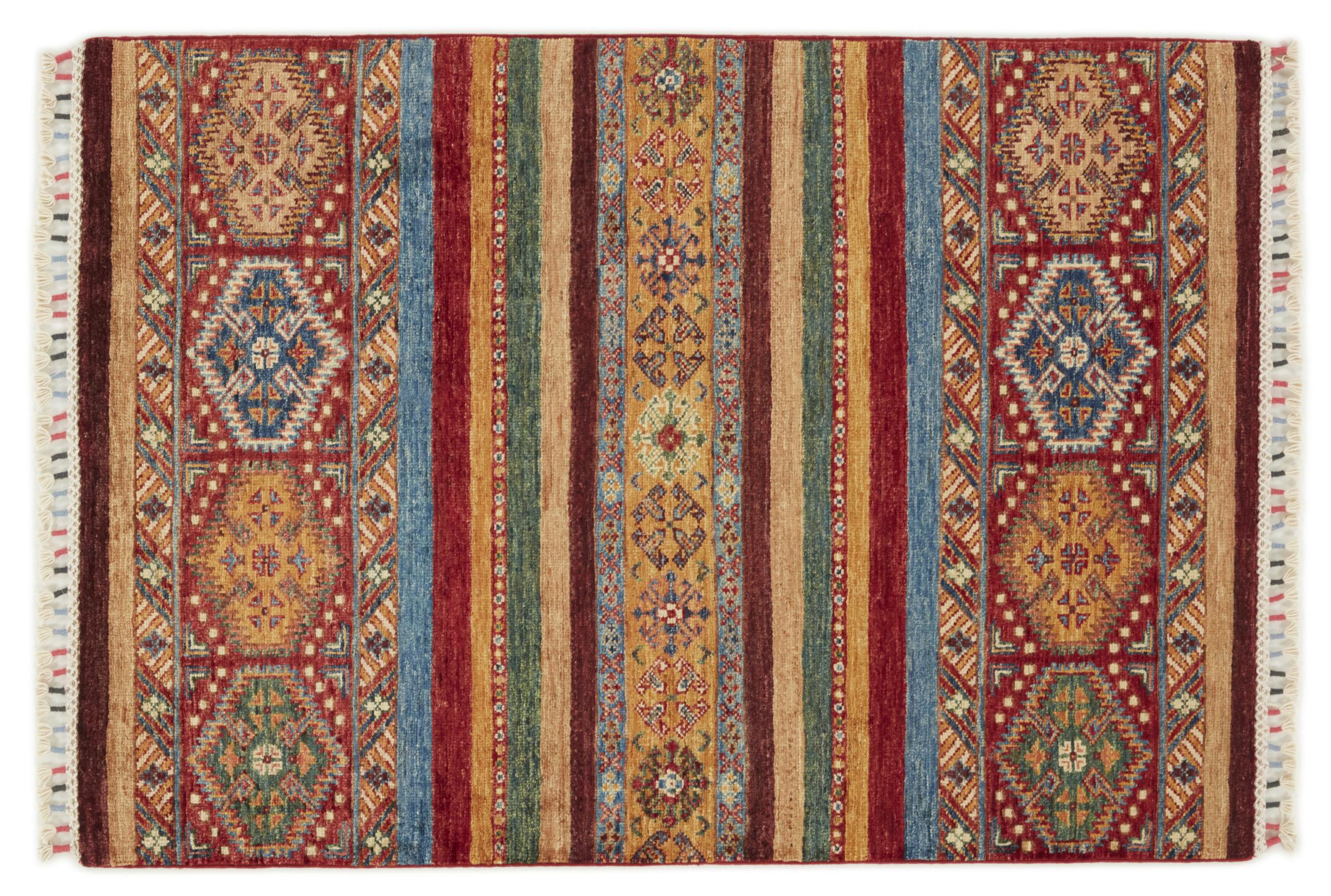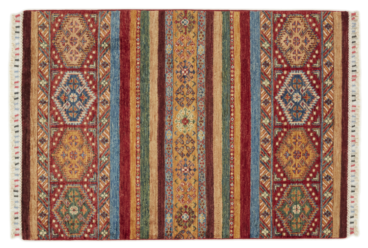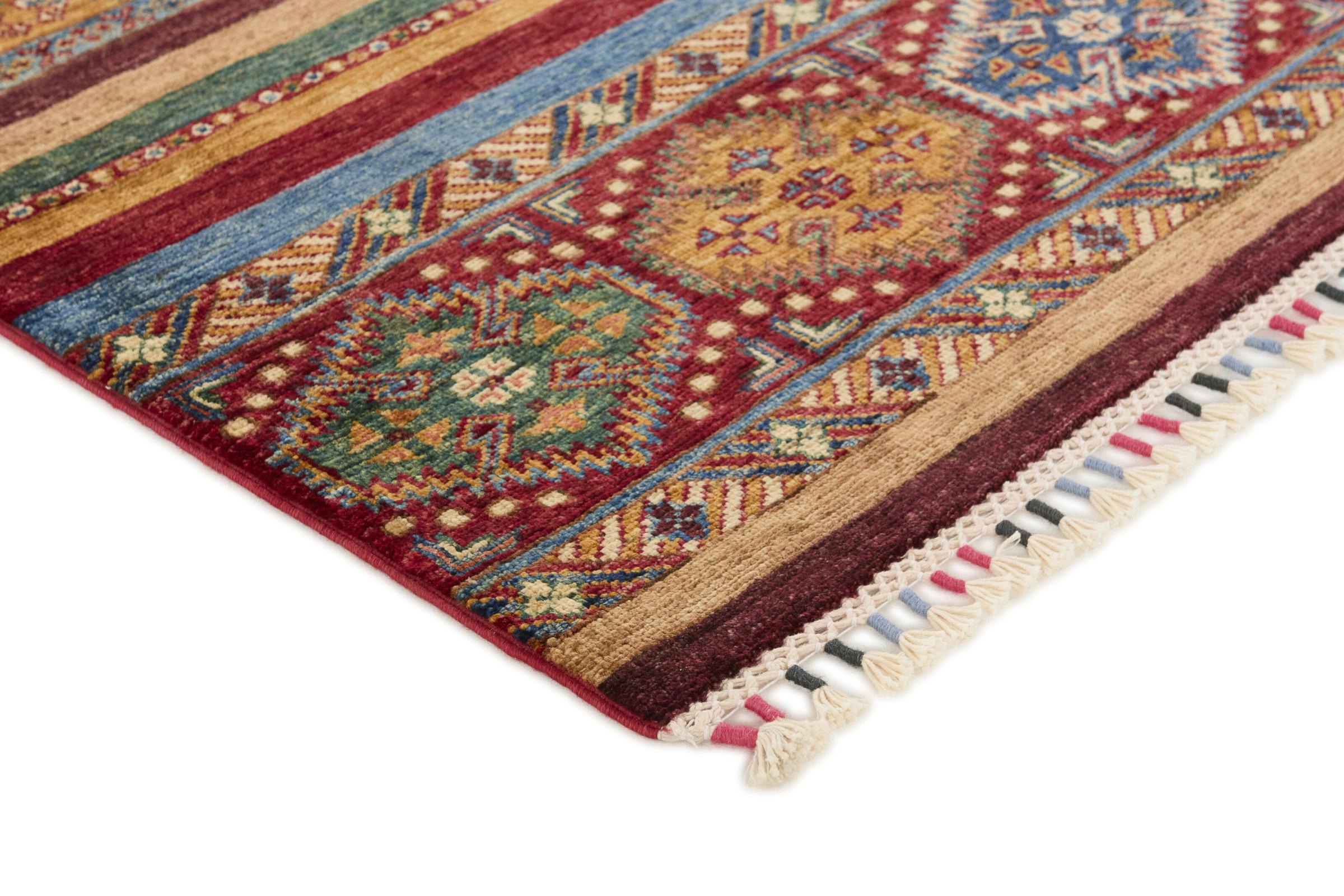 This Arijana Shaal carpet was knotted by hand in Pakistan. It promises a very high quality and thus offers long lasting pleasure. The pattern in stripes is varied and exciting. It was inspired by the well-known Moharamati design. If you find monochrome carpets too boring, you will certainly be delighted with this Arijana Shaal.
