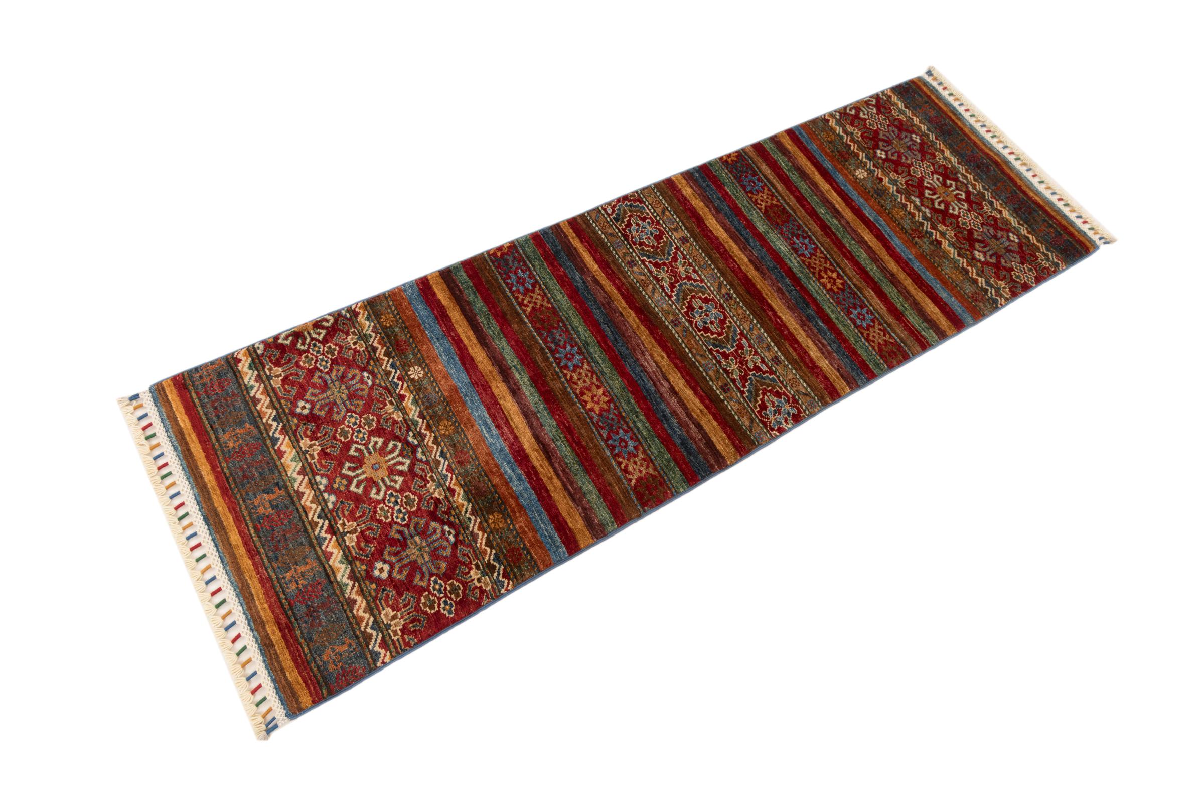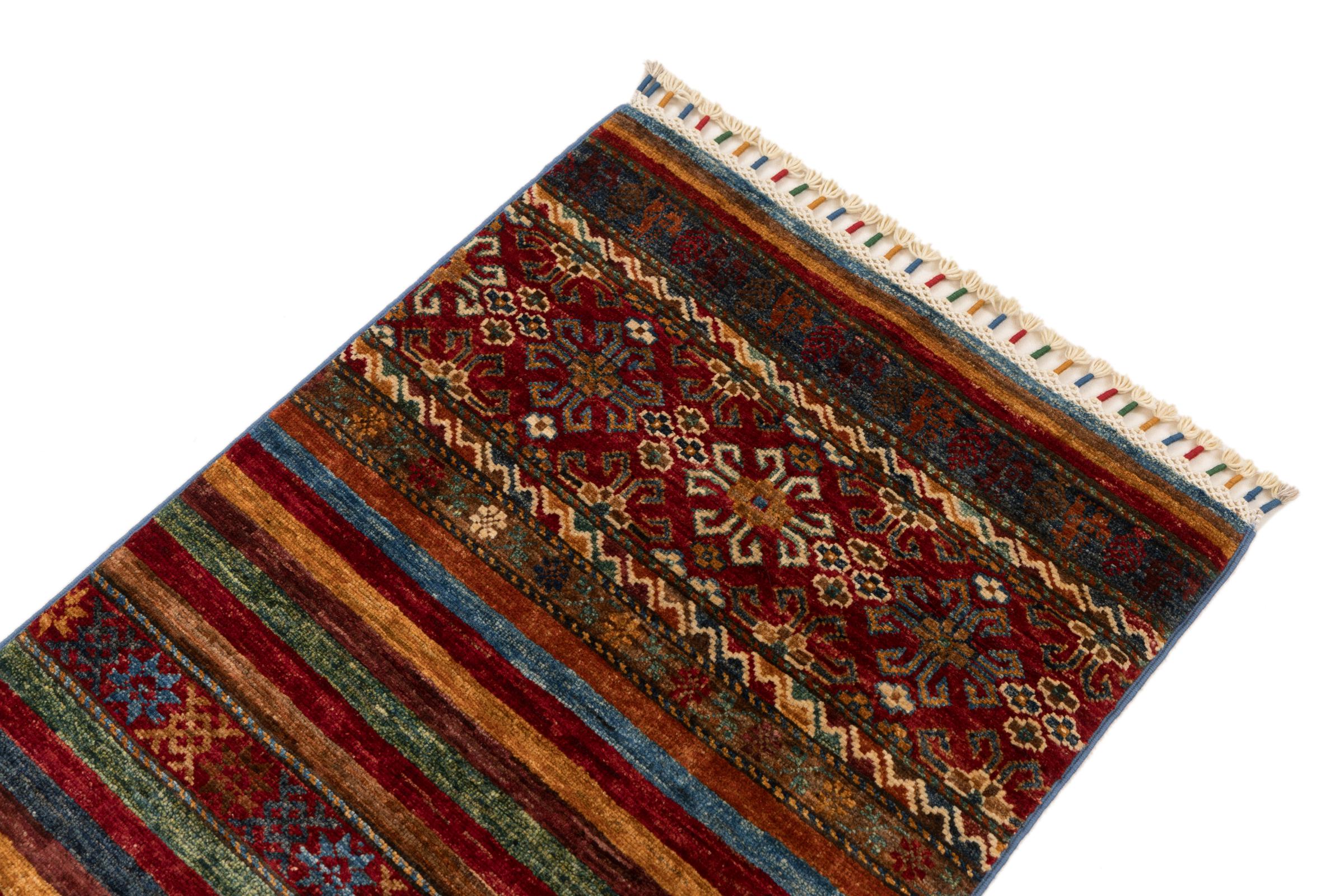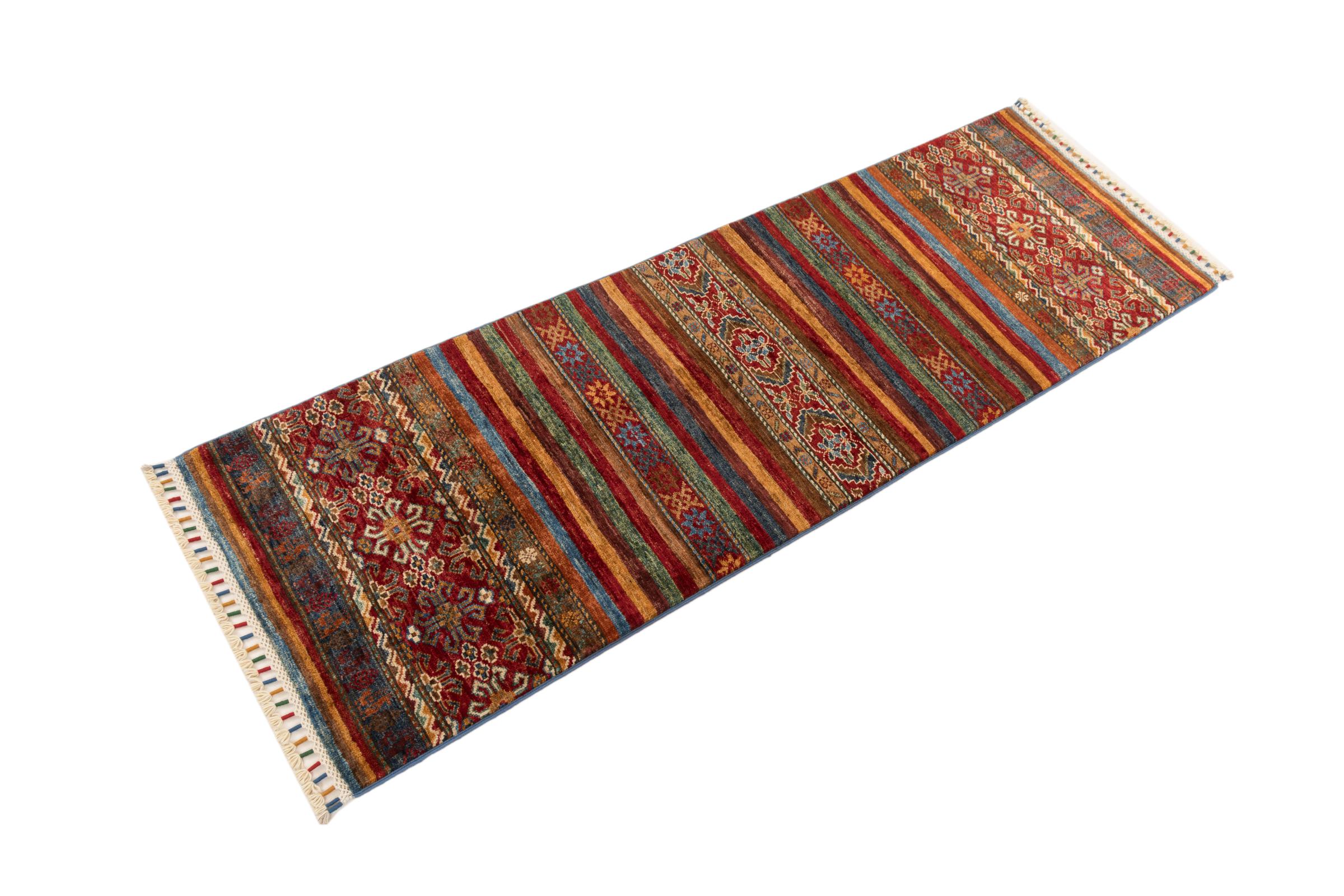 Carpet ID: 280296003427081 Size: 185x62 cm Thickness: ap. 5 mm Knot density: 128 000 - 160 000 / m² Manufacturing: Knotted by hand Pile: Handspun wool Warp: Cotton Origin: Afghanistan Age: New Weight: ap. 4 kg In stock: Unique - Only 1 in stock