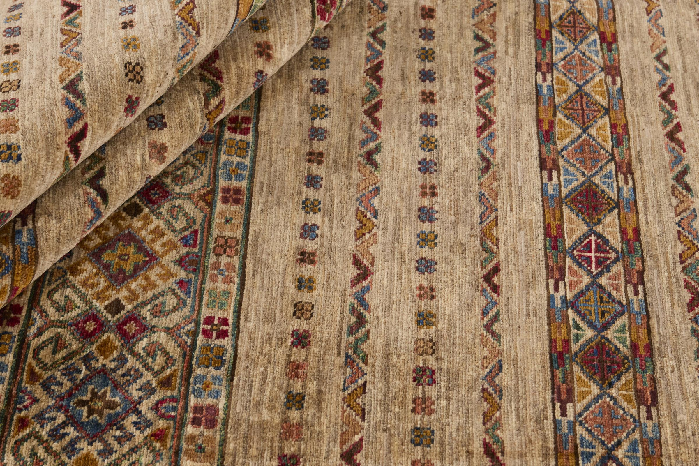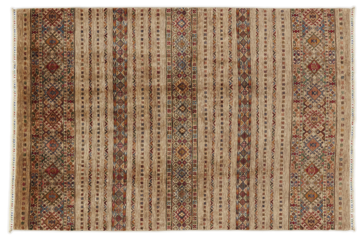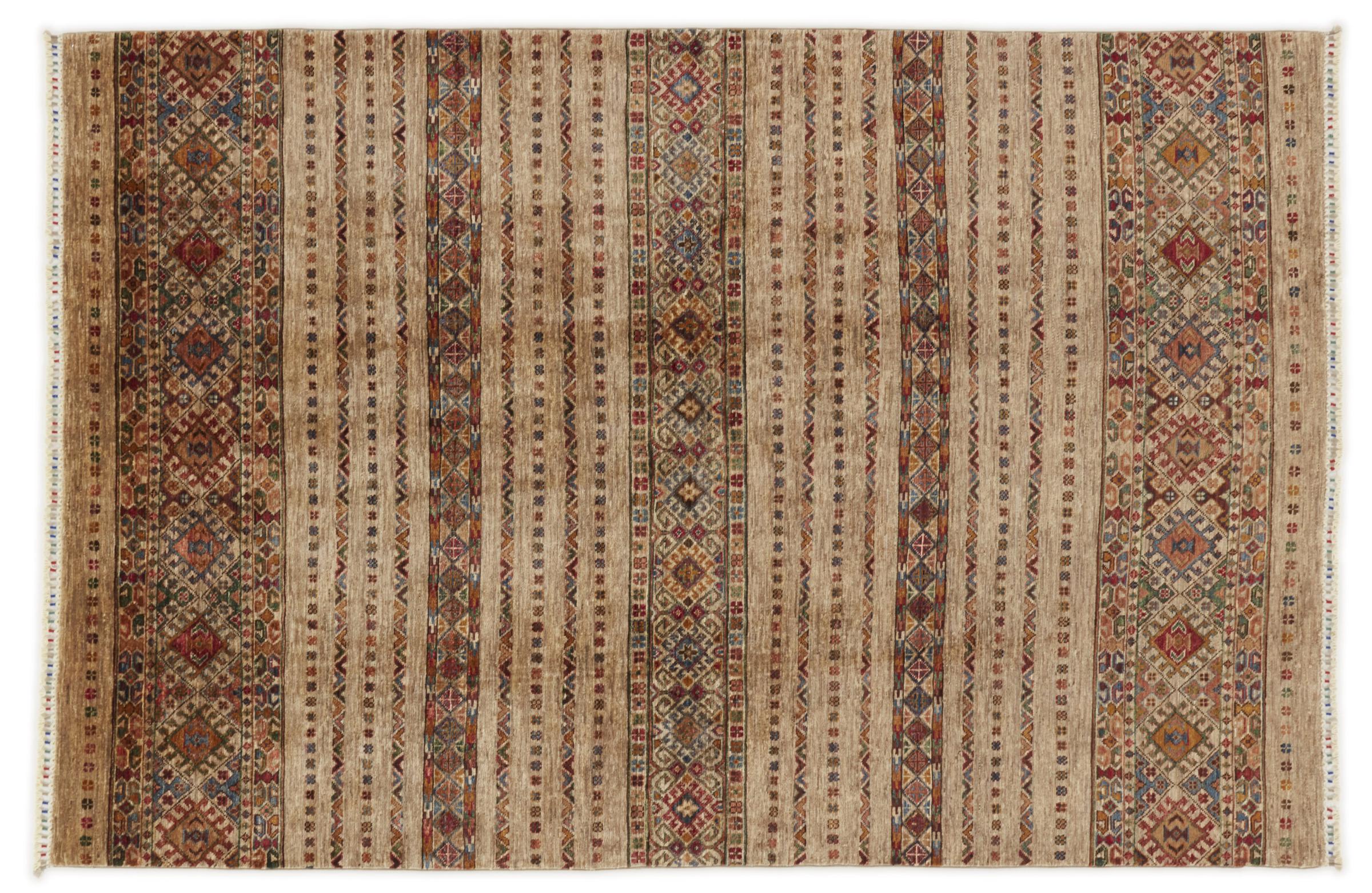 This Arijana Shaal carpet was knotted by hand in Pakistan. It promises a very high quality and thus offers long lasting pleasure. The pattern in stripes is varied and exciting. It was inspired by the well-known Moharamati design. If you find monochrome carpets too boring, you will certainly be delighted with this Arijana Shaal.