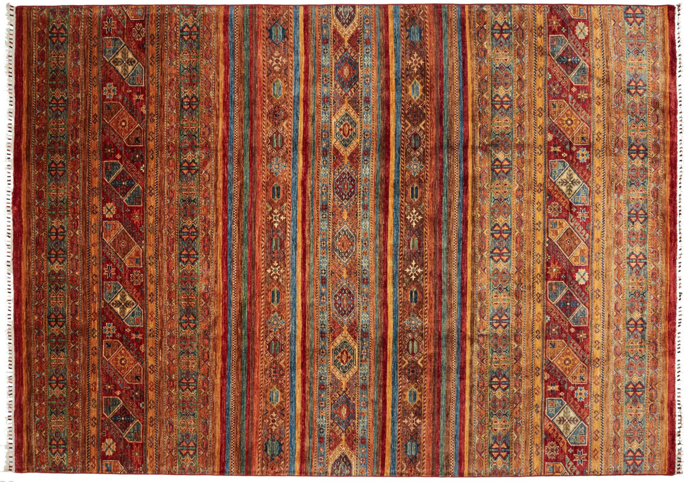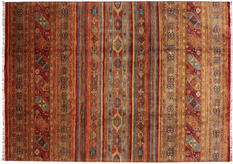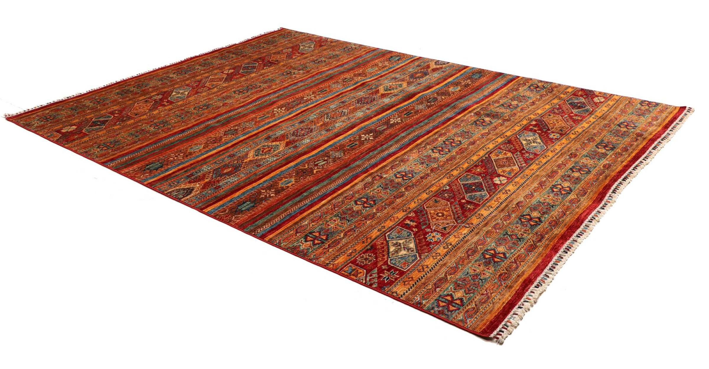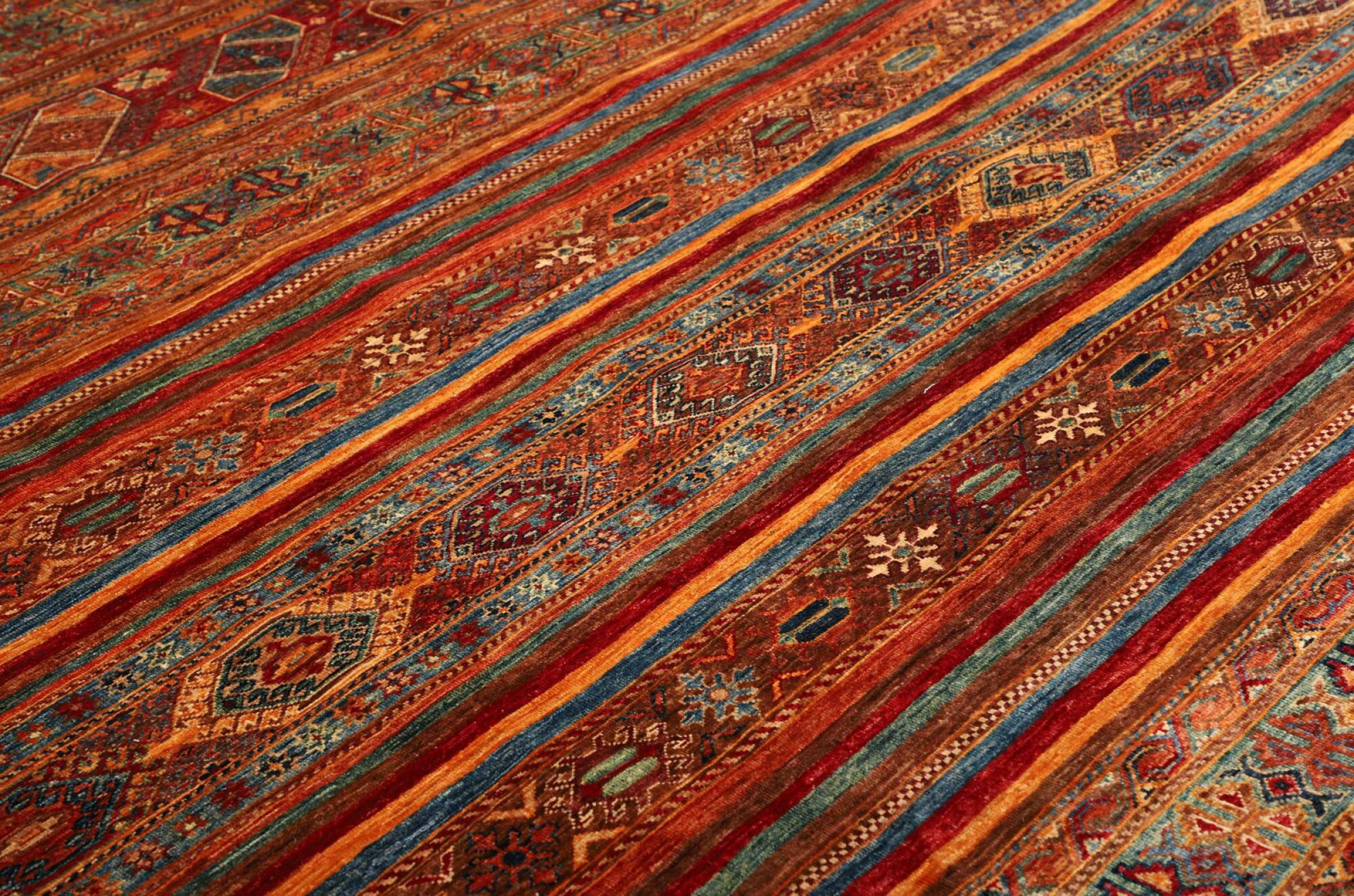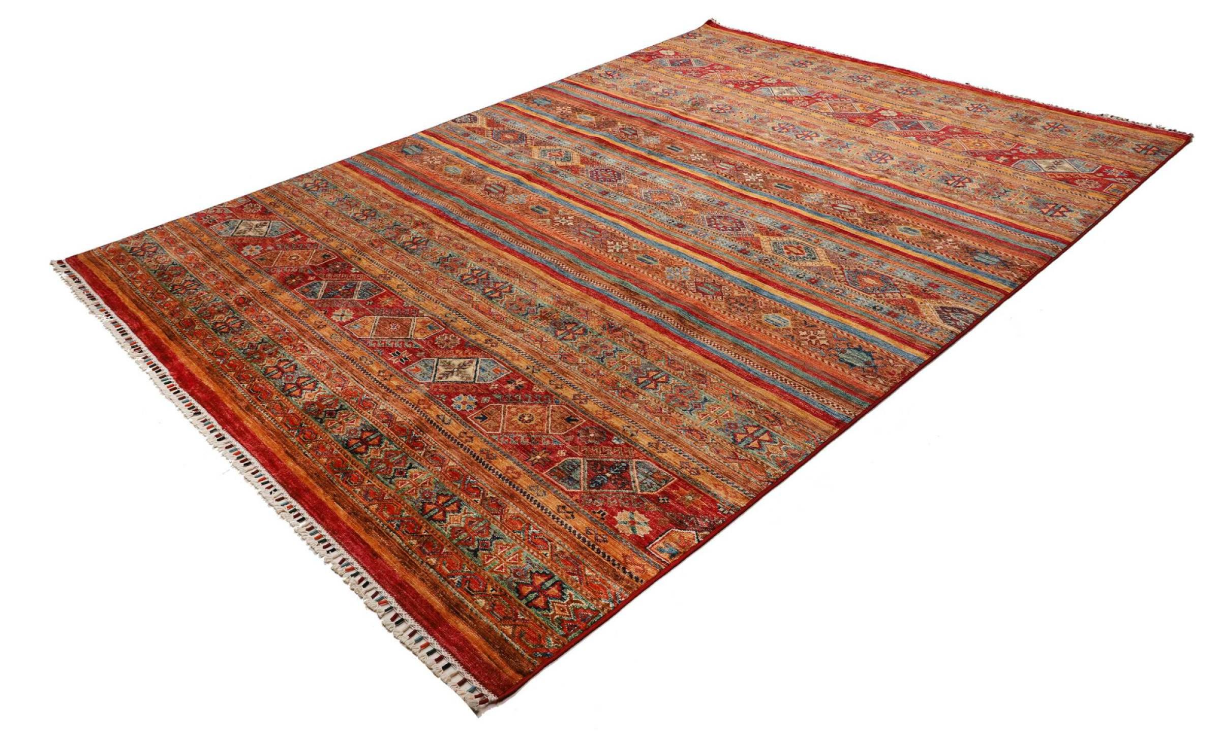 This Arijana Shaal carpet was knotted by hand in Pakistan. It promises a very high quality and thus offers long lasting pleasure. The pattern in stripes is varied and exciting. It was inspired by the well-known Moharamati design. If you find monochrome carpets too boring, you will certainly be delighted with this Arijana Shaal.