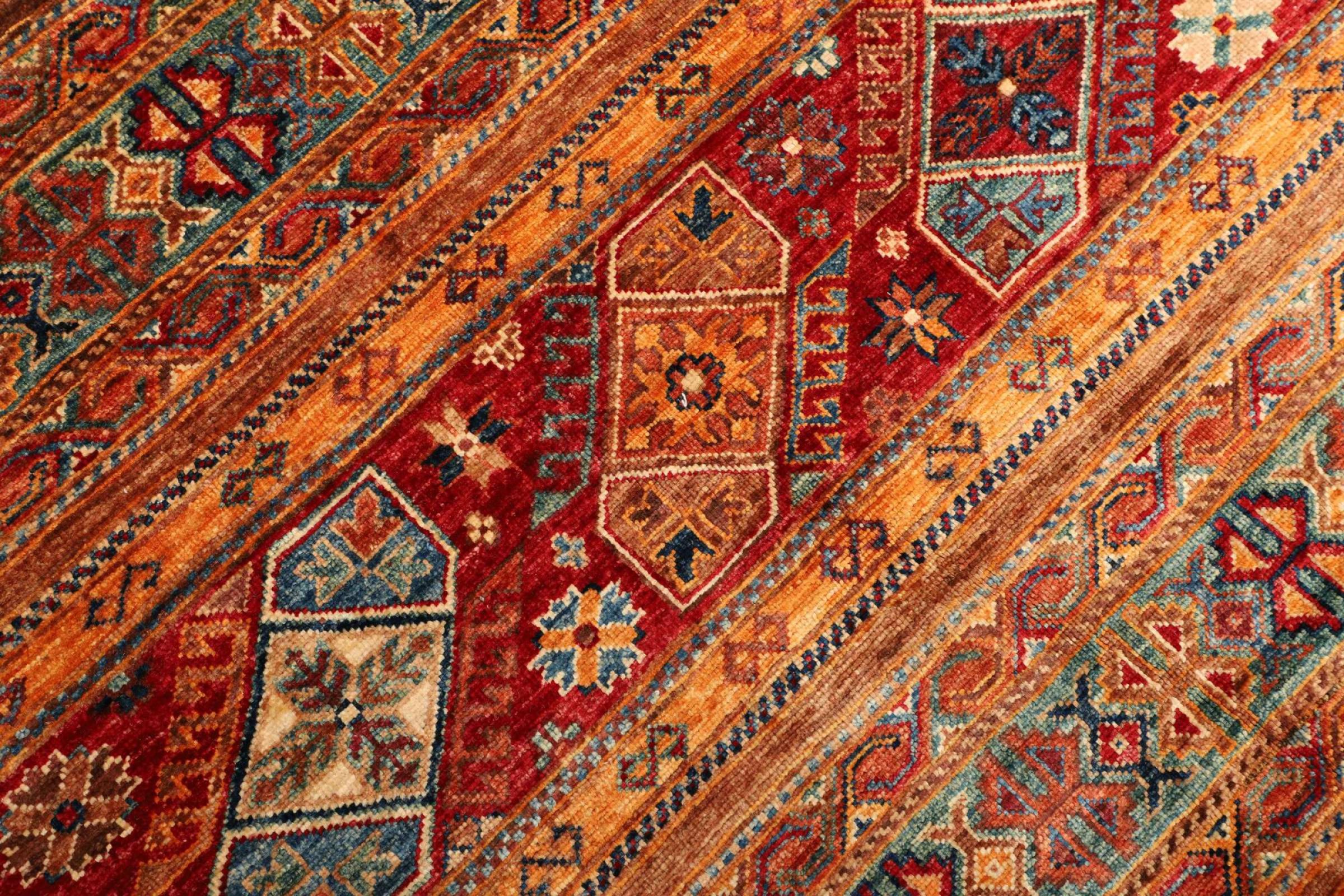 A large part of Pakistani rug production takes place in and around the cities of Lahore and Karachi. Many of the rug knotters of that time fled to Pakistan during the war with India and settled there. Today, especially hand-knotted Pakistan Bukhara rugs are well-known. Similar to the Afghan oriental rugs, Pakistani rugs are also made in dark colours and mostly have shades of red. Even the well-known elephant foot pattern (repeating octagonal pattern) can be found on a Pakistani.