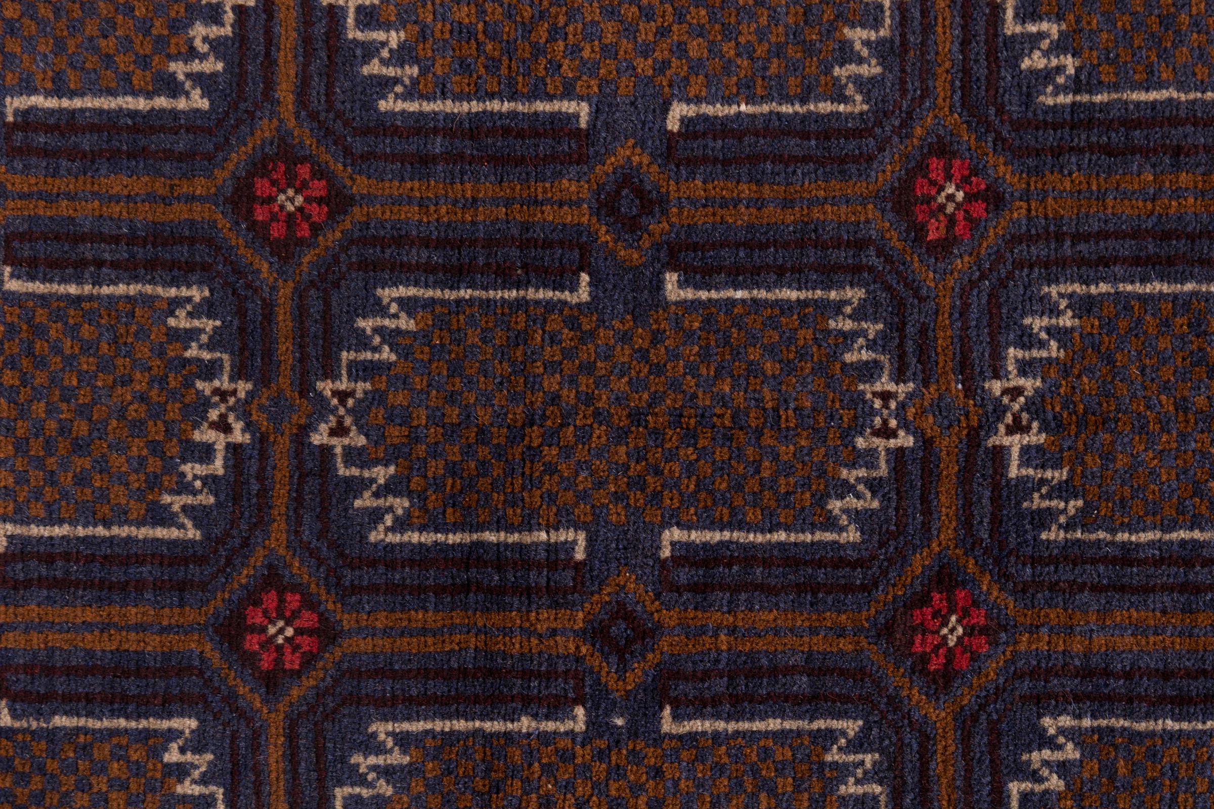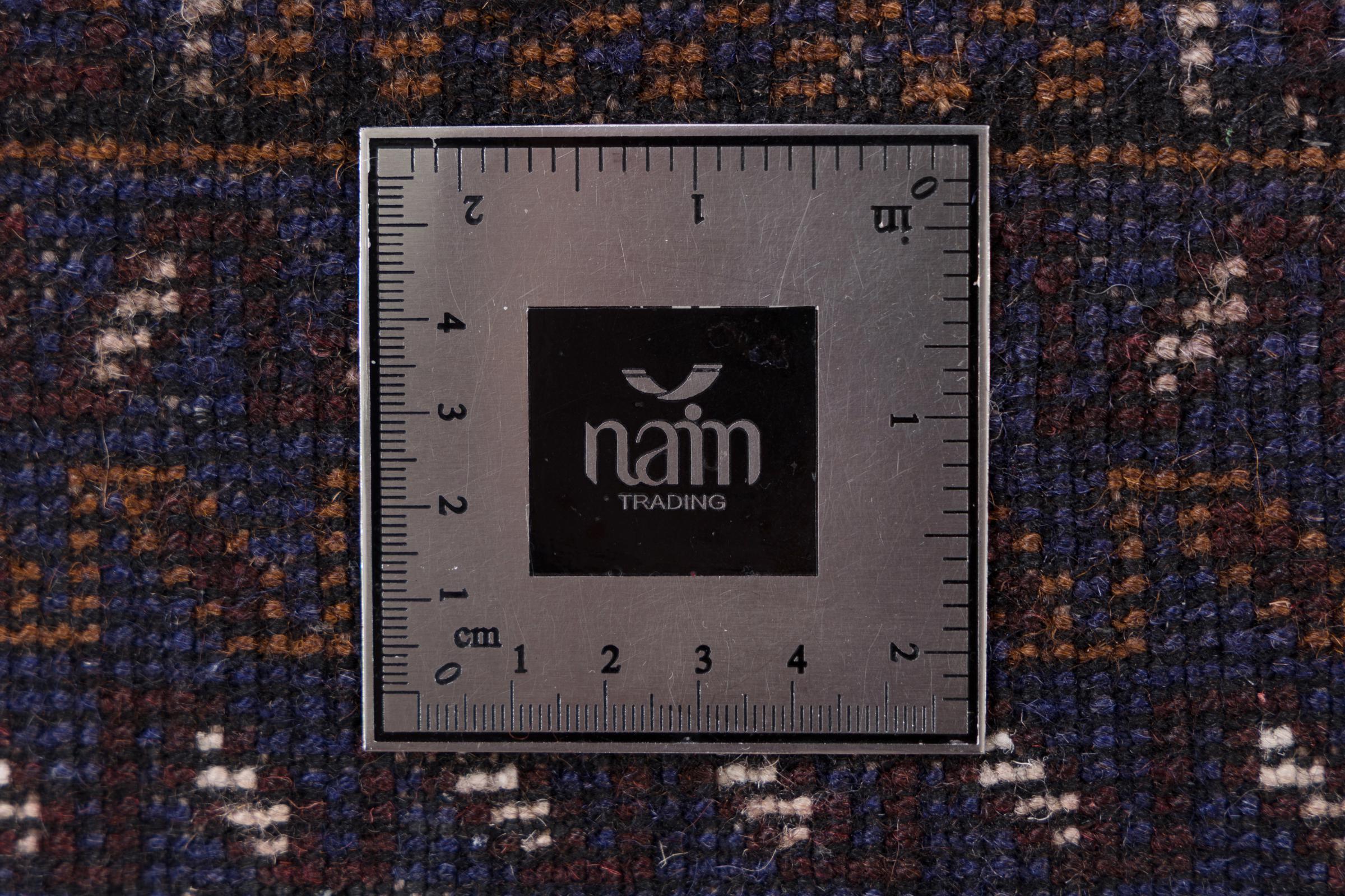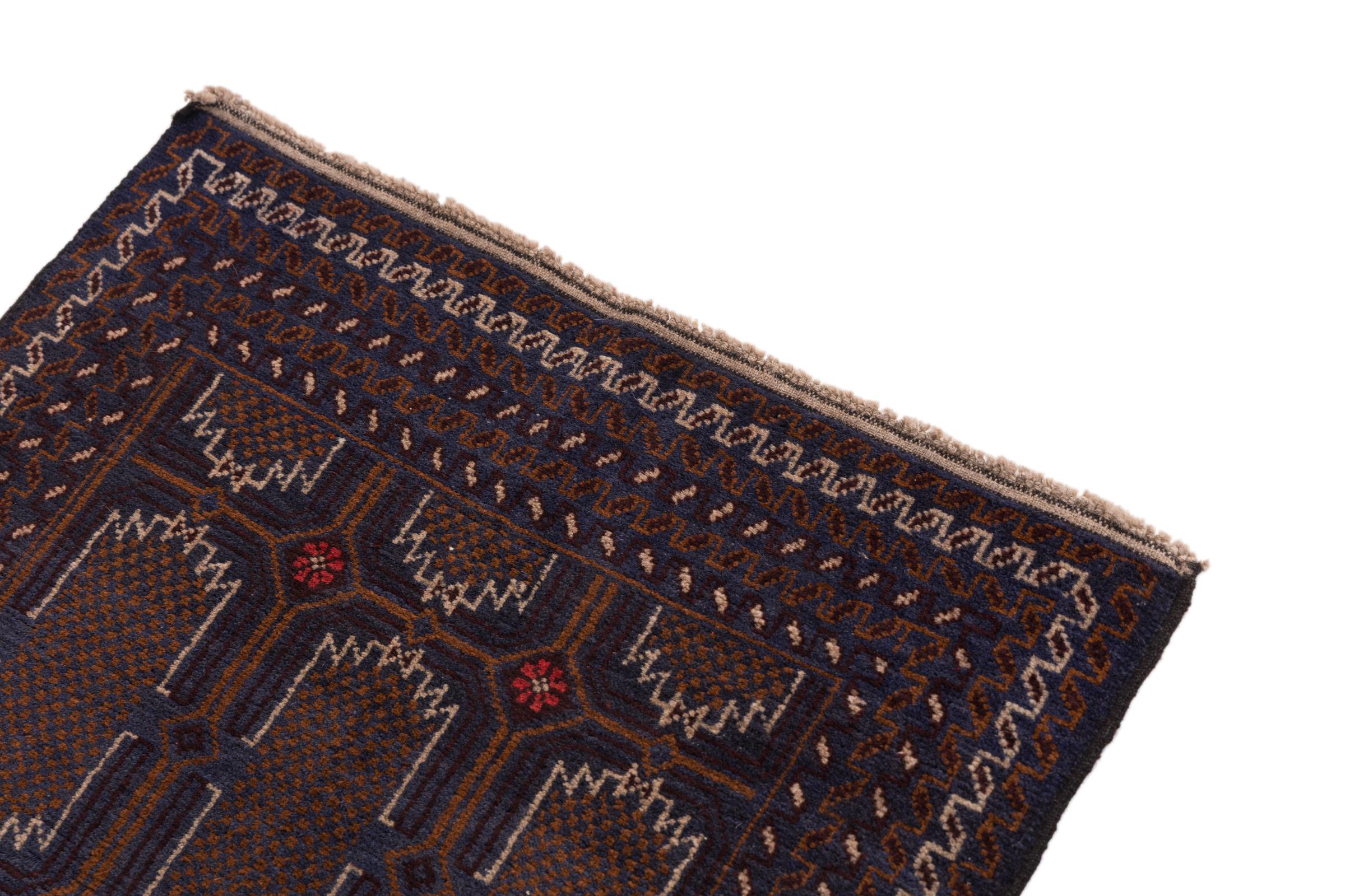This Baluch carpet is a wonderful example of true nomadic art. The Persian carpet, made in the Iranian-Afghan border region, is convincing thanks to its dense, asymmetrical knotting. Lively patterns make it a real feast for the eyes. Typical are rather dark shades that spread a pleasant warmth. Its beautiful natural yarn conveys quality and makes it extremely durable. Typical for this carpet are the straight-lined patterns that make it an unmistakable nomadic carpet.