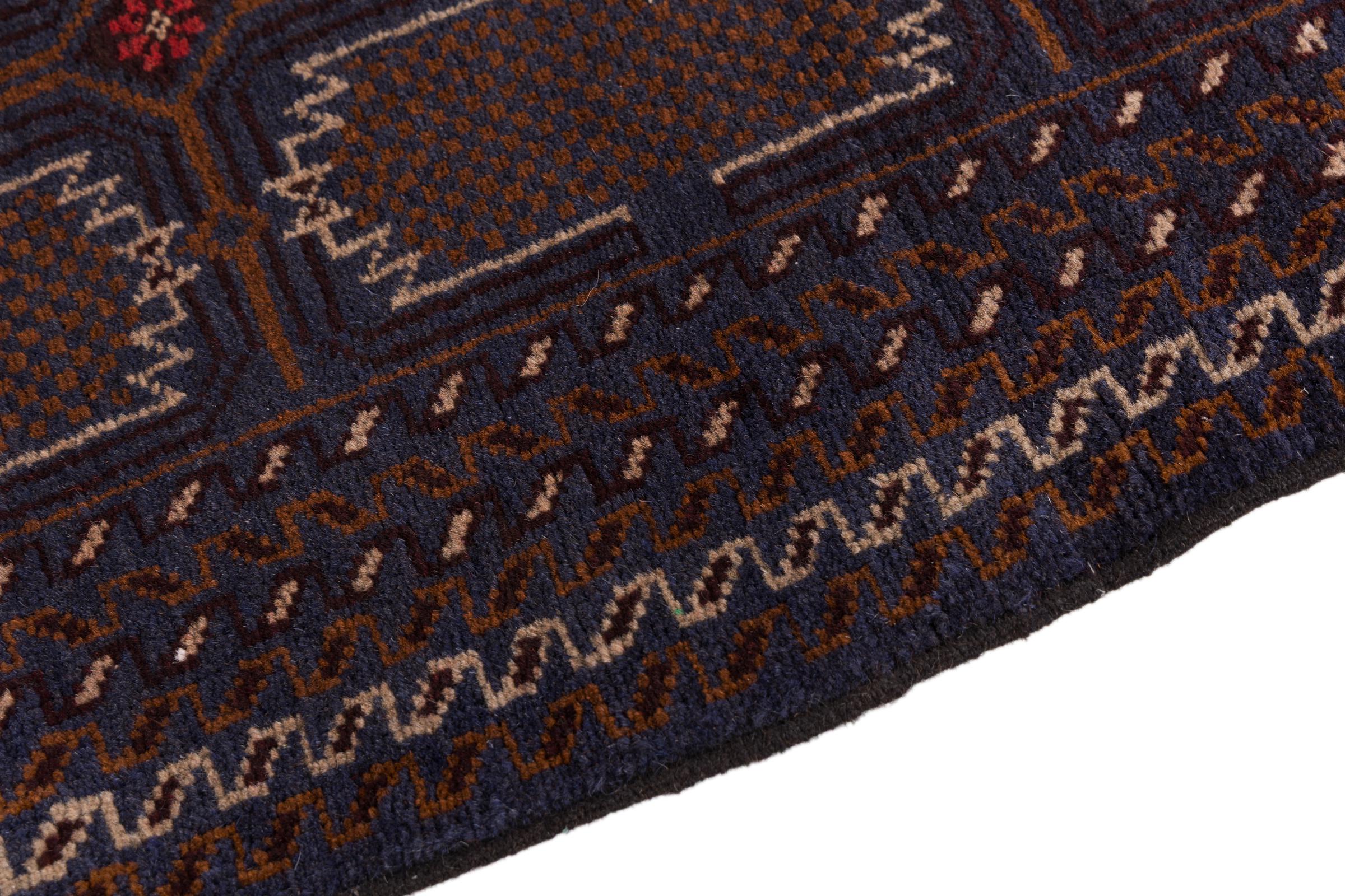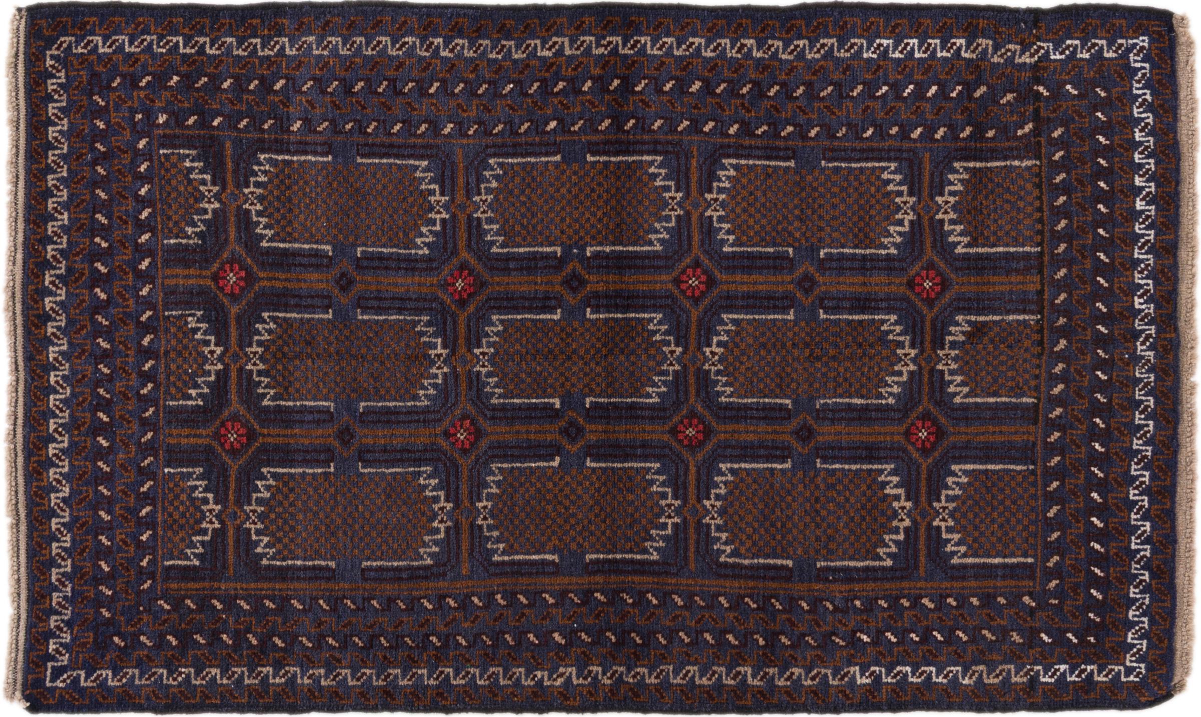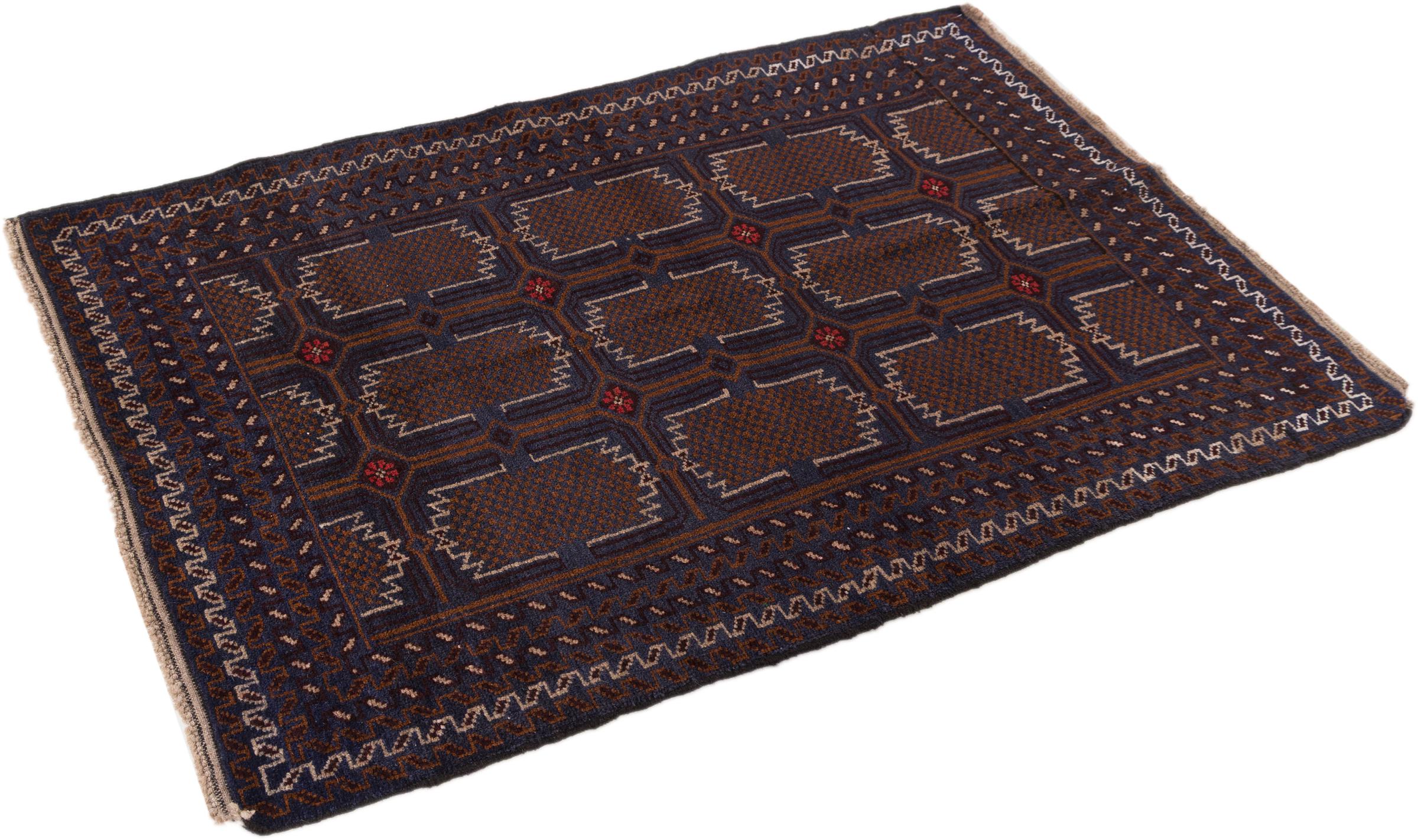 This Baluch carpet is a wonderful example of true nomadic art. The Persian carpet, made in the Iranian-Afghan border region, is convincing thanks to its dense, asymmetrical knotting. Lively patterns make it a real feast for the eyes. Typical are rather dark shades that spread a pleasant warmth. Its beautiful natural yarn conveys quality and makes it extremely durable. Typical for this carpet are the straight-lined patterns that make it an unmistakable nomadic carpet.