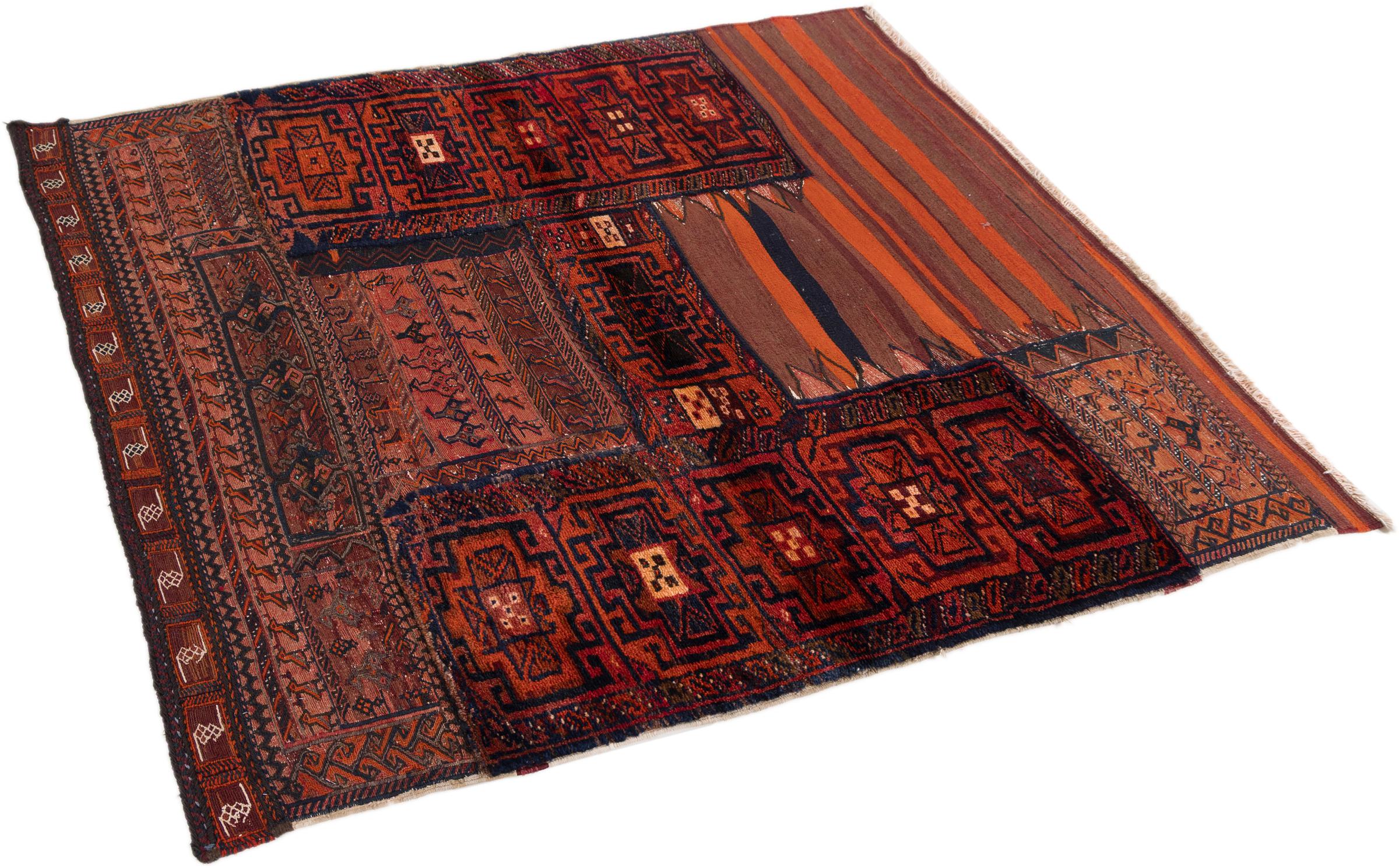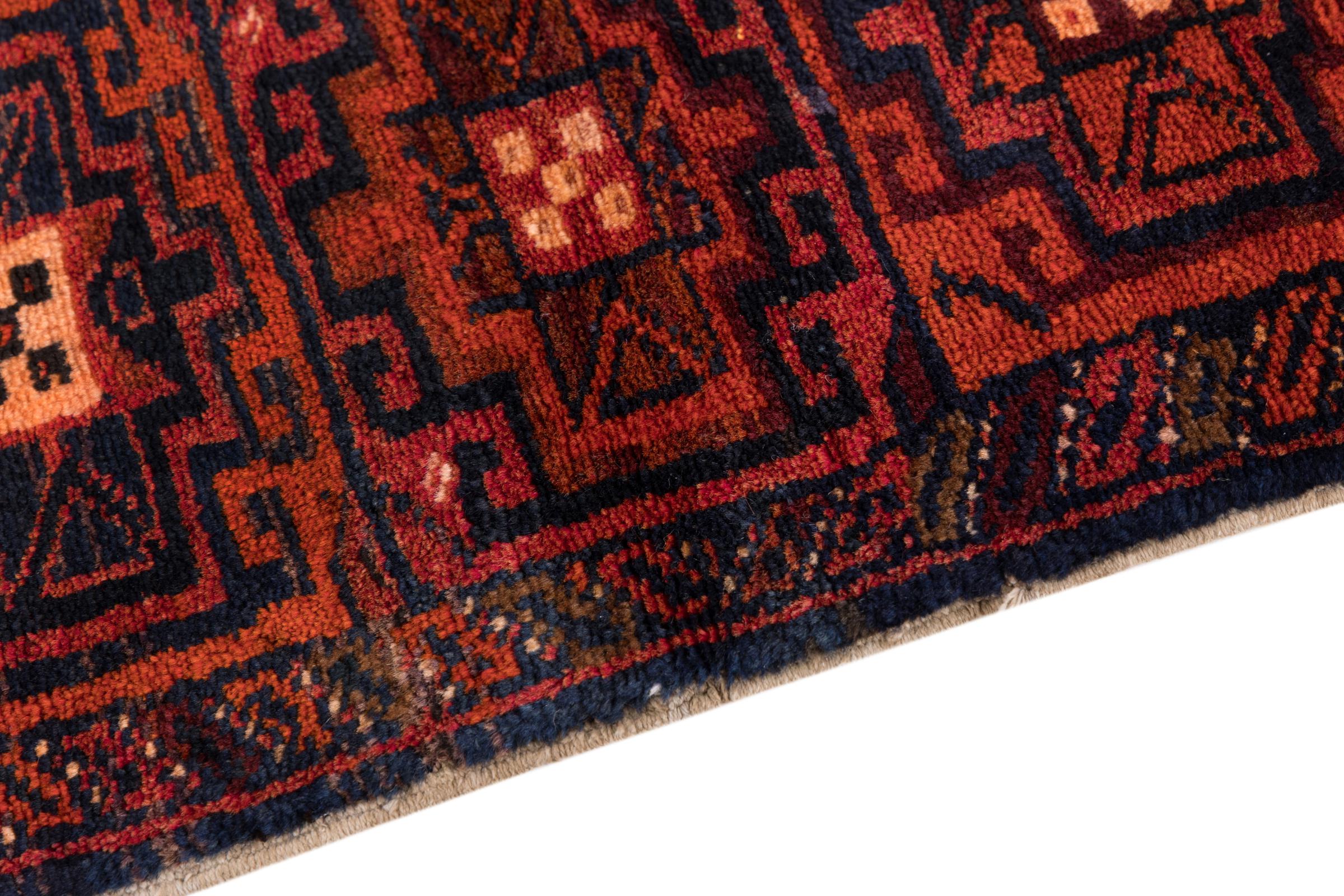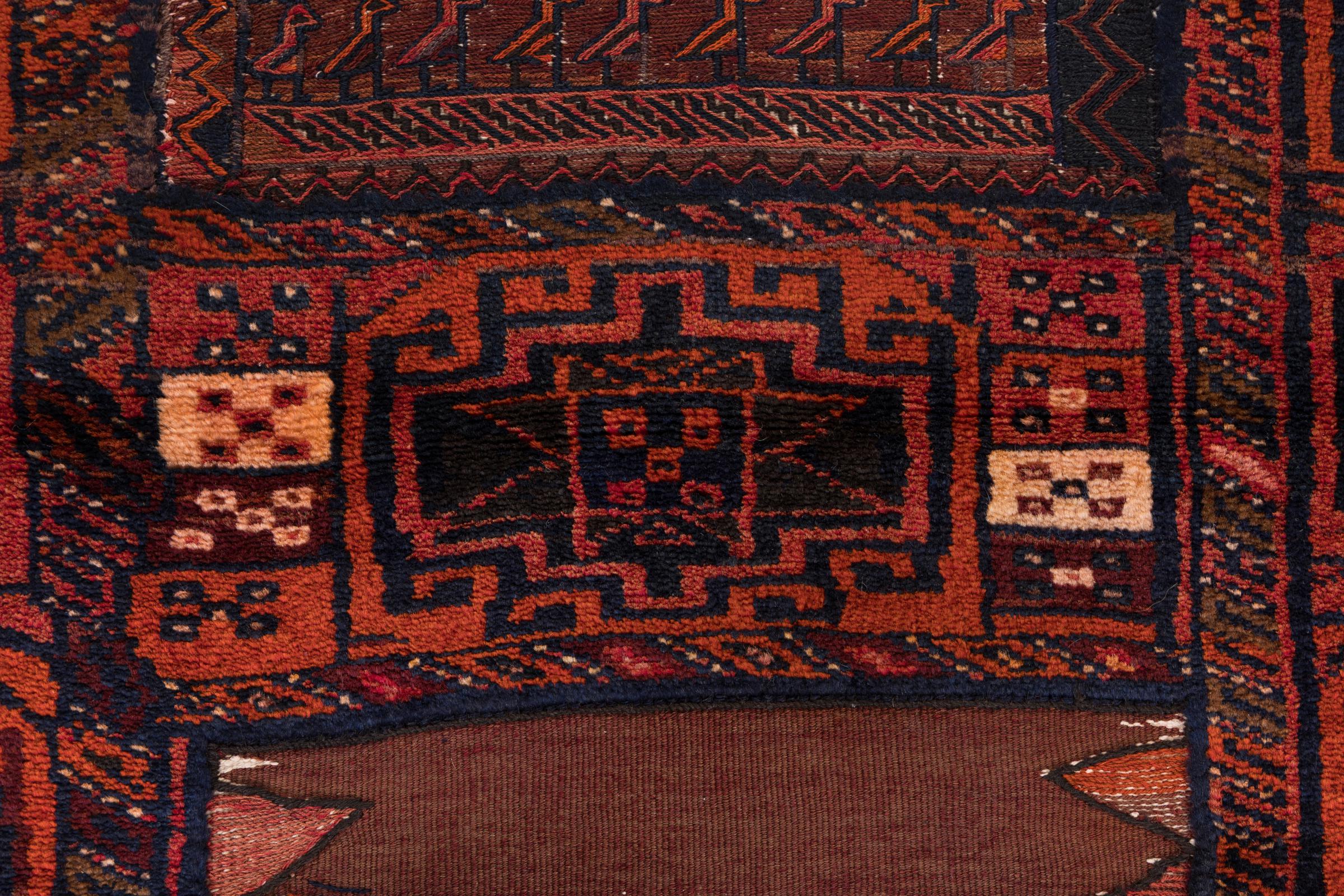 This Baluch carpet is a wonderful example of true nomadic art. The Persian carpet, made in the Iranian-Afghan border region, is convincing thanks to its dense, asymmetrical knotting. Lively patterns make it a real feast for the eyes. Typical are rather dark shades that spread a pleasant warmth. Its beautiful natural yarn conveys quality and makes it extremely durable. Typical for this carpet are the straight-lined patterns that make it an unmistakable nomadic carpet.