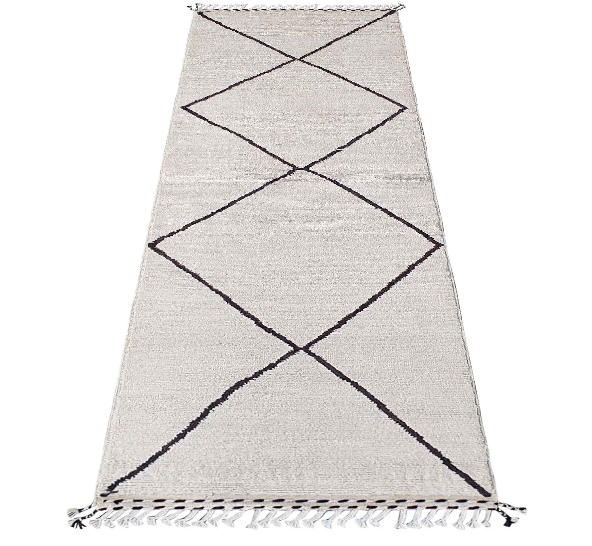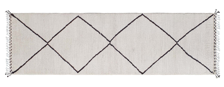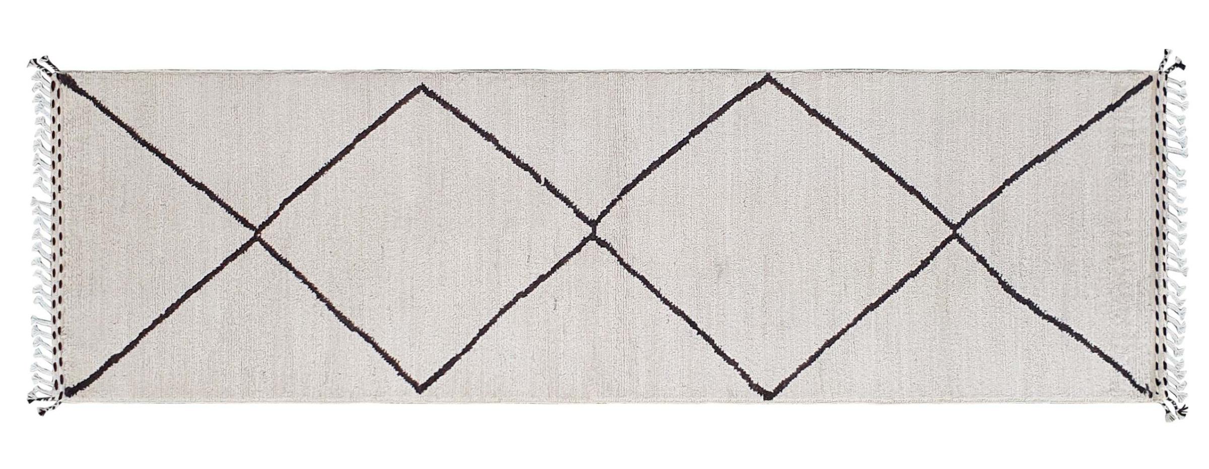 Carpet ID: 300087003021727 Size: 303x92 cm Thickness: ap. 25 mm Knot density: 96 000 - 120 000 / m² Manufacturing: Knotted by hand Pile: Handspun wool Warp: Cotton Origin: Afghanistan Age: New Weight: ap. 11 kg Also know as Beni Ourain, Beni Ouarain, Boucherouite In stock: Unique - Only 1 in stock