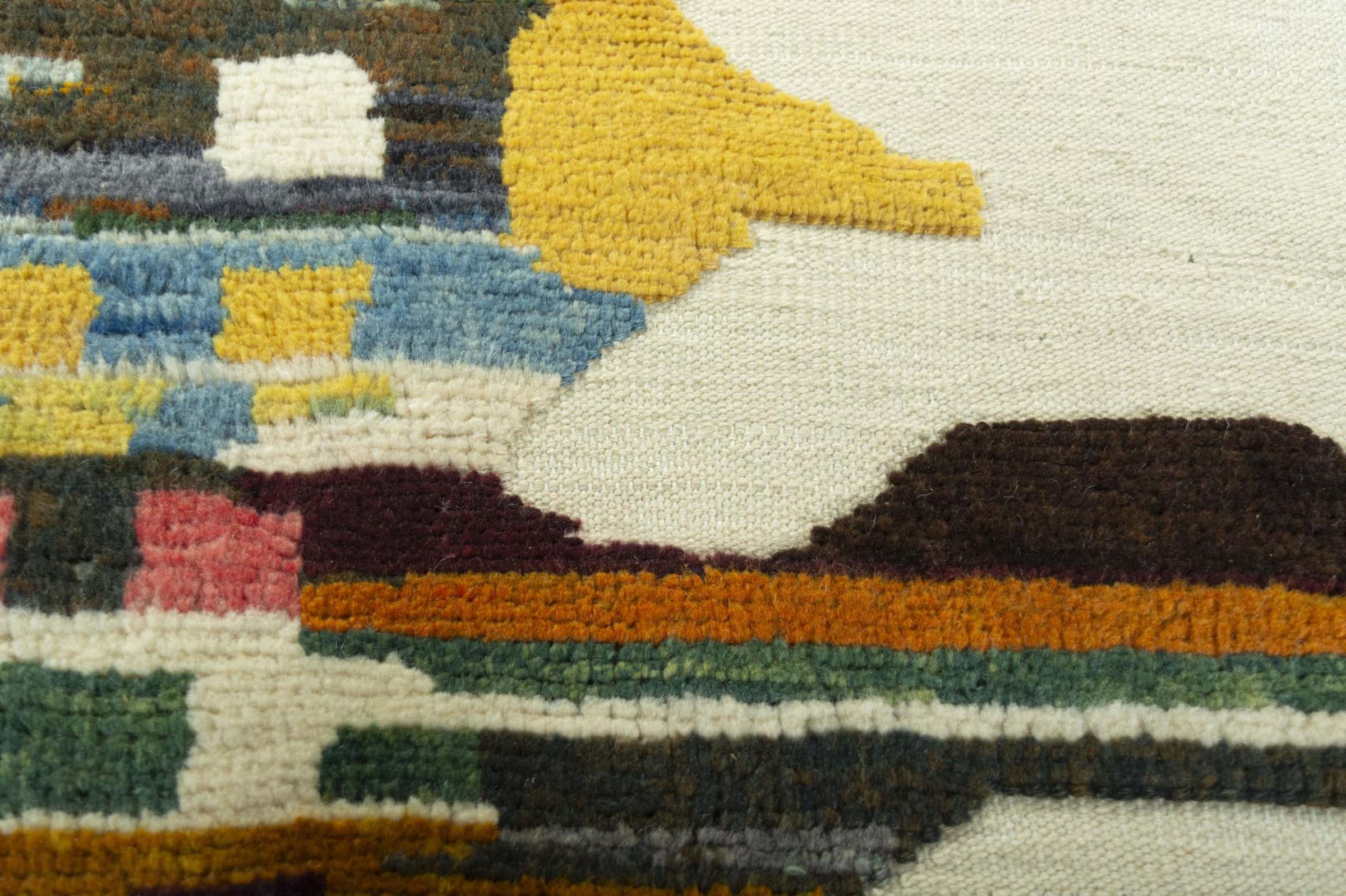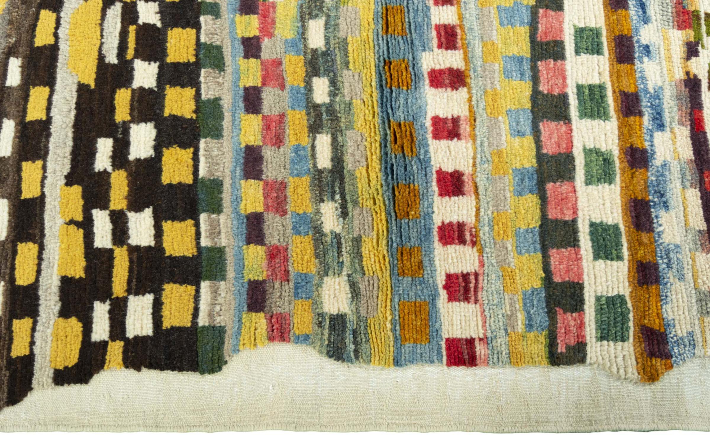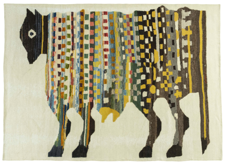 This rug was made as a flat weave by hand on a loom. Flatweave is the term used to describe rugs that have no pile. As the name promises, these rugs are woven and not knotted. This results in a flat rug with a structured surface. Flatweaves are not as soft and usually thinner than knotted rugs. At the same time they are much less complex to manufacture and can usually be laid out from both sides (front and back). Their patterns are usually geometric, which is determined by the fabric.