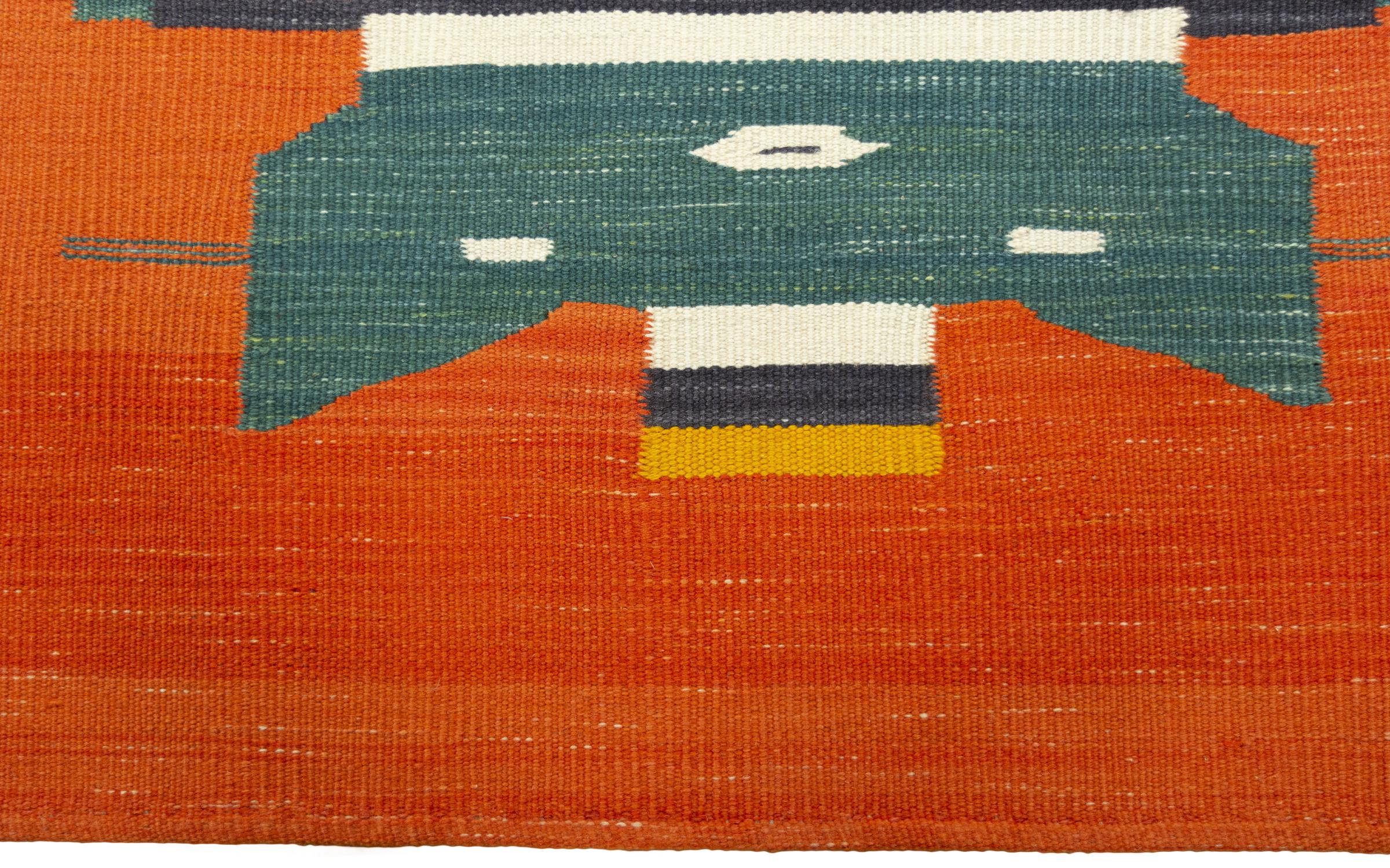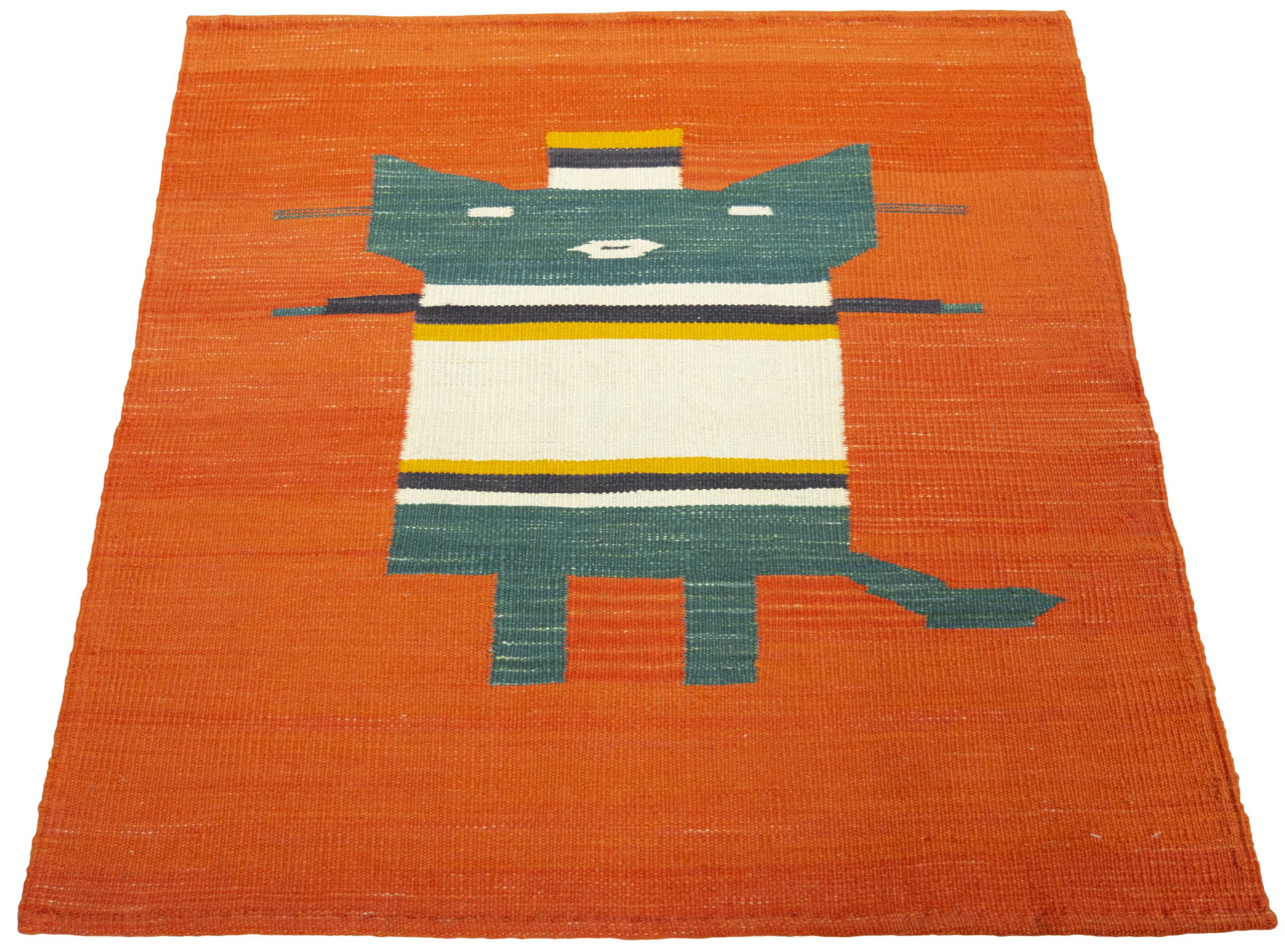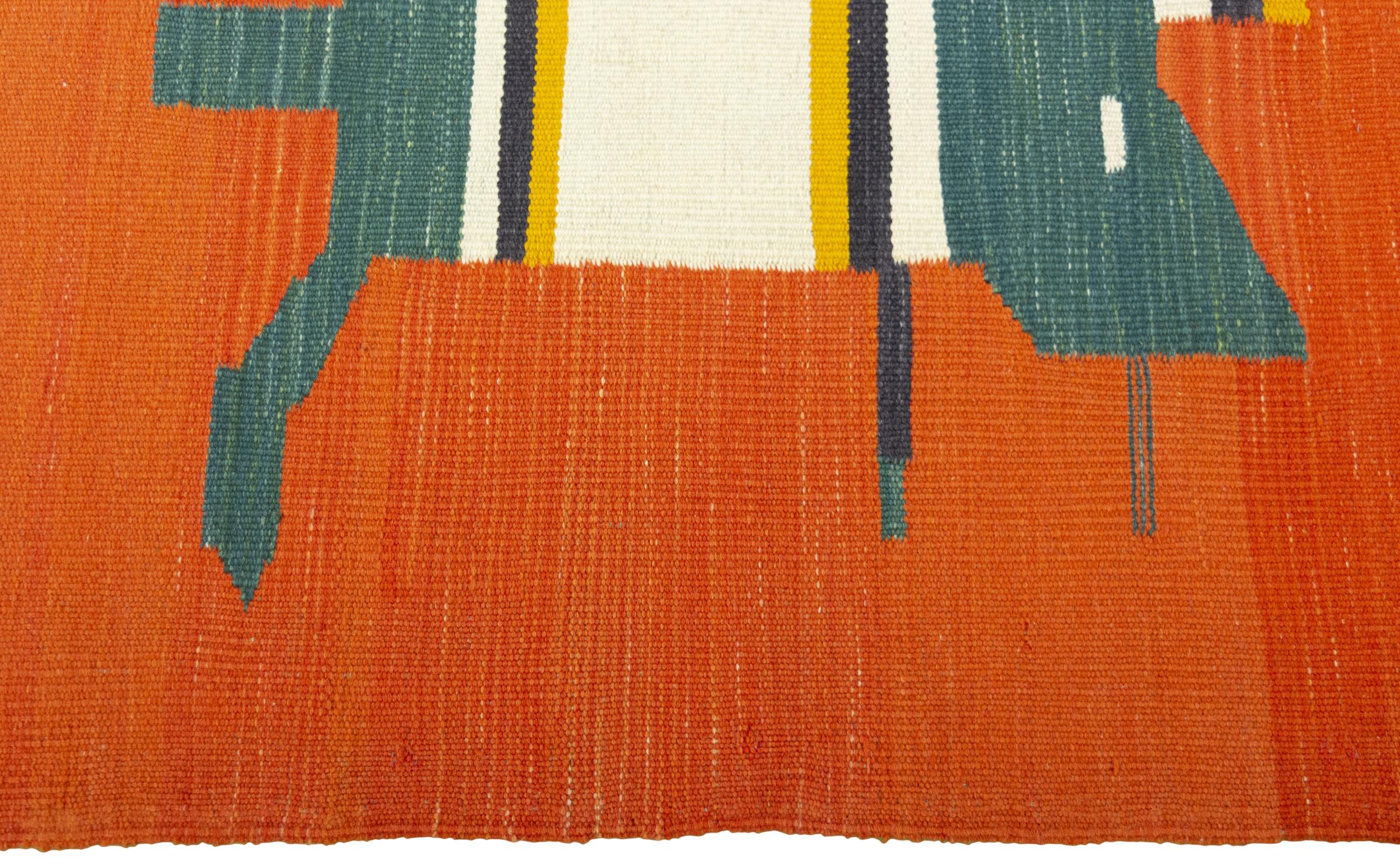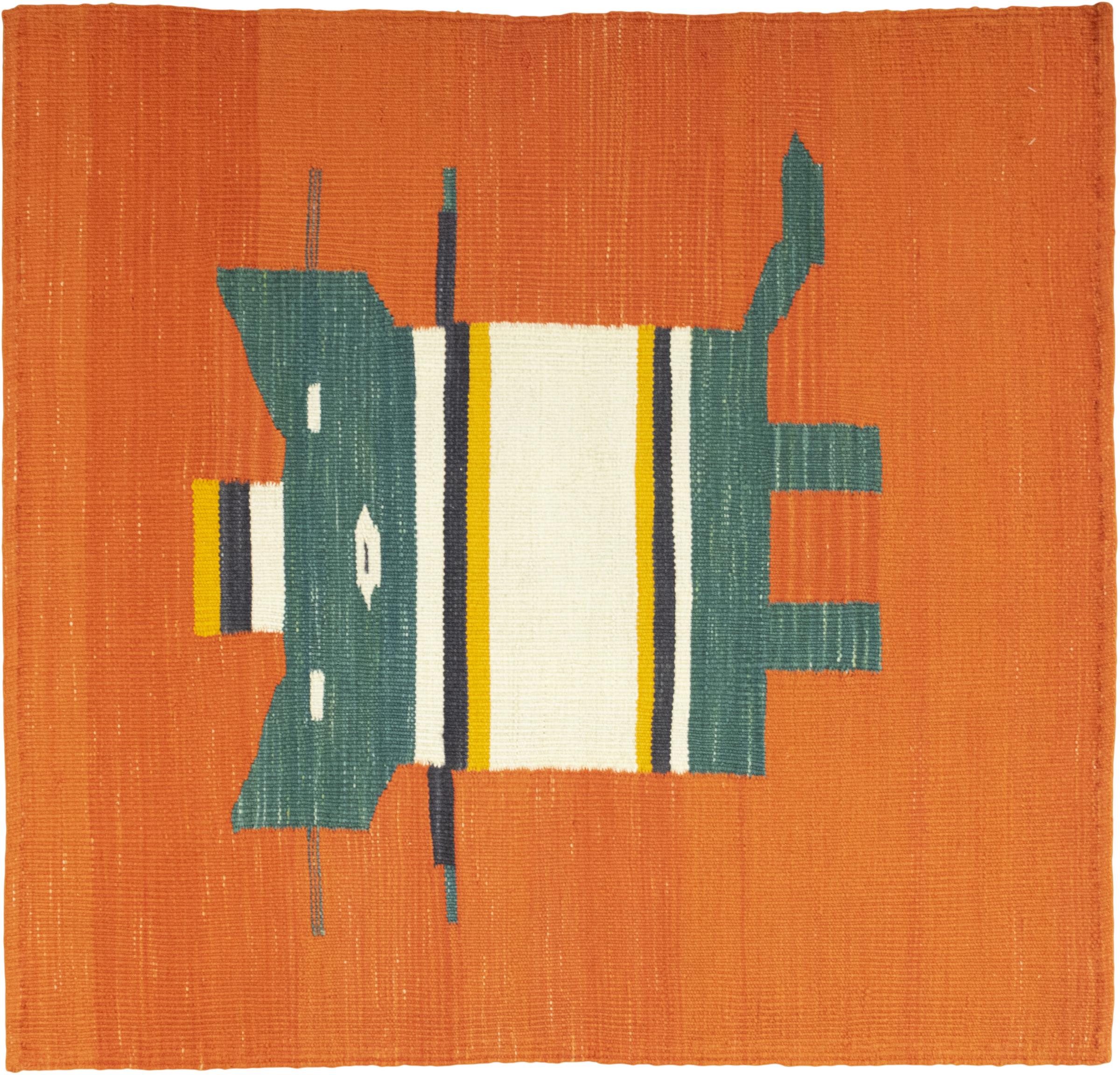This rug was made as a flat weave by hand on a loom. Flatweave is the term used to describe rugs that have no pile. As the name promises, these rugs are woven and not knotted. This results in a flat rug with a structured surface. Flatweaves are not as soft and usually thinner than knotted rugs. At the same time they are much less complex to manufacture and can usually be laid out from both sides (front and back). Their patterns are usually geometric, which is determined by the fabric.