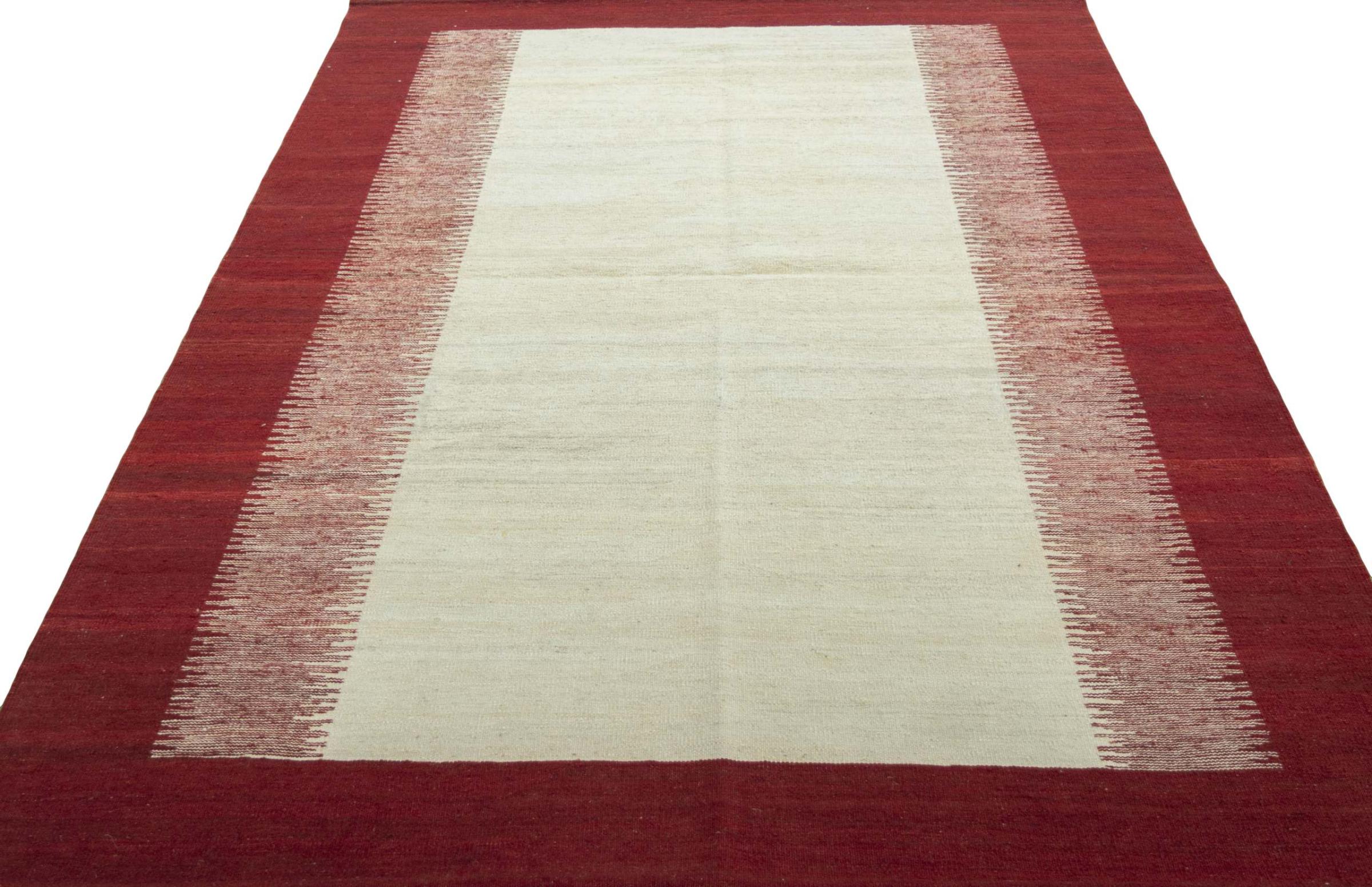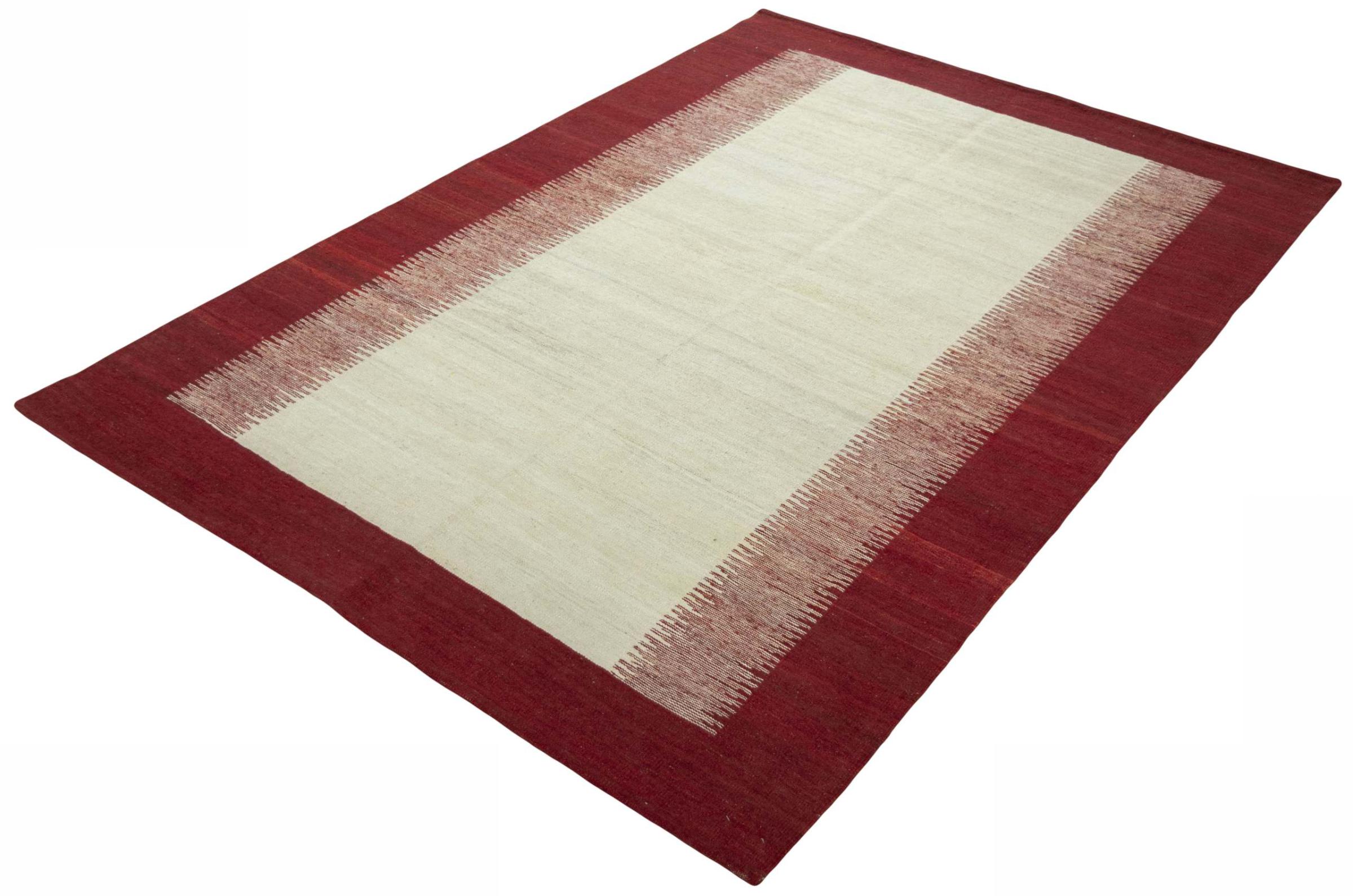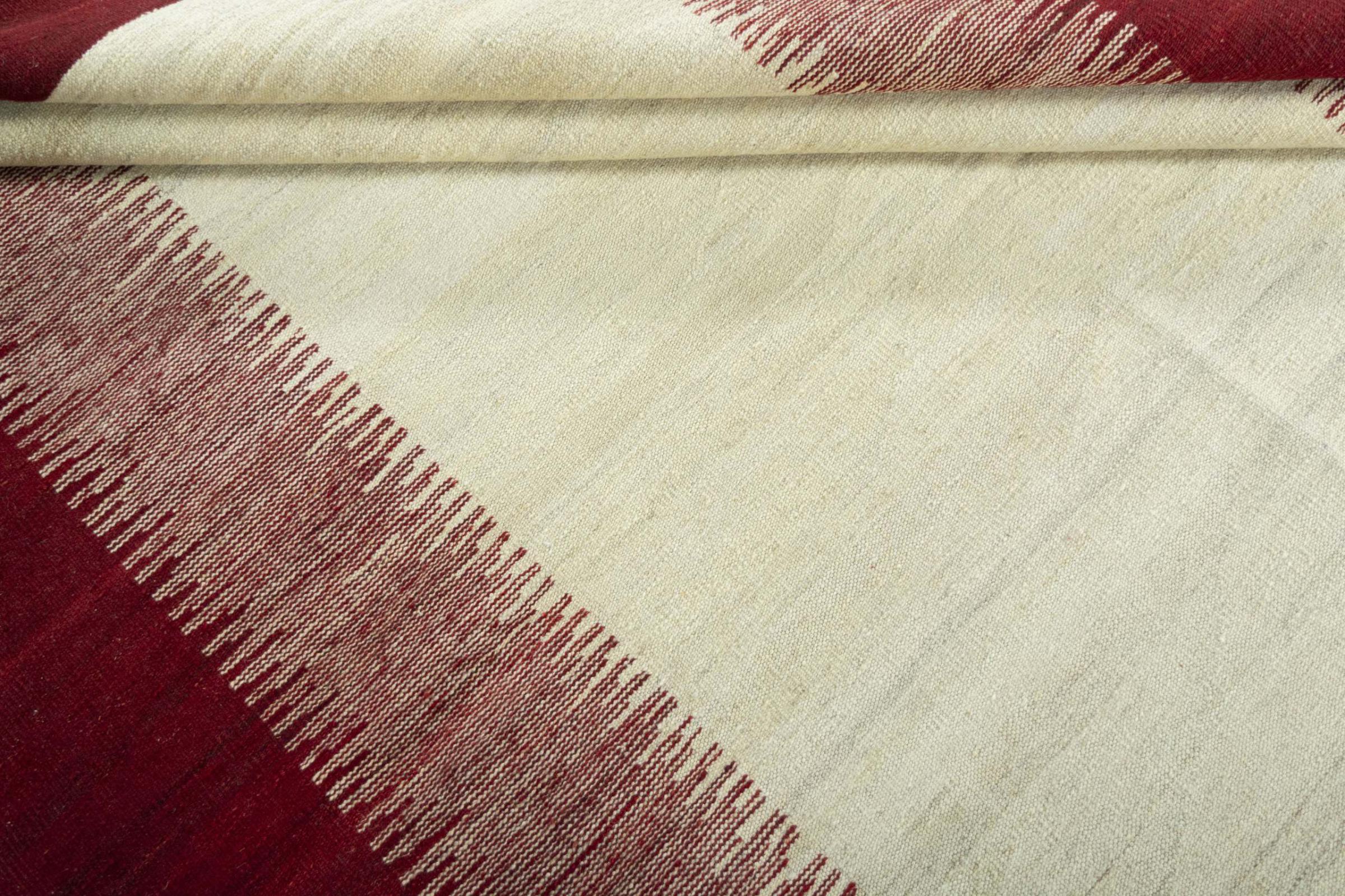 This rug was made as a flat weave by hand on a loom. Flatweave is the term used to describe rugs that have no pile. As the name promises, these rugs are woven and not knotted. This results in a flat rug with a structured surface. Flatweaves are not as soft and usually thinner than knotted rugs. At the same time they are much less complex to manufacture and can usually be laid out from both sides (front and back). Their patterns are usually geometric, which is determined by the fabric.