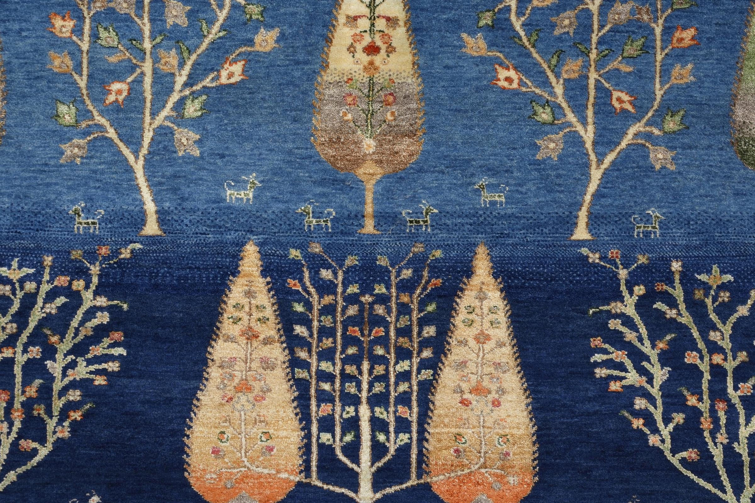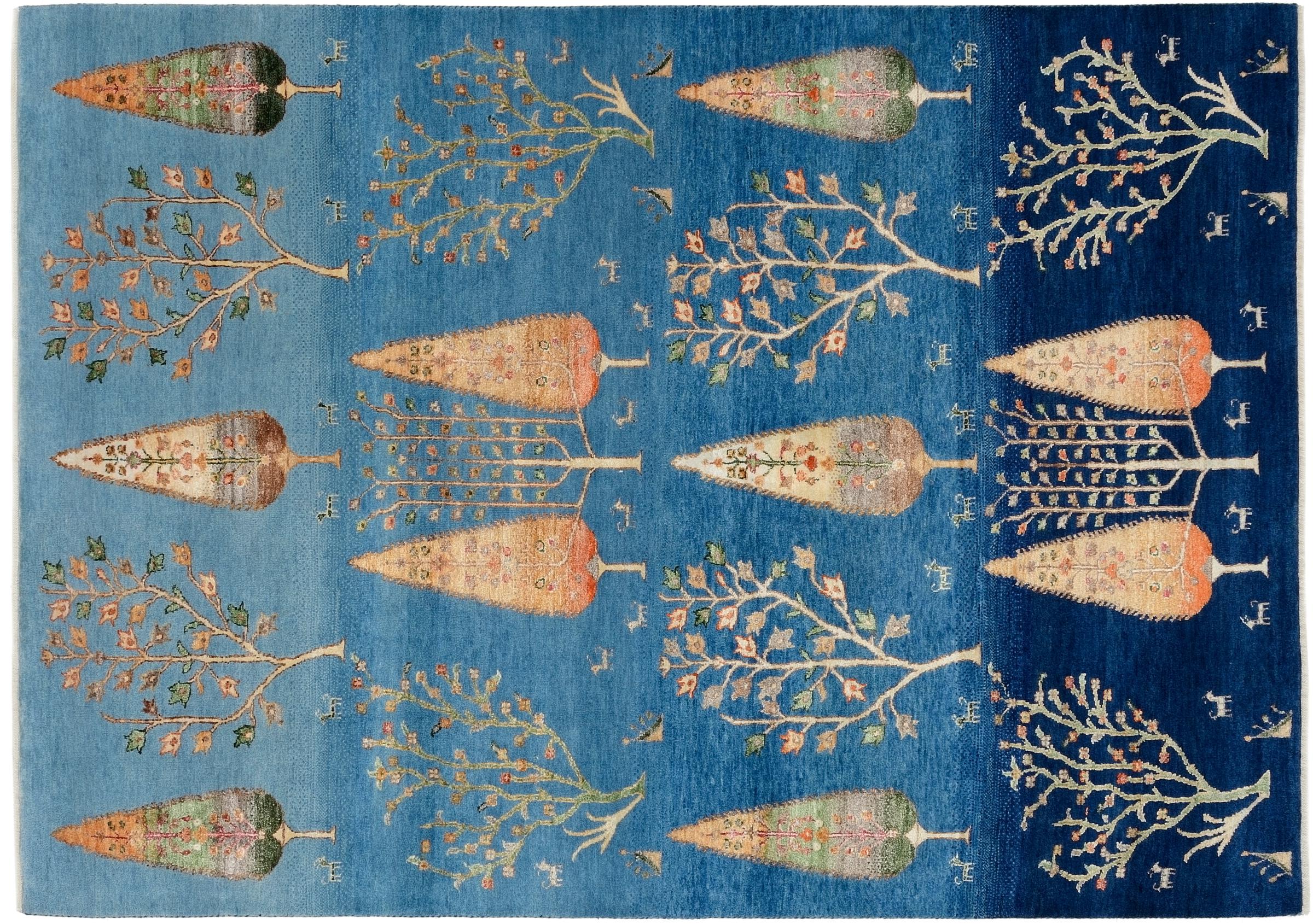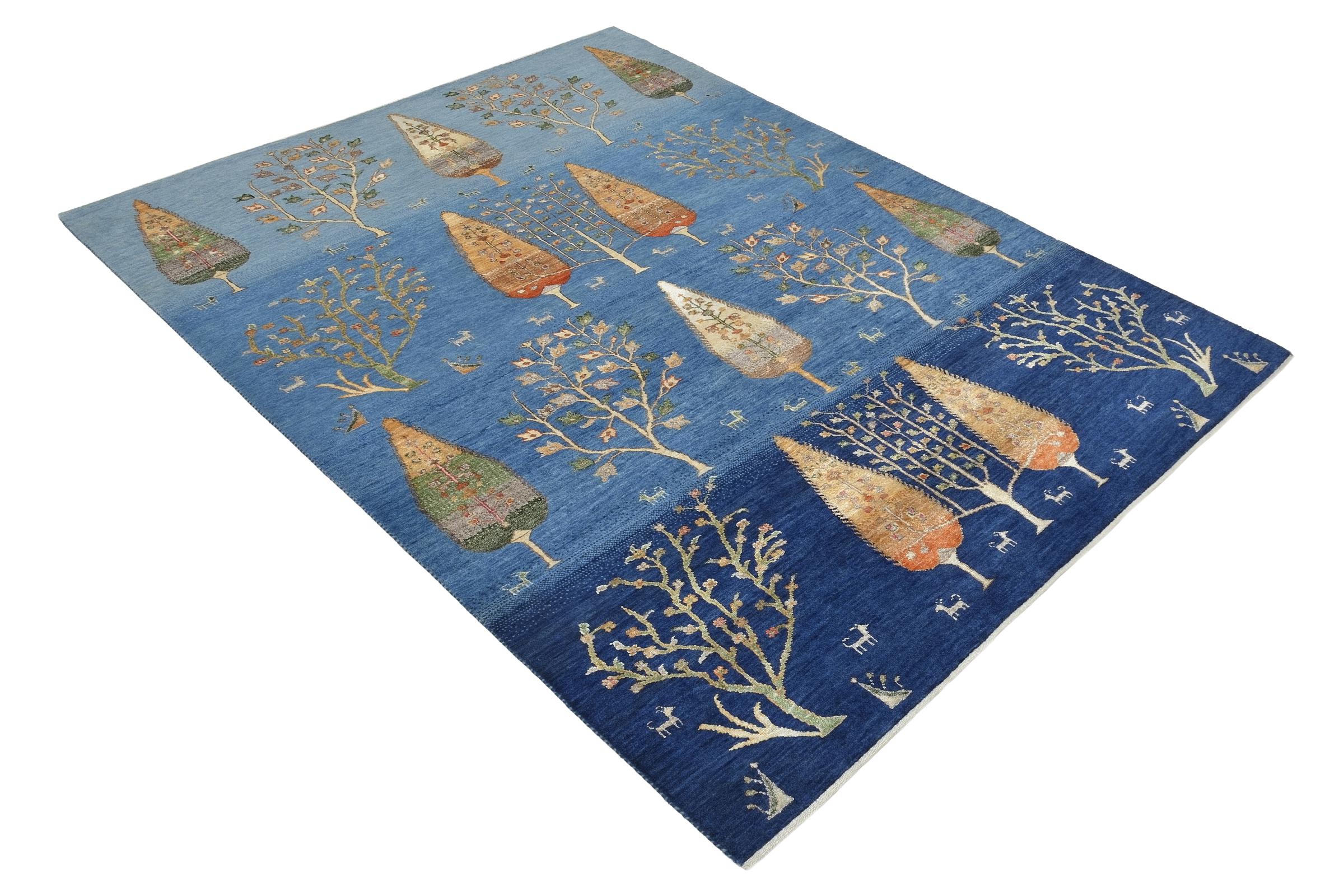 This beautiful rug is a Persian Gabbeh and thus belongs to the highest quality Gabbeh rugs. The rugs are knotted by nomads or semi-nomads in Iran following traditional handicraft. The simple motifs and patterns are mostly inspired by the nomads' close environment. For example camels, trees or bushes can be found on the traditional rugs. Persian Gabbeh rugs are made of wool from locally raised flocks of sheep. The wool is therefore mostly still spun by hand. Thus each of these oriental rugs embodies a unique character of centuries-old culture.