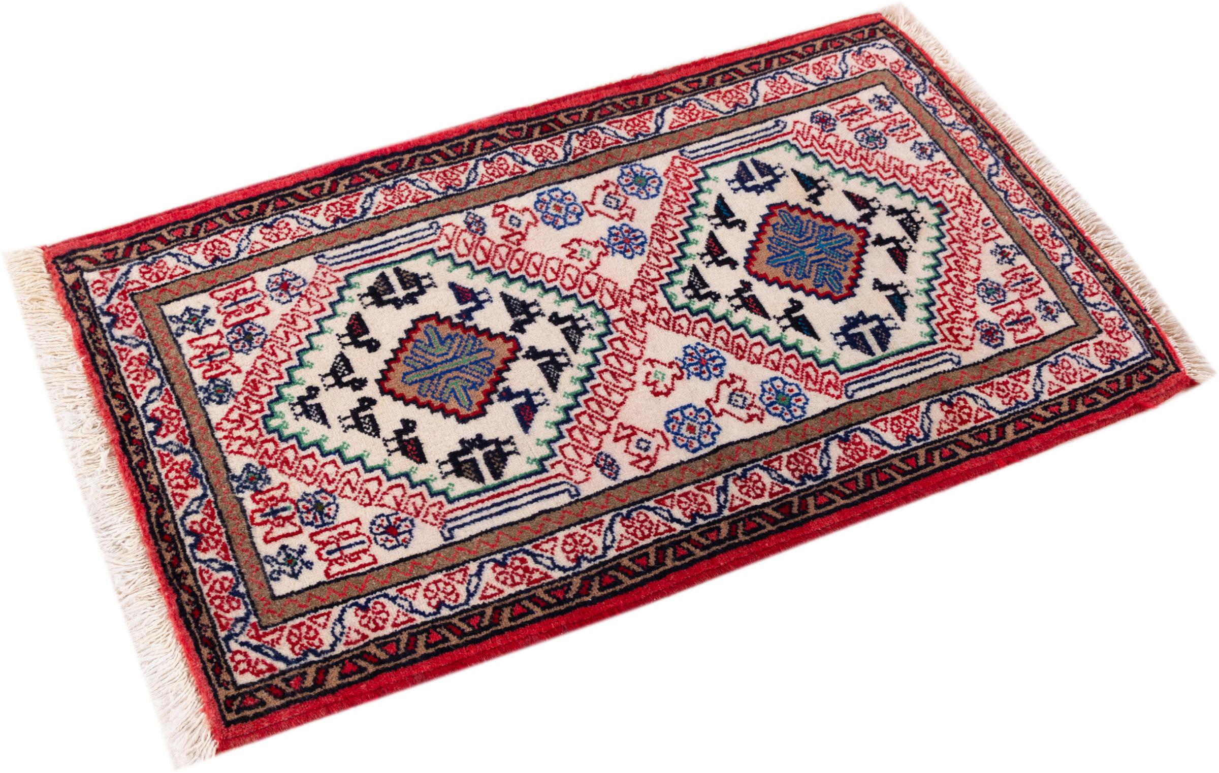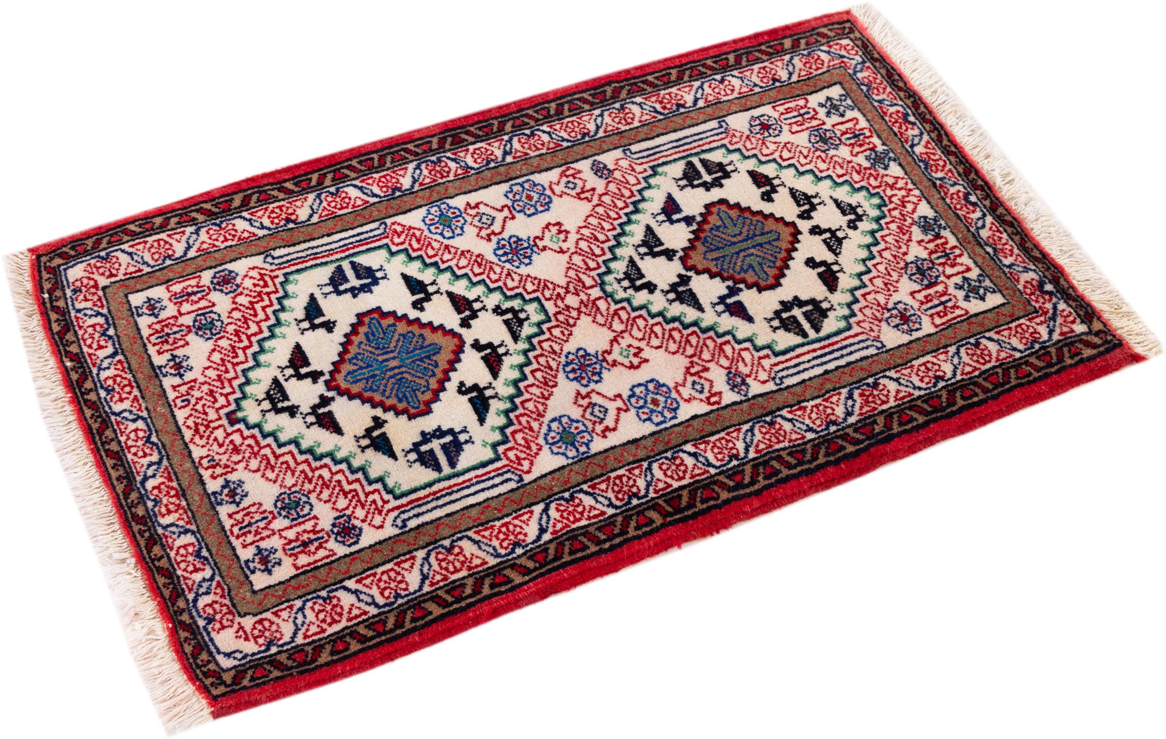 Carpet ID: 30711400105617 Size: 106x60 cm Thickness: ap. 8 mm Knot density: 200 000 - 250 000 / m² Manufacturing: Knotted by hand Pile: Handspun wool Warp: Cotton Origin: Persia Age: New Weight: ap. 2 kg Also know as Huseinabad In stock: Unique - Only 1 in stock