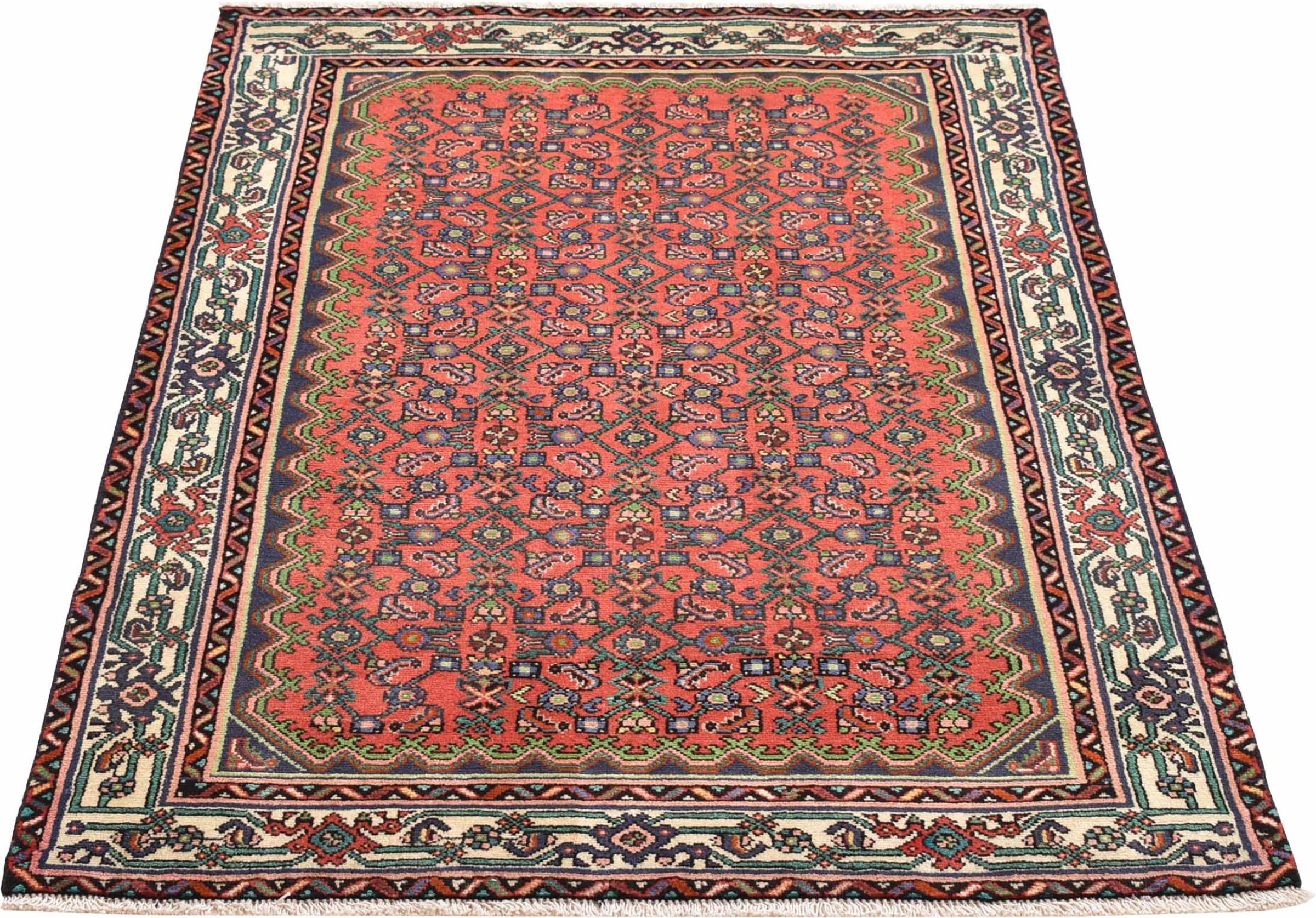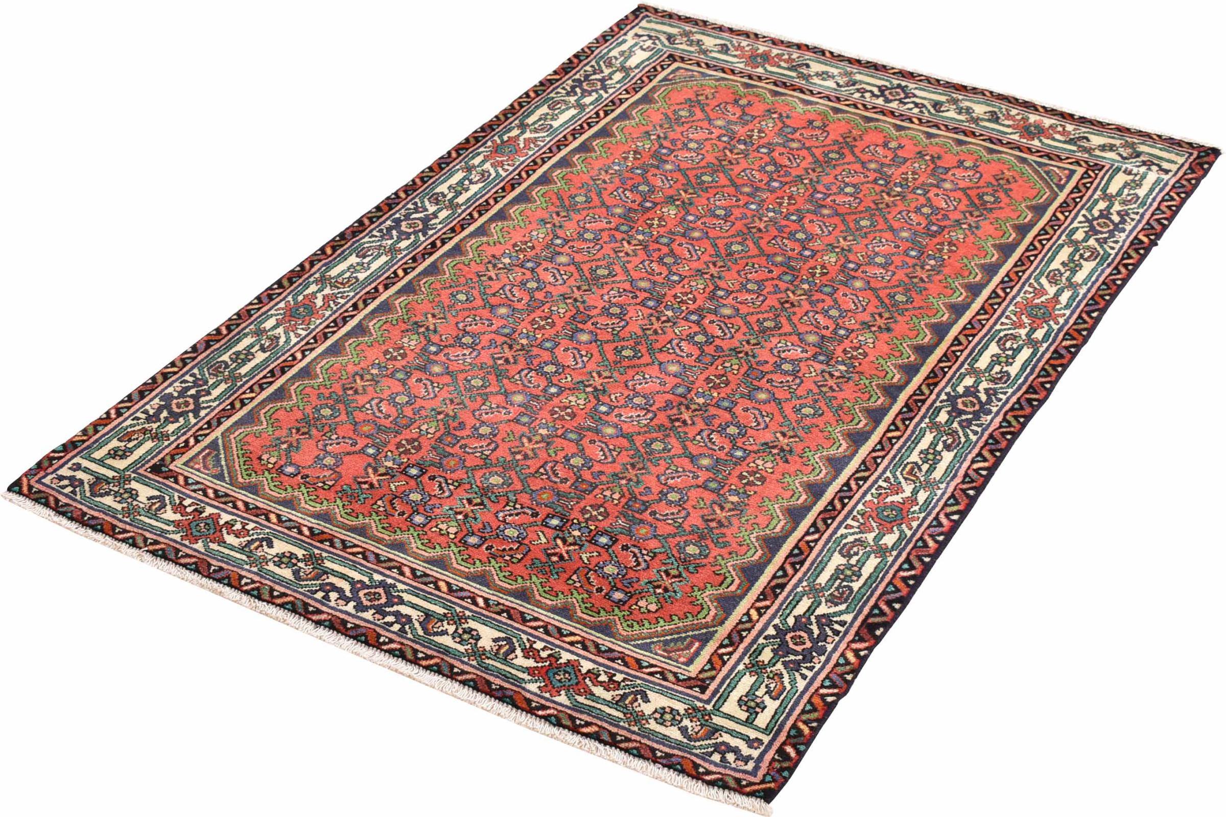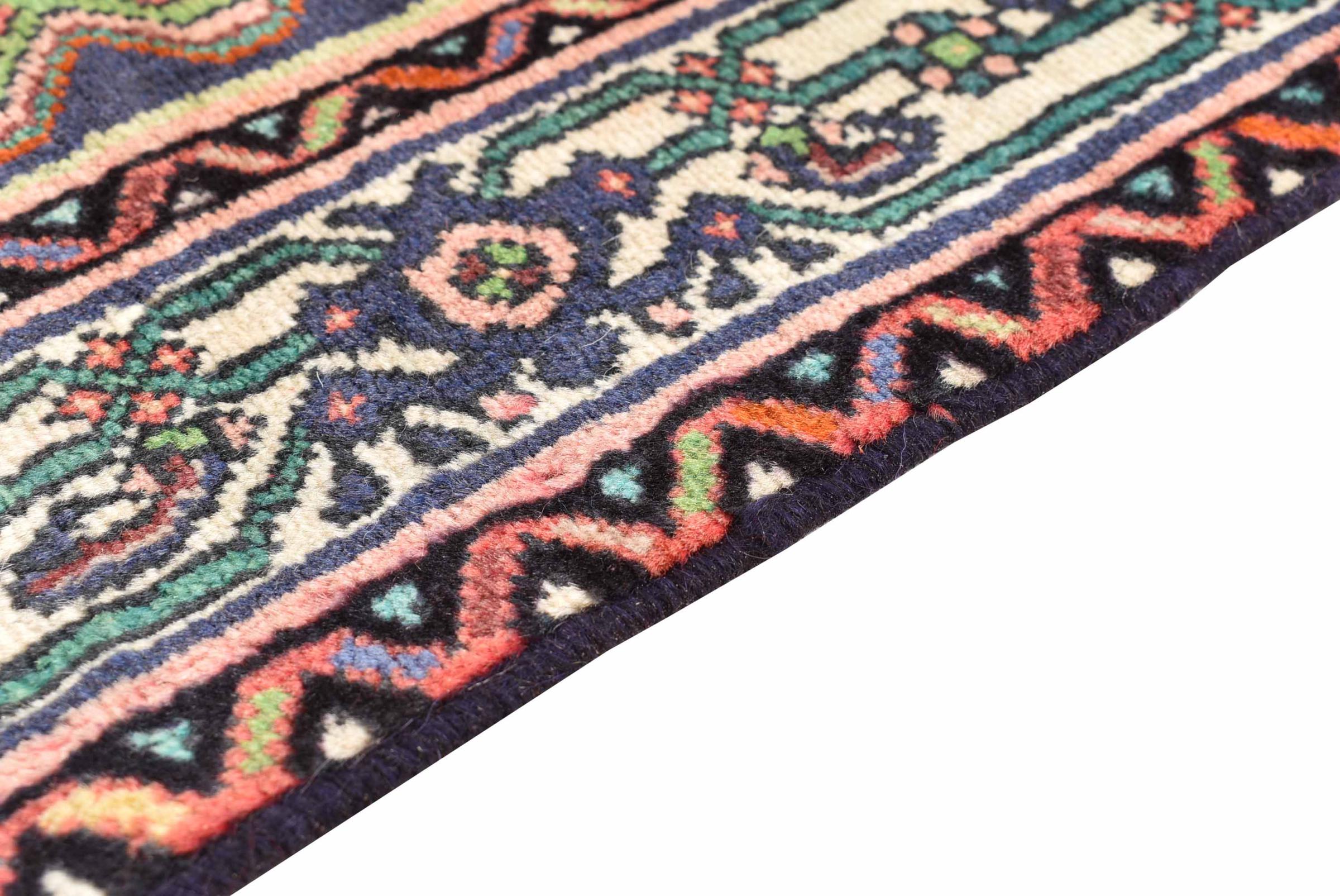Carpet ID: 300975001081569 Size: 146x98 cm Thickness: ap. 8 mm Knot density: 128 000 - 160 000 / m² Manufacturing: Knotted by hand Pile: Handspun wool Warp: Cotton Origin: Persia Age: New Weight: ap. 5 kg Also know as Huseinabad In stock: Unique - Only 1 in stock