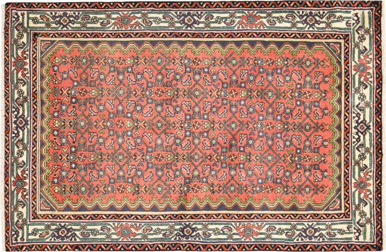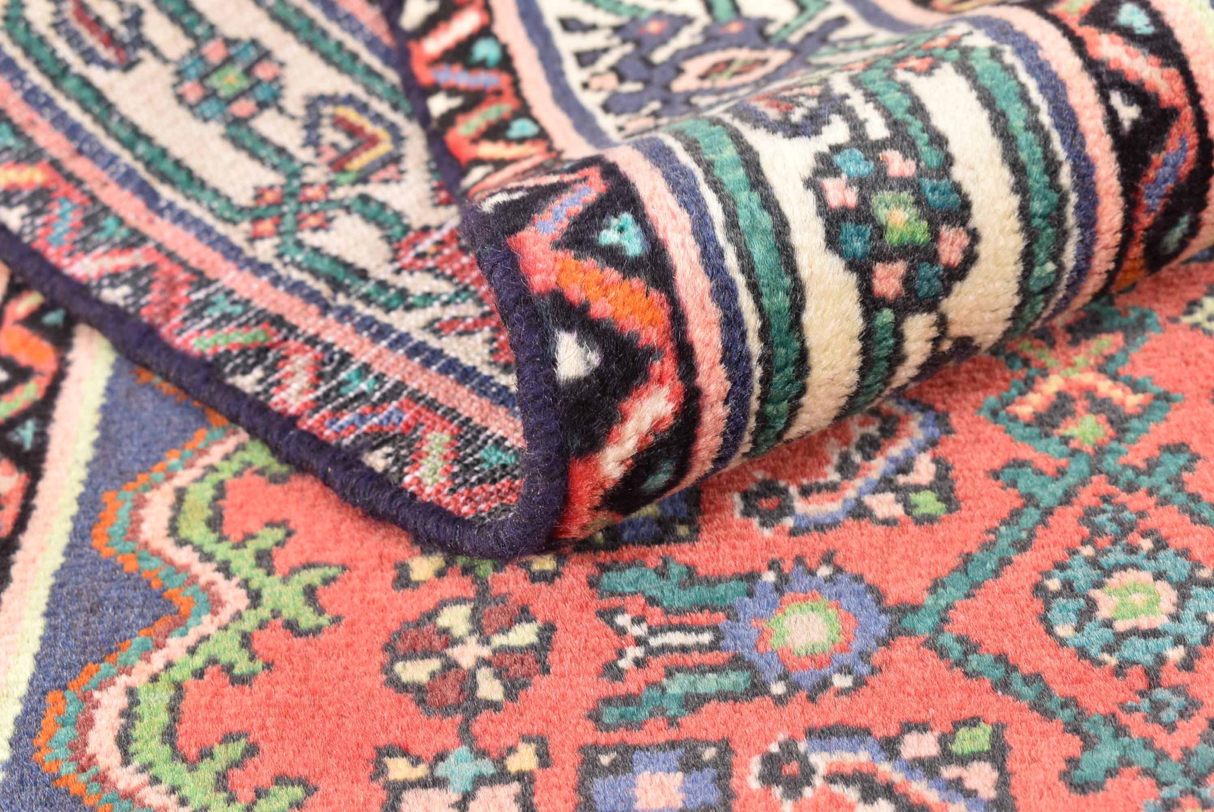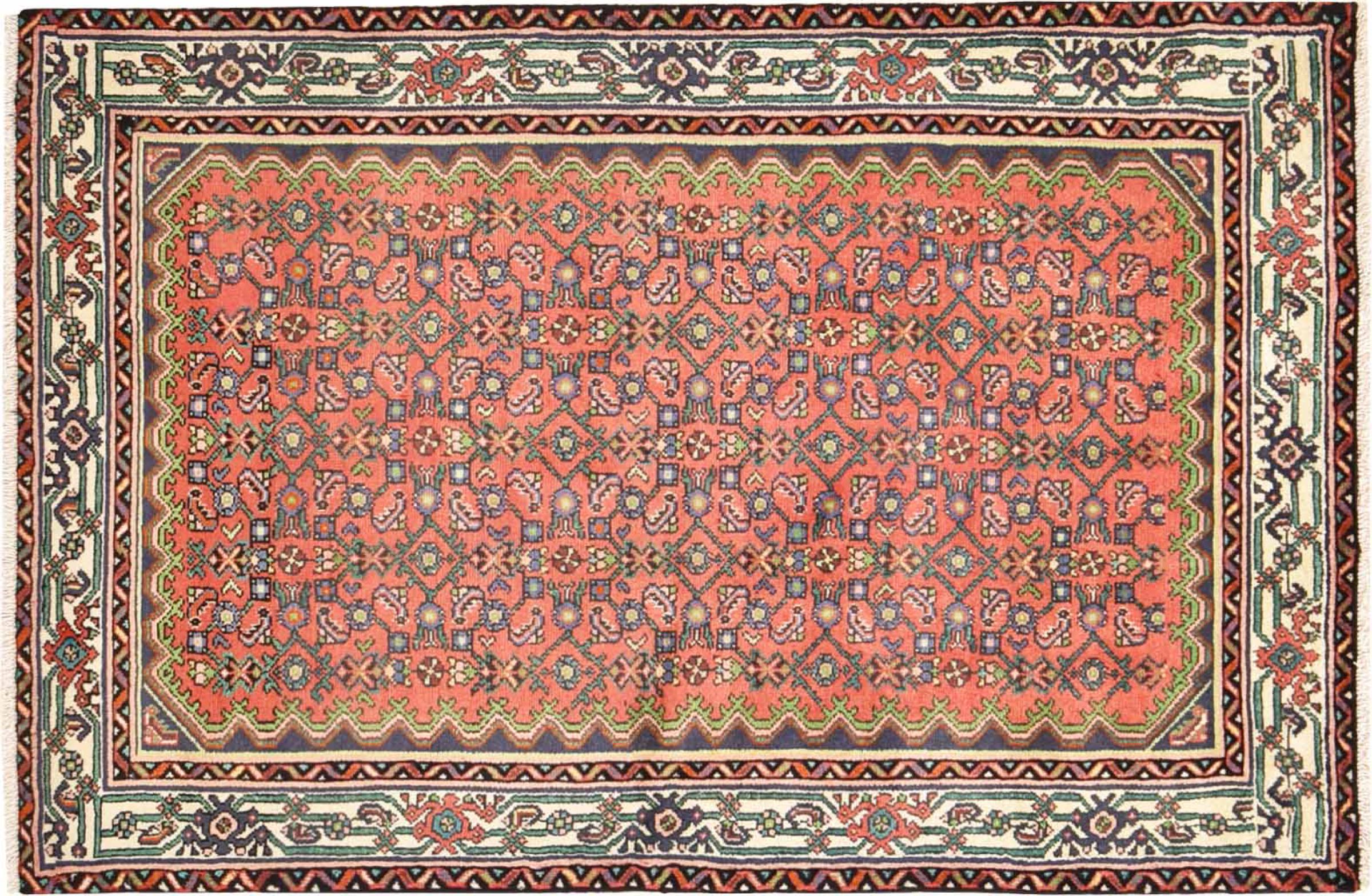 Carpet ID: 300975001081569 Size: 146x98 cm Thickness: ap. 8 mm Knot density: 128 000 - 160 000 / m² Manufacturing: Knotted by hand Pile: Handspun wool Warp: Cotton Origin: Persia Age: New Weight: ap. 5 kg Also know as Huseinabad In stock: Unique - Only 1 in stock