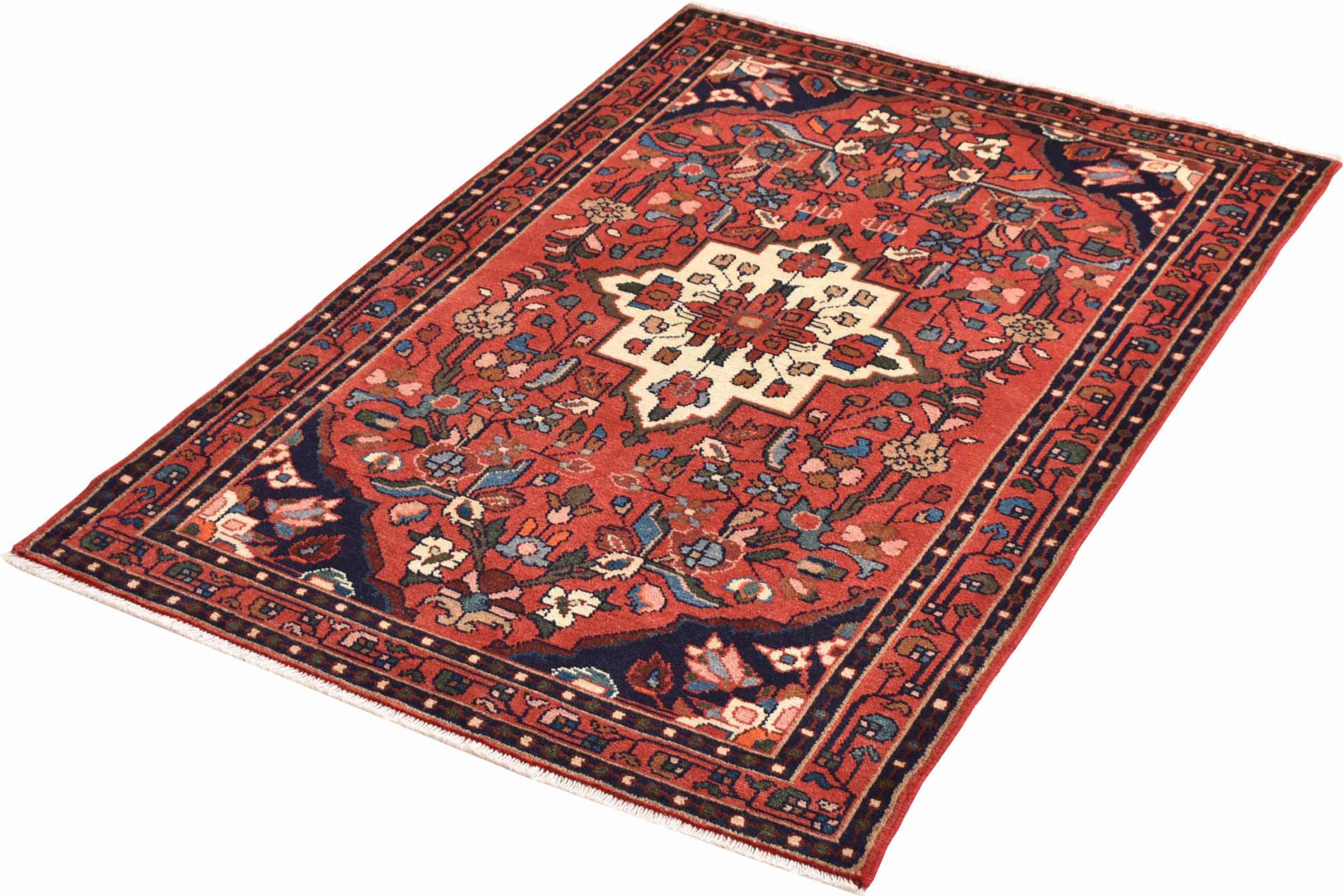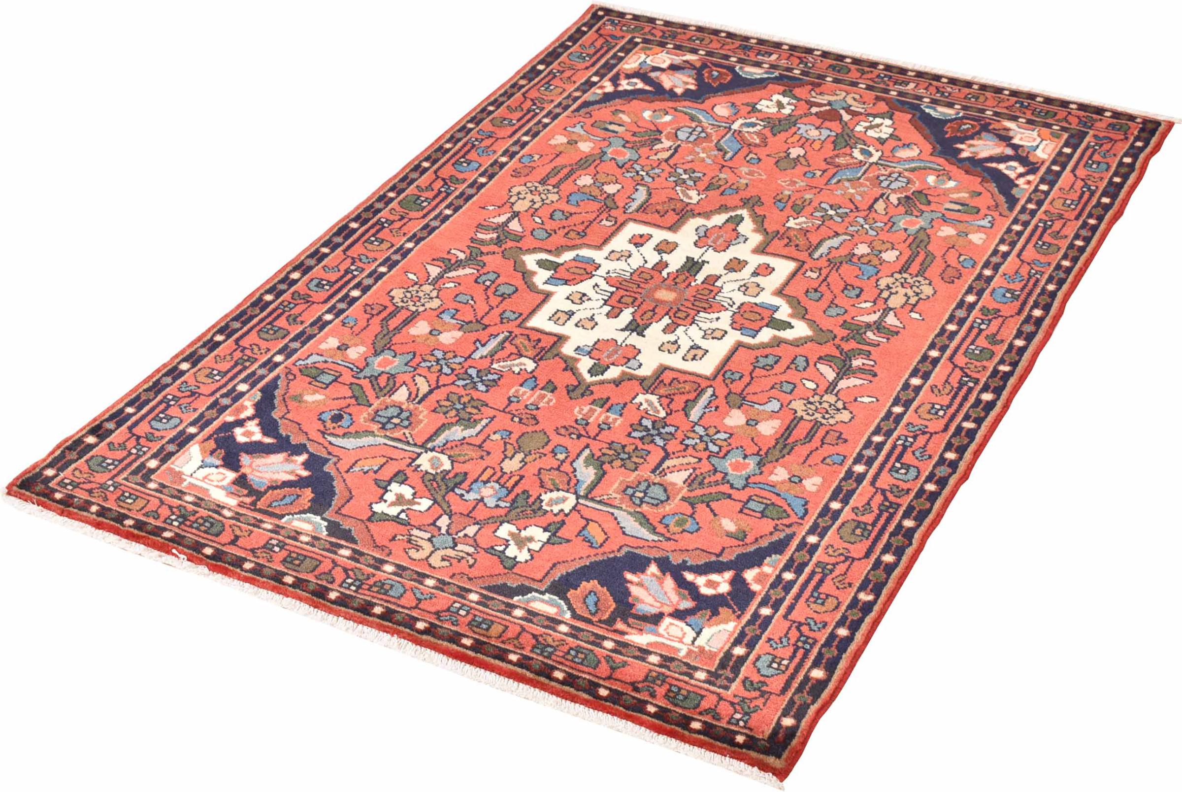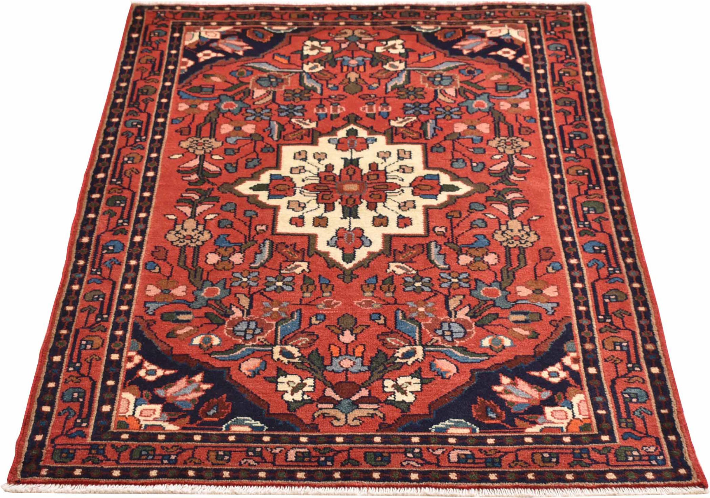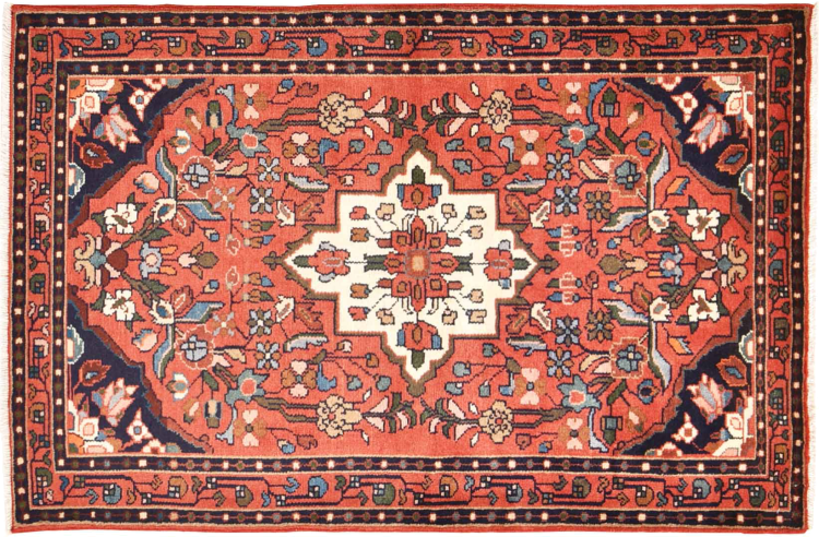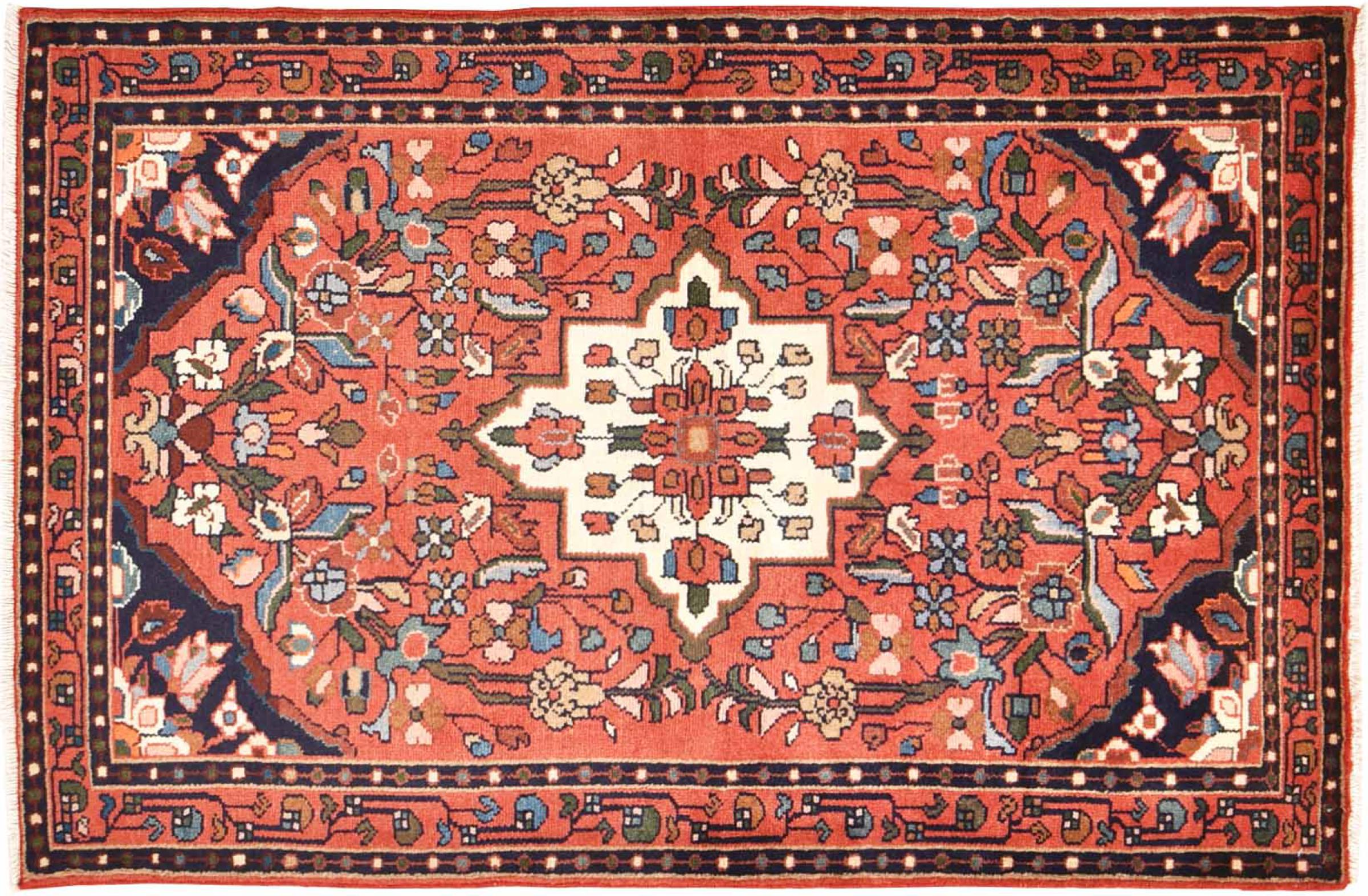 Carpet ID: 30097700223697 Size: 152x98 cm Thickness: ap. 8 mm Knot density: 128 000 - 160 000 / m² Manufacturing: Knotted by hand Pile: Handspun wool Warp: Cotton Origin: Persia Age: New Weight: ap. 5 kg Also know as Huseinabad In stock: Unique - Only 1 in stock