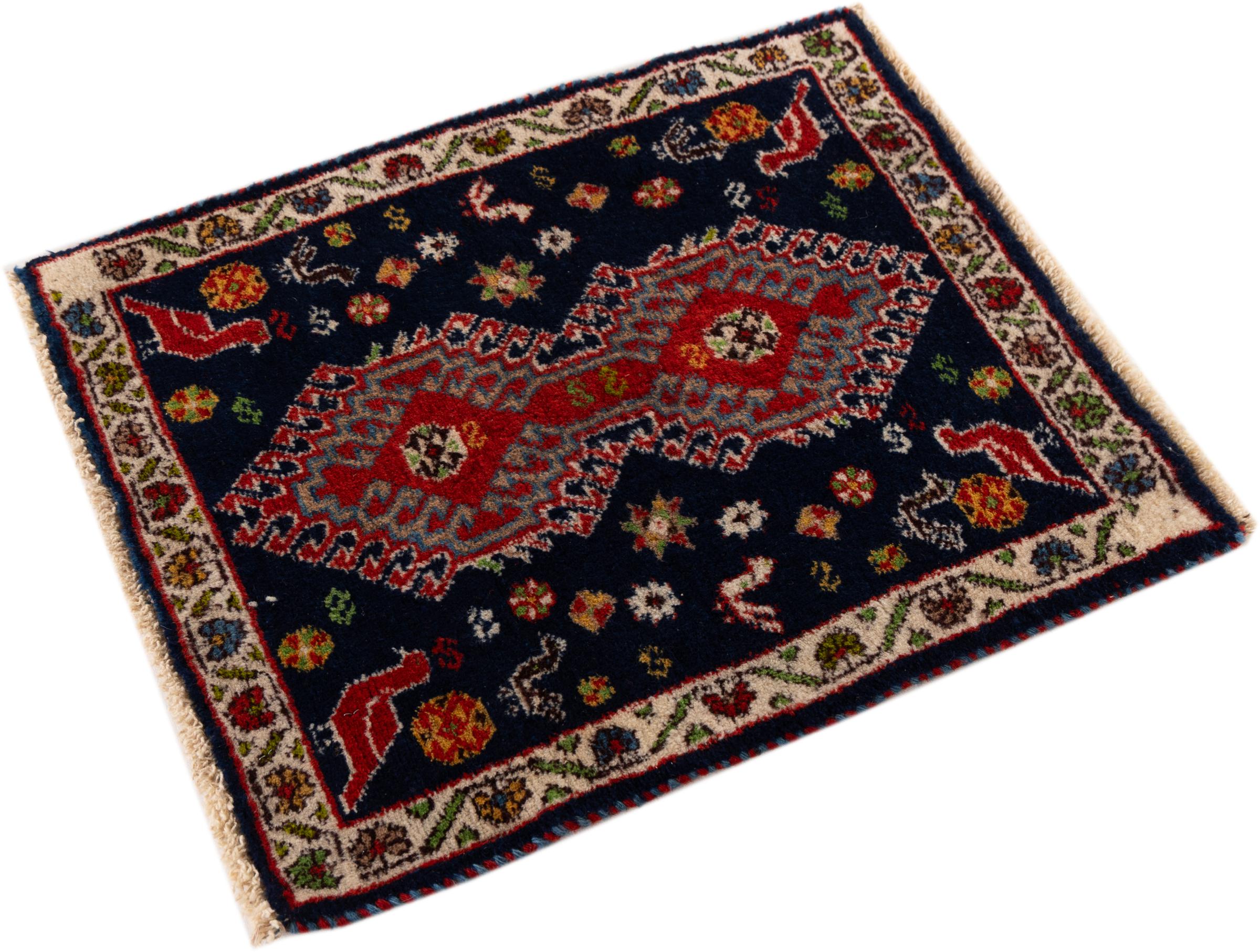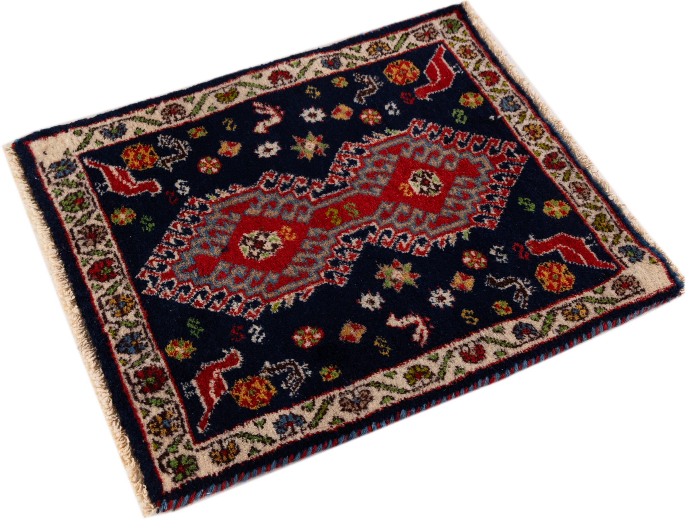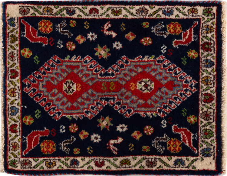 Carpet ID: 30713600105639 Size: 70x57 cm Thickness: ap. 8 mm Knot density: 128 000 - 160 000 / m² Manufacturing: Knotted by hand Pile: Handspun wool Warp: Cotton Origin: Persia Age: New Weight: ap. 1 kg Also know as Huseinabad In stock: Unique - Only 1 in stock