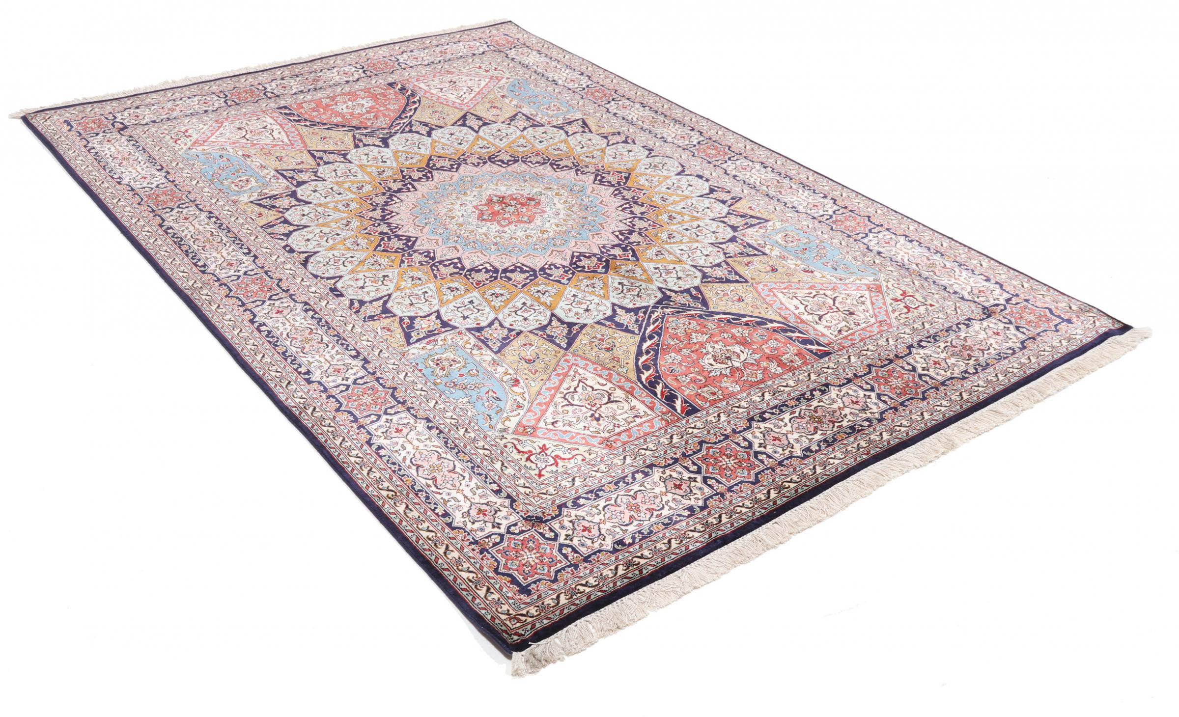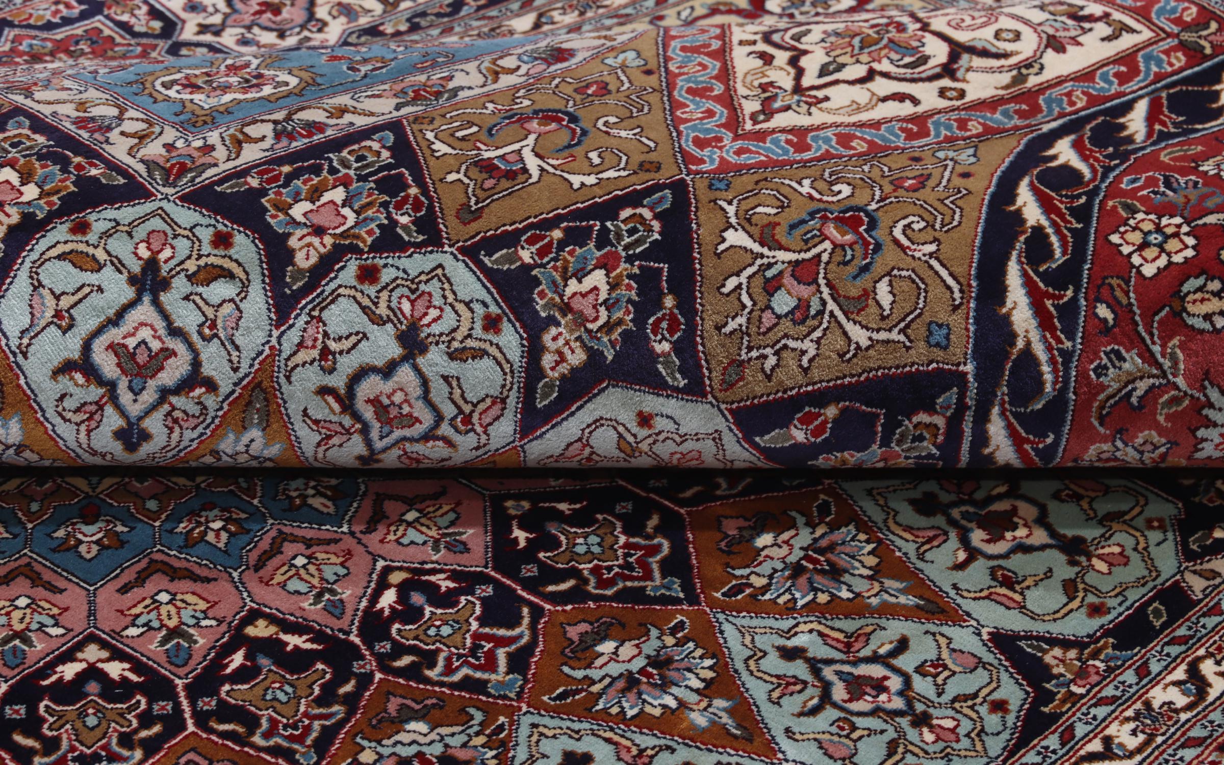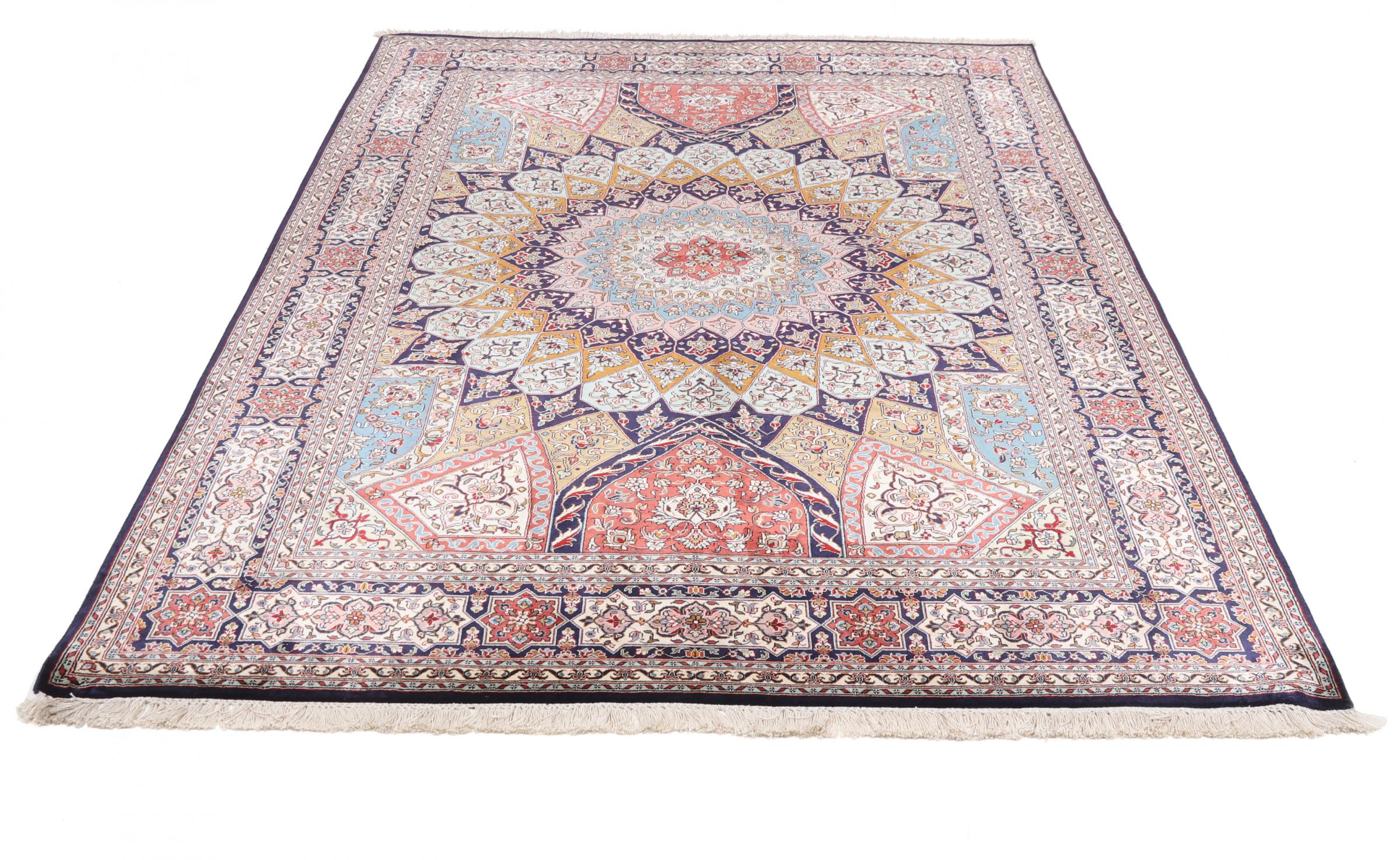 This hand-knotted silk carpet made of cashmere reflects the skills of Indian carpet weavers. The fine natural silk is a fascinating highlight. Not only does it feel particularly soft to the touch, it also lets its colours shine in a wide variety of facets. Depending on the incidence of light, completely new details and colours are visible. You can look at a carpet like this for hours and forget about time - an experience you can't capture in a photo.