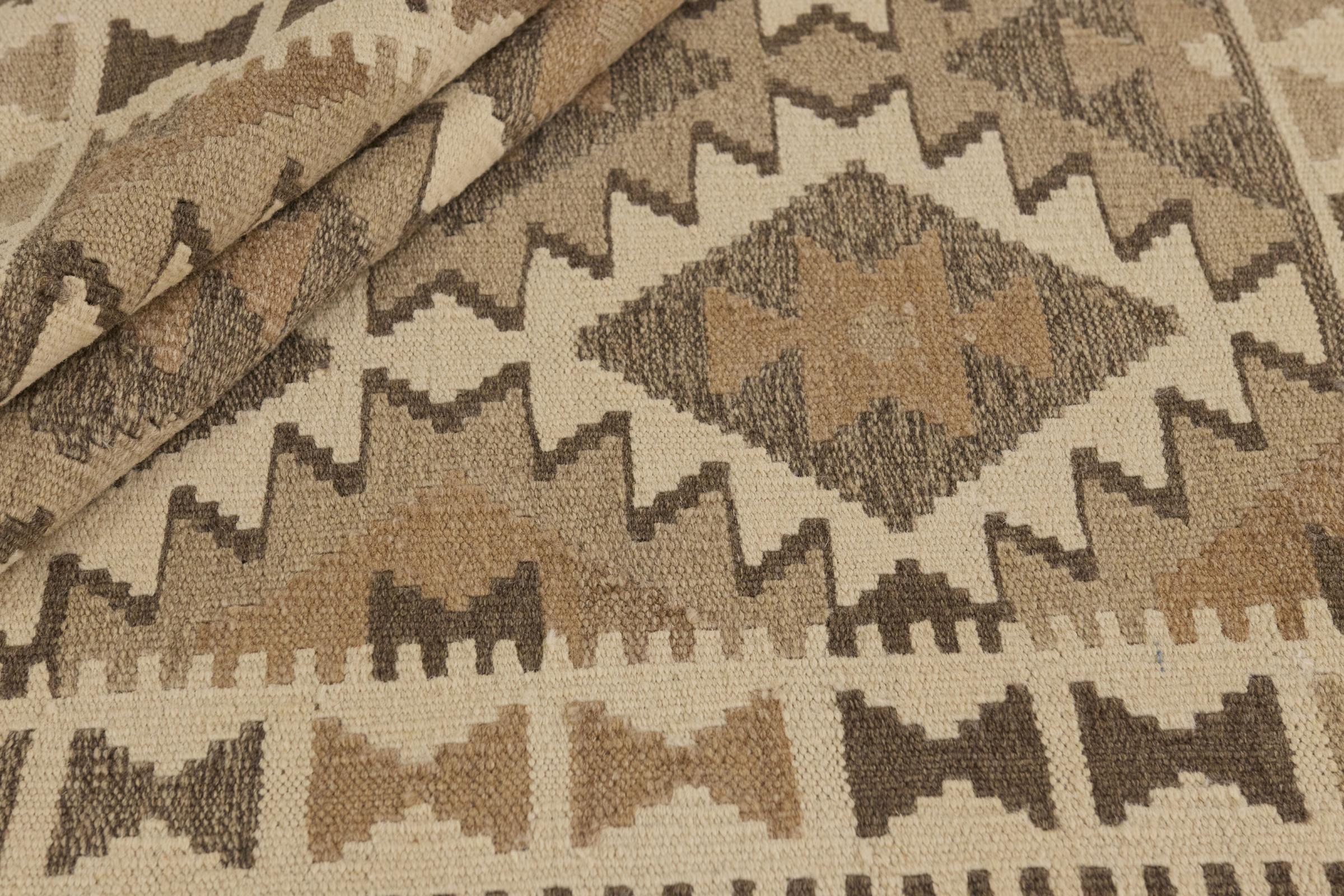This handwoven Kilim Afghan is a wonderful and unique piece of art. Hard to believe that these modern colours and patterns have already been used centuries ago. This carpet has been woven by hand in old tradition in Afghanistan. It delivers a portion of contemporary history, which you won't find in this specific design a second time. It consists of high-grade natural wool and gives your home a personalised touch.