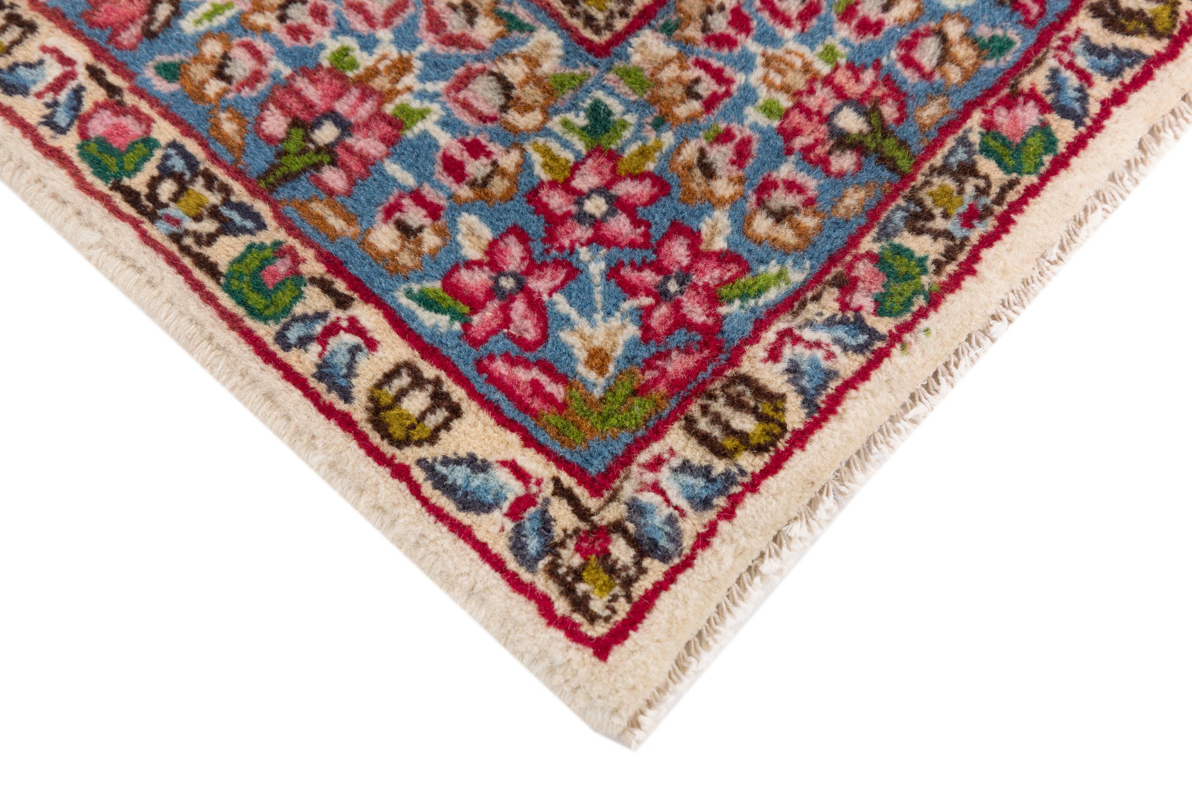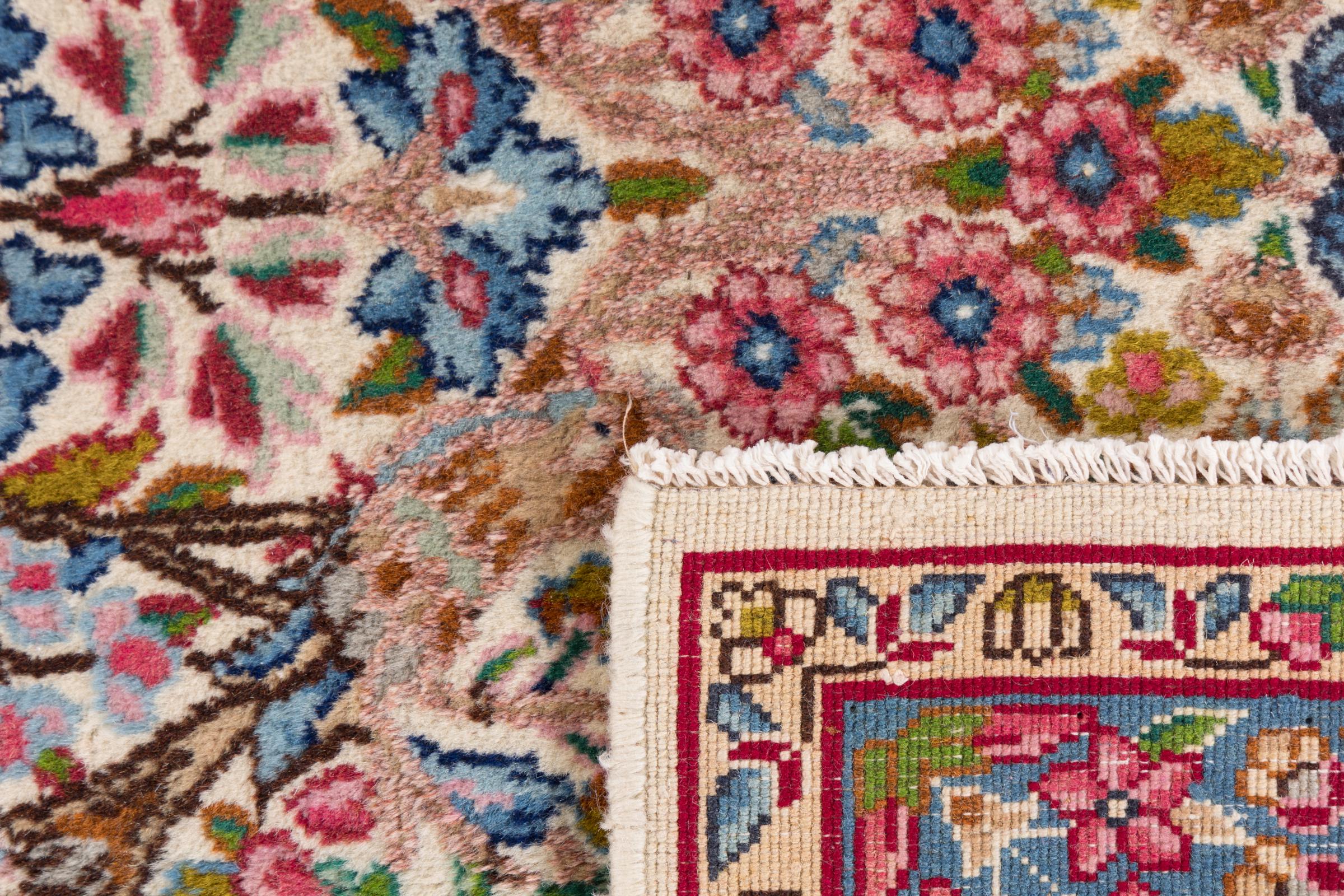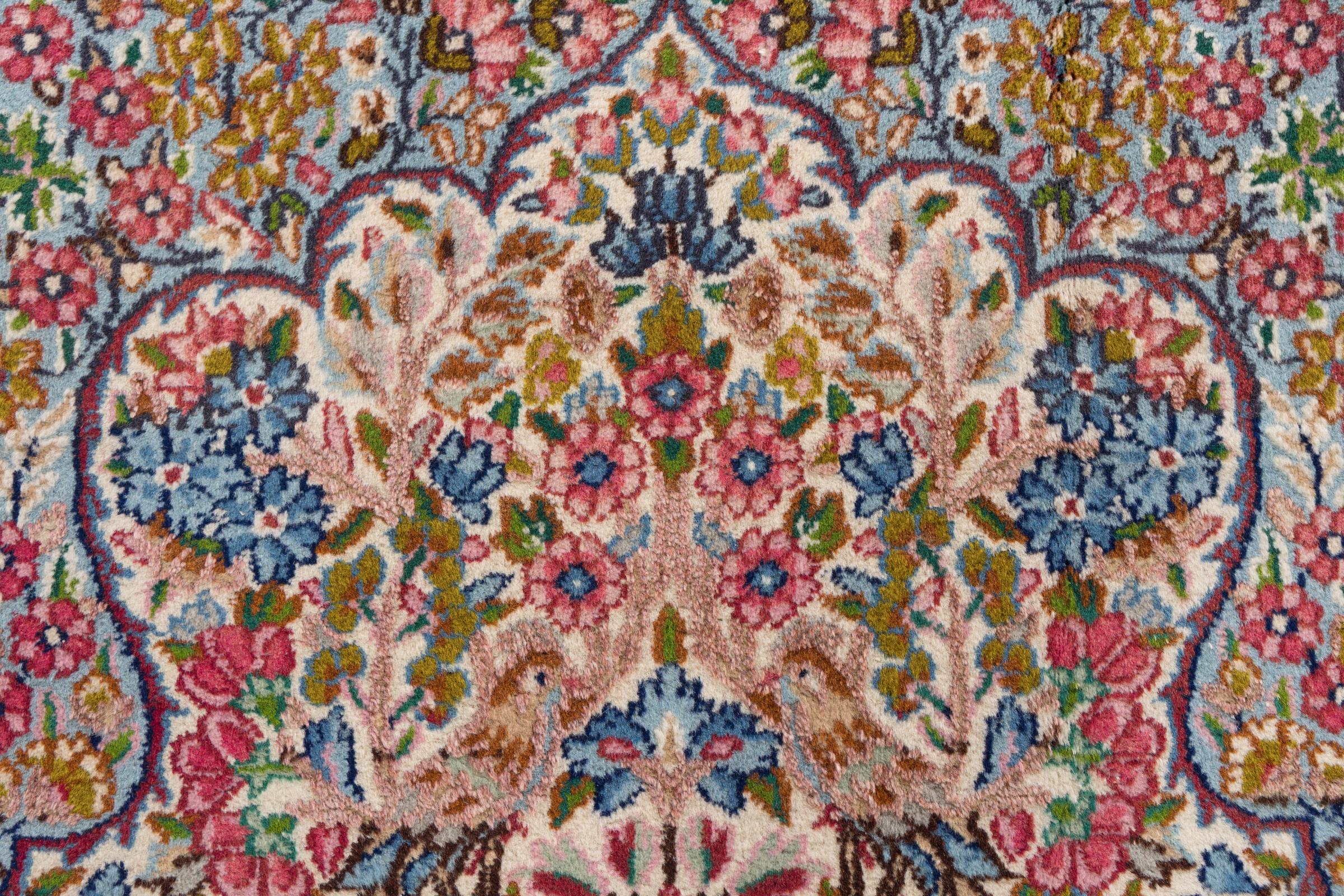 This Kerman carpet is truly impressive, its quality and design are a wonderful composition of oriental art. It has been crafted by hand in Kerman, an oasis in a desert far out from Teheran. Floral ornaments are typical for this type of carpet, something you value highly in an oasis of the wide desert. The design of these carpets is unique and special among other Persian rugs.
