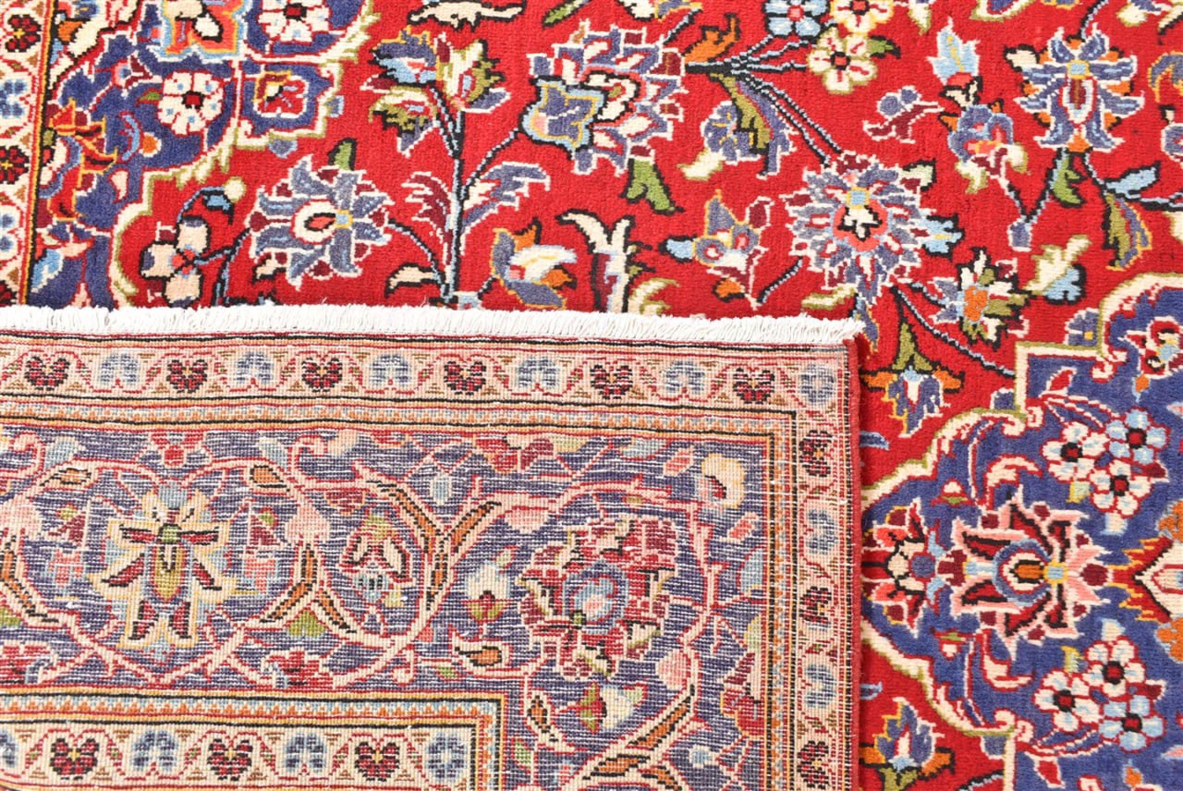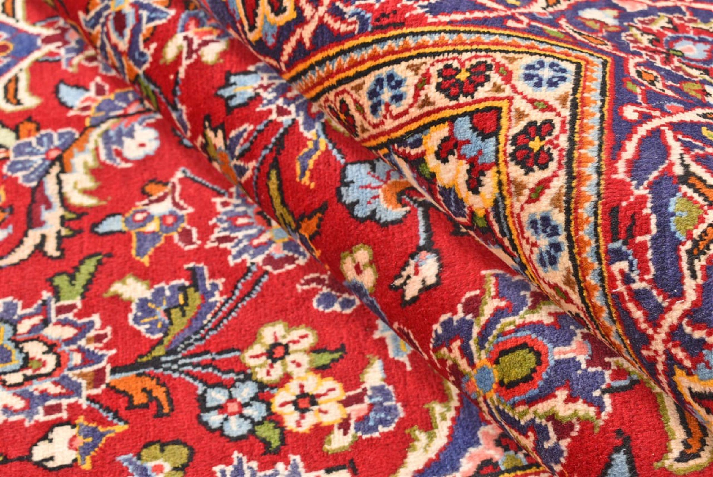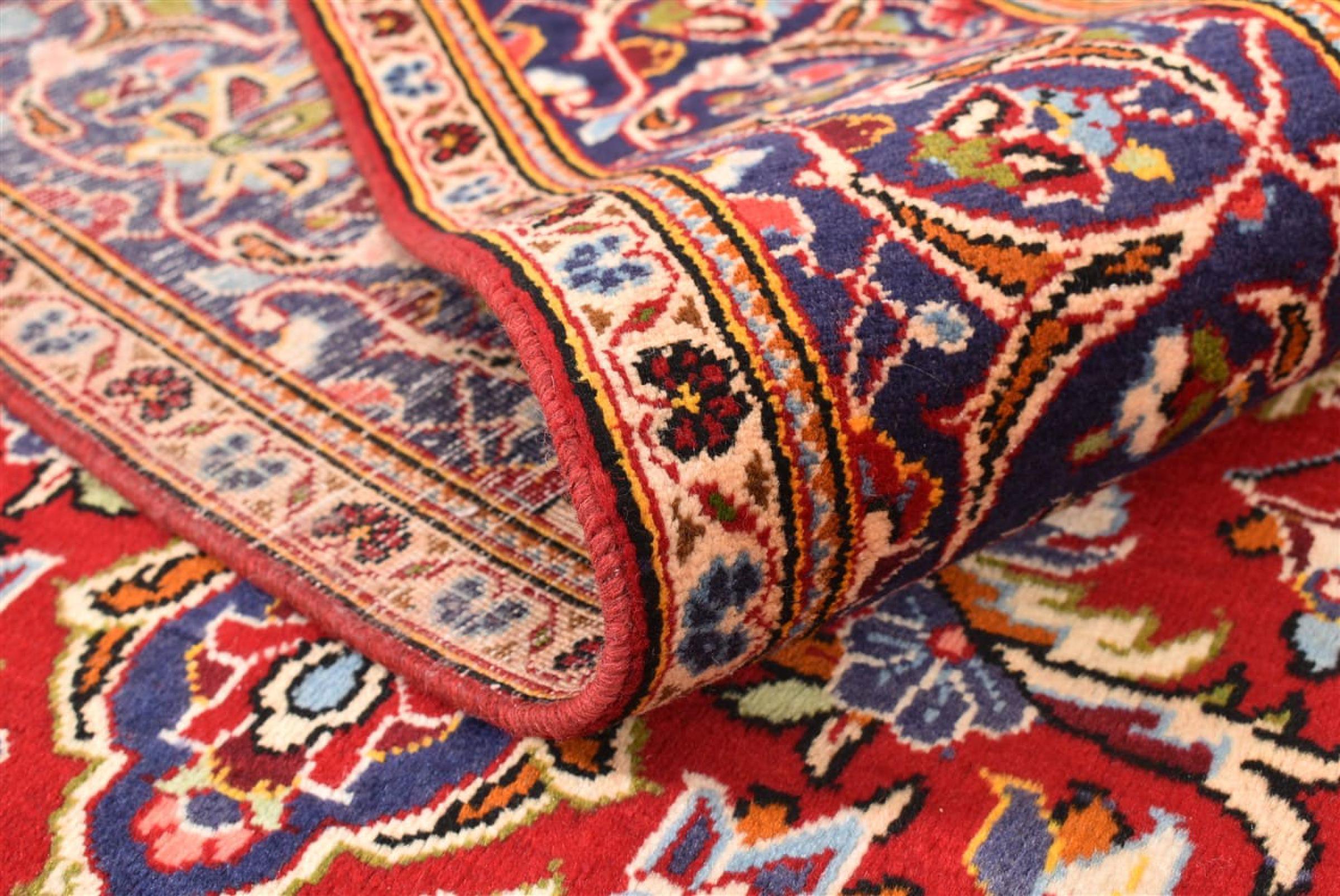 Hand knotted rugs from the city of Kashan (Keshan) are known worldwide. Not only do these Persian rugs have a very popular design, but their quality is undisputedly one of the best. In the Persian Empire the city was considered one of the most important trading places along the famous Silk Road. Kashan rugs usually have a central medallion, floral ornaments and a red background. They are made of high-quality sheep's wool and vegetable dyes.