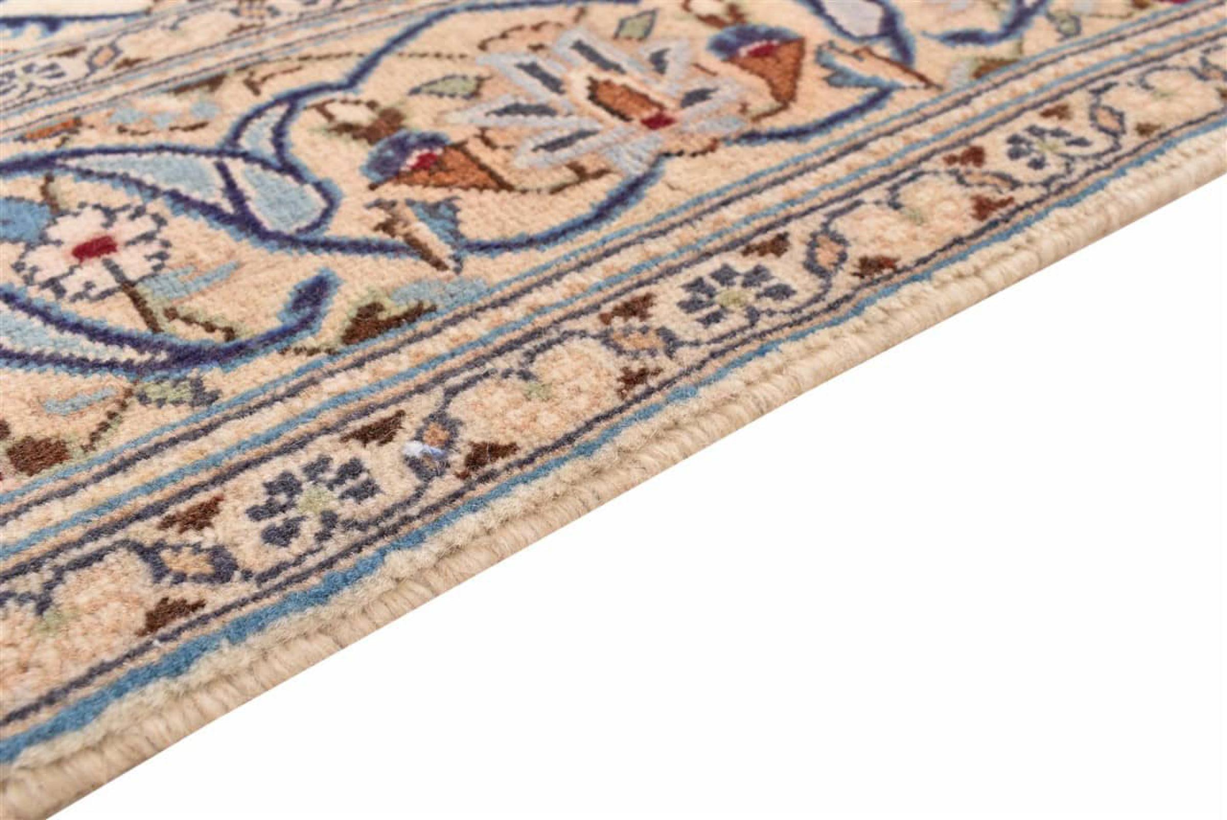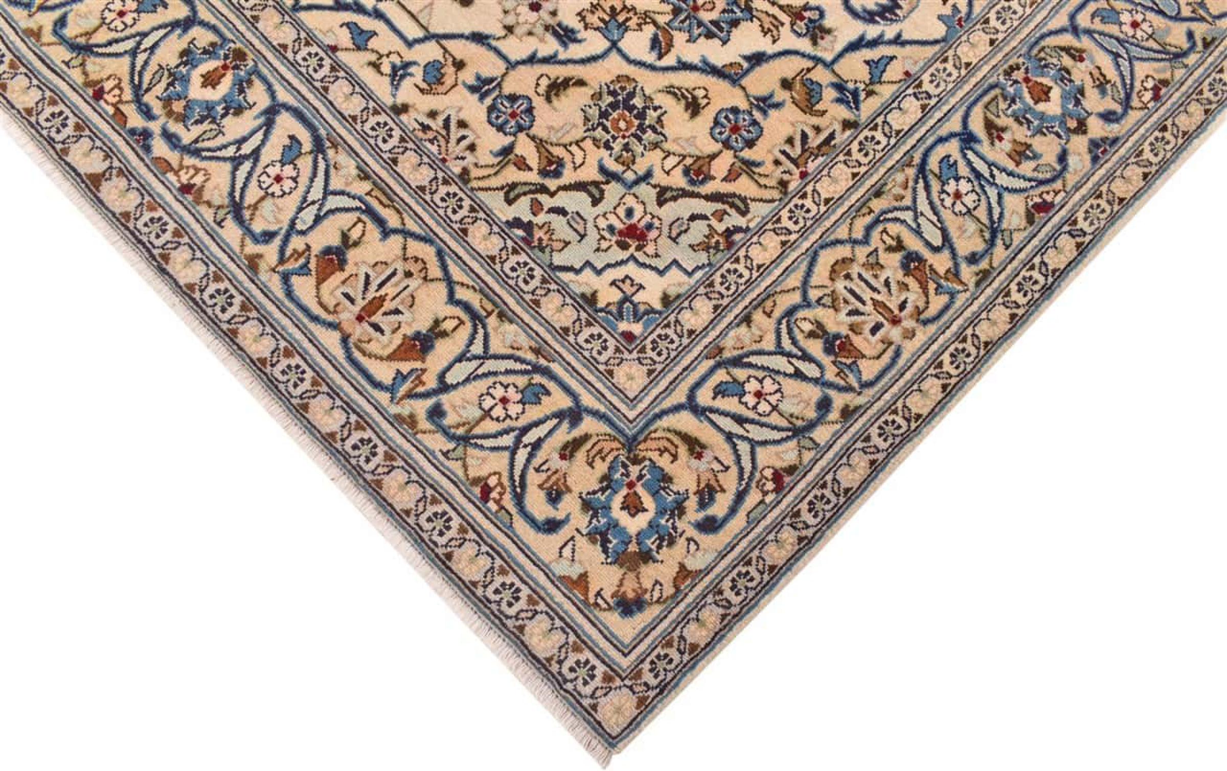 This carpet from Kashan (Keshan) is held in its very traditional and typical Persian design with beautiful ornaments. Kashan rugs are highly popular due to their exceptionally elegant design. These carpets originate from Kashan, a city on the ancient Silk Road. This carpet has been knotted by hand from high grade sheep wool and is going to be an one-of-a-kind highlight in your home.