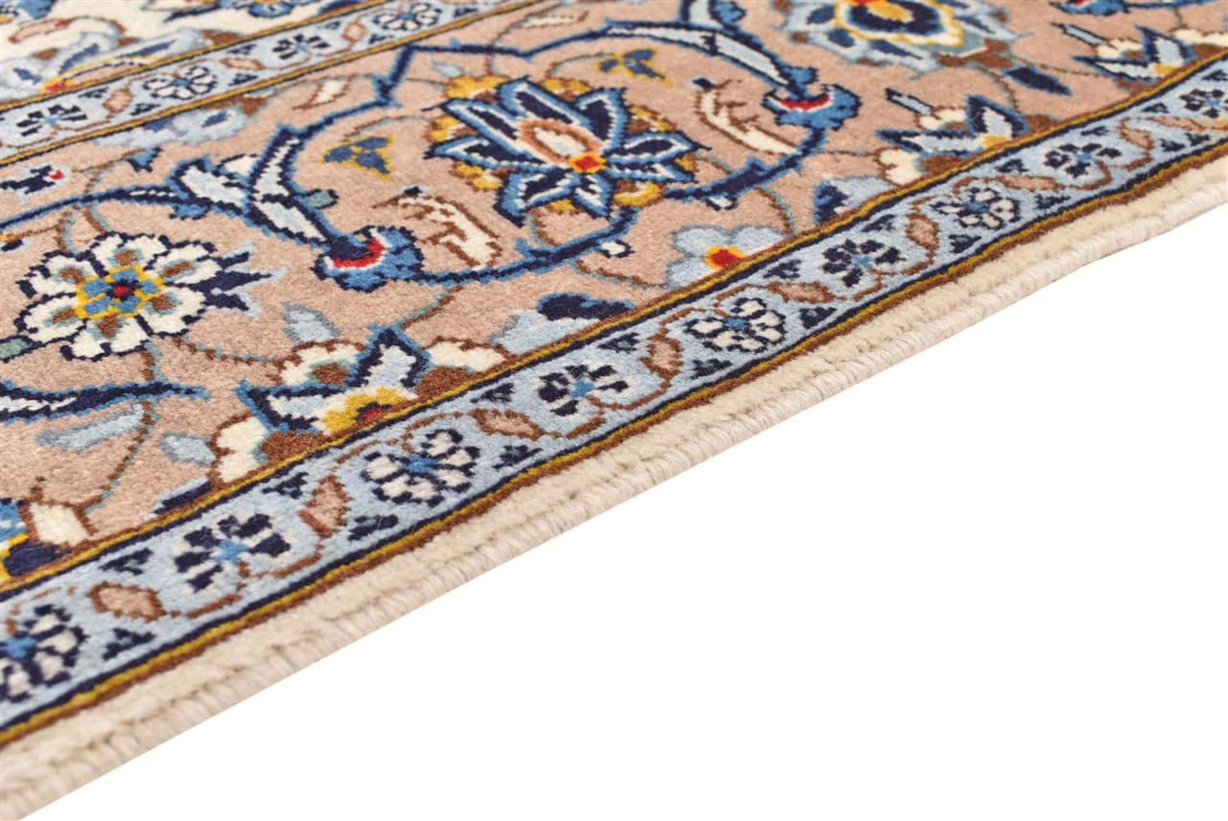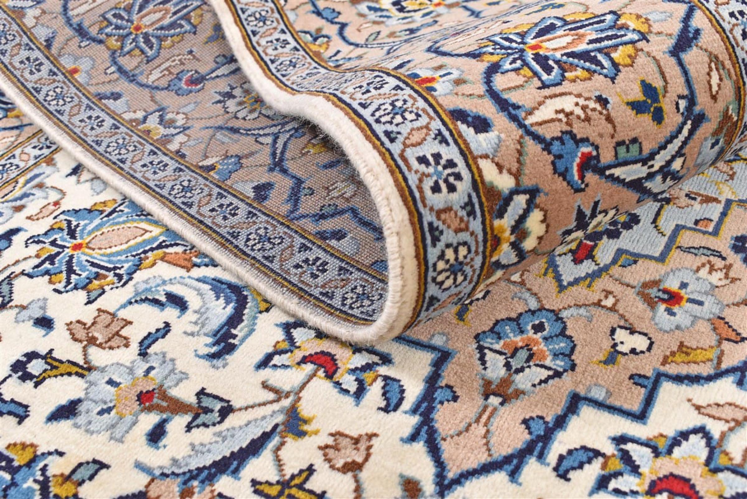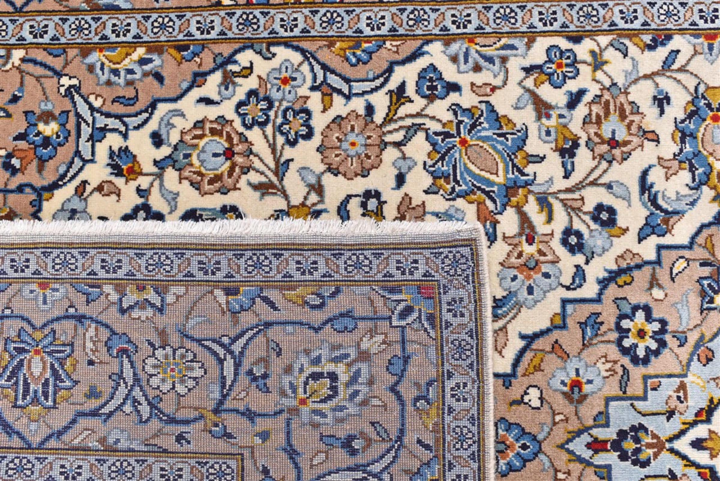 This carpet from Kashan (Keshan) is held in its very traditional and typical Persian design with beautiful ornaments. Kashan rugs are highly popular due to their exceptionally elegant design. These carpets originate from Kashan, a city on the ancient Silk Road. This carpet has been knotted by hand from high grade sheep wool and is going to be an one-of-a-kind highlight in your home.