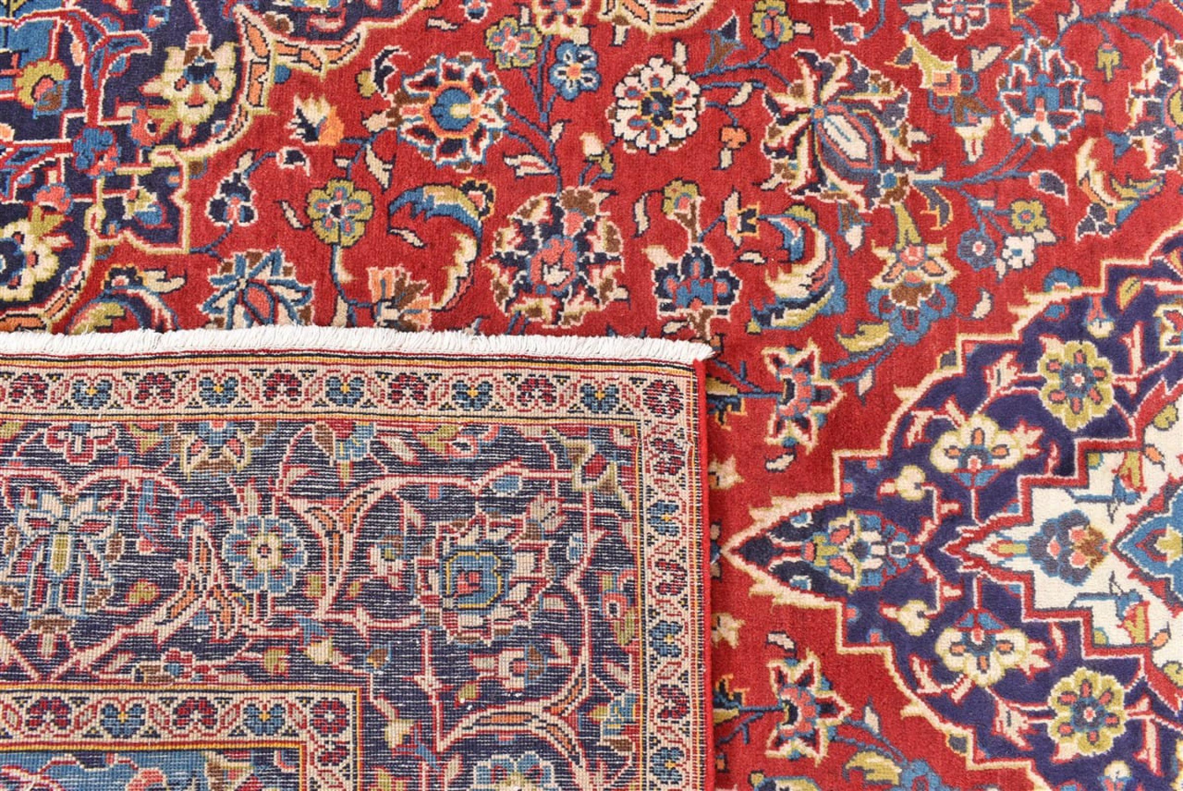 This carpet from Kashan (Keshan) is held in its very traditional and typical Persian design with beautiful ornaments. Kashan rugs are highly popular due to their exceptionally elegant design. These carpets originate from Kashan, a city on the ancient Silk Road. This carpet has been knotted by hand from high grade sheep wool and is going to be an one-of-a-kind highlight in your home.