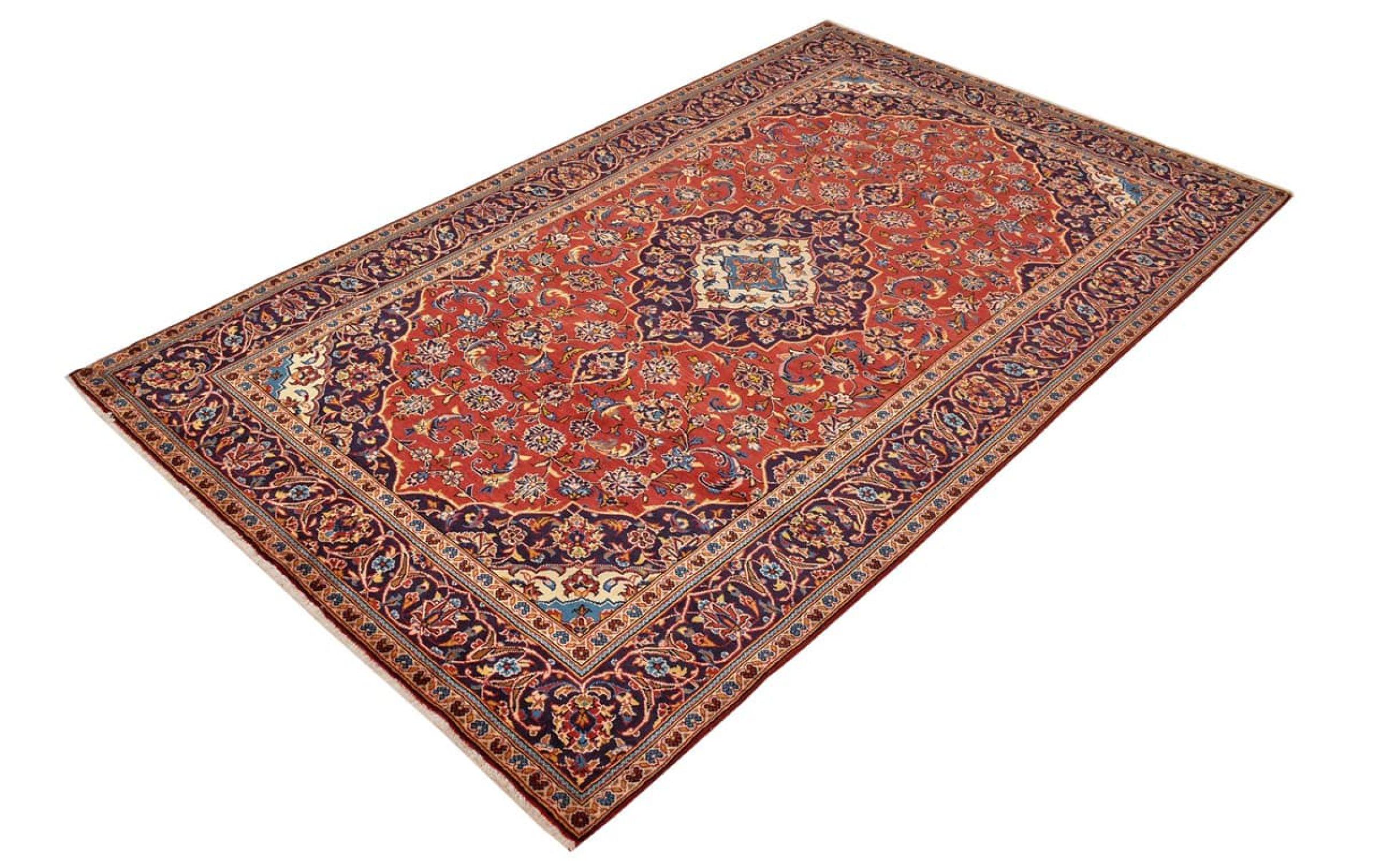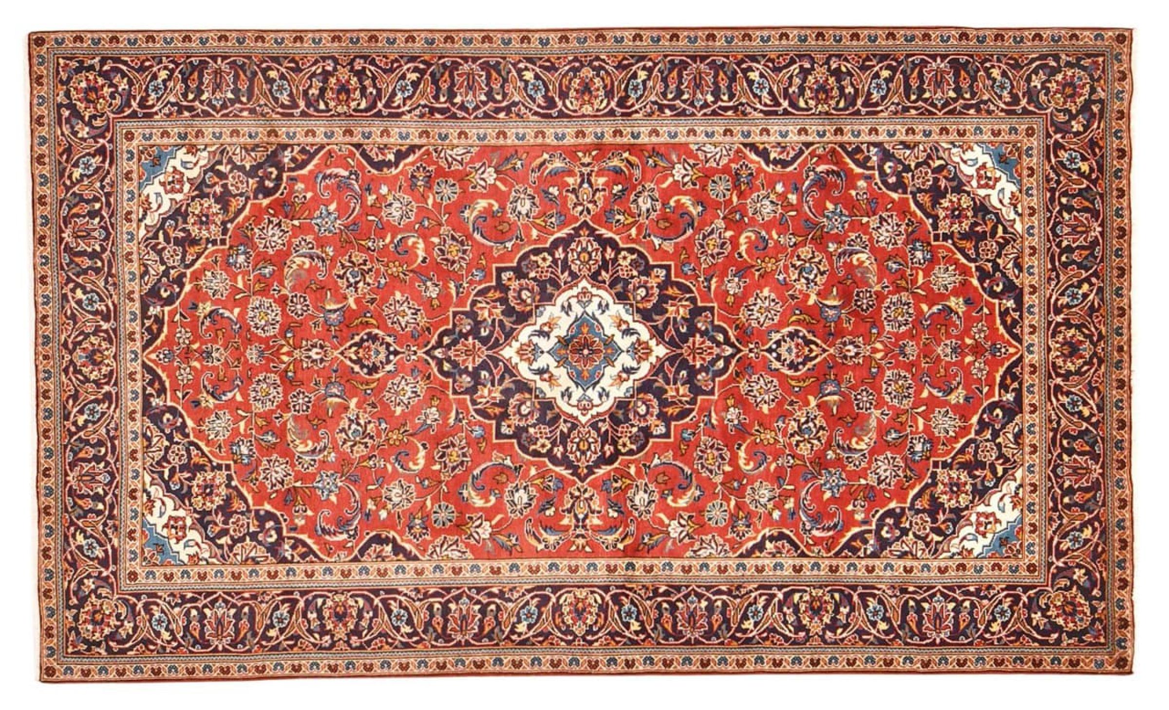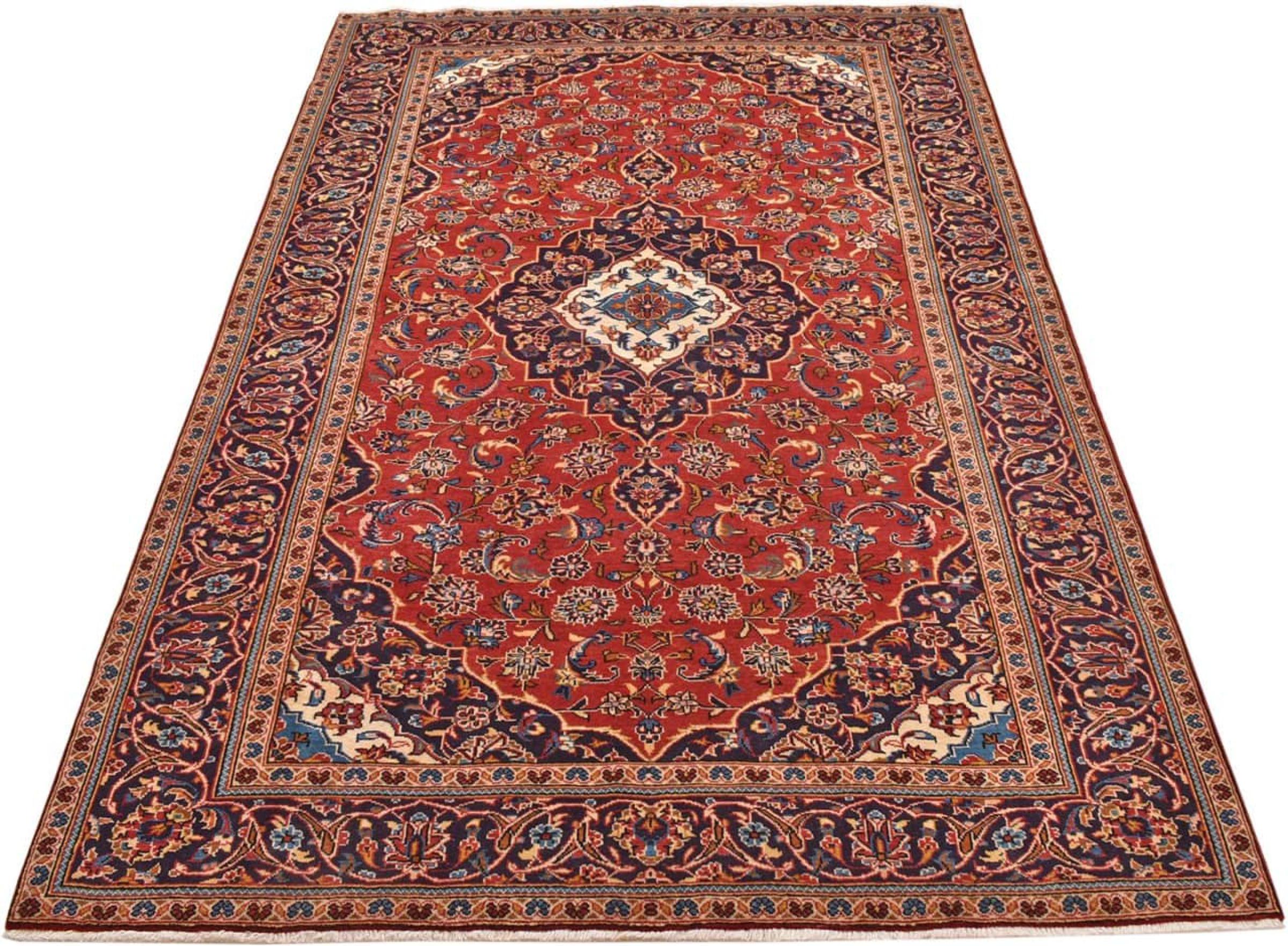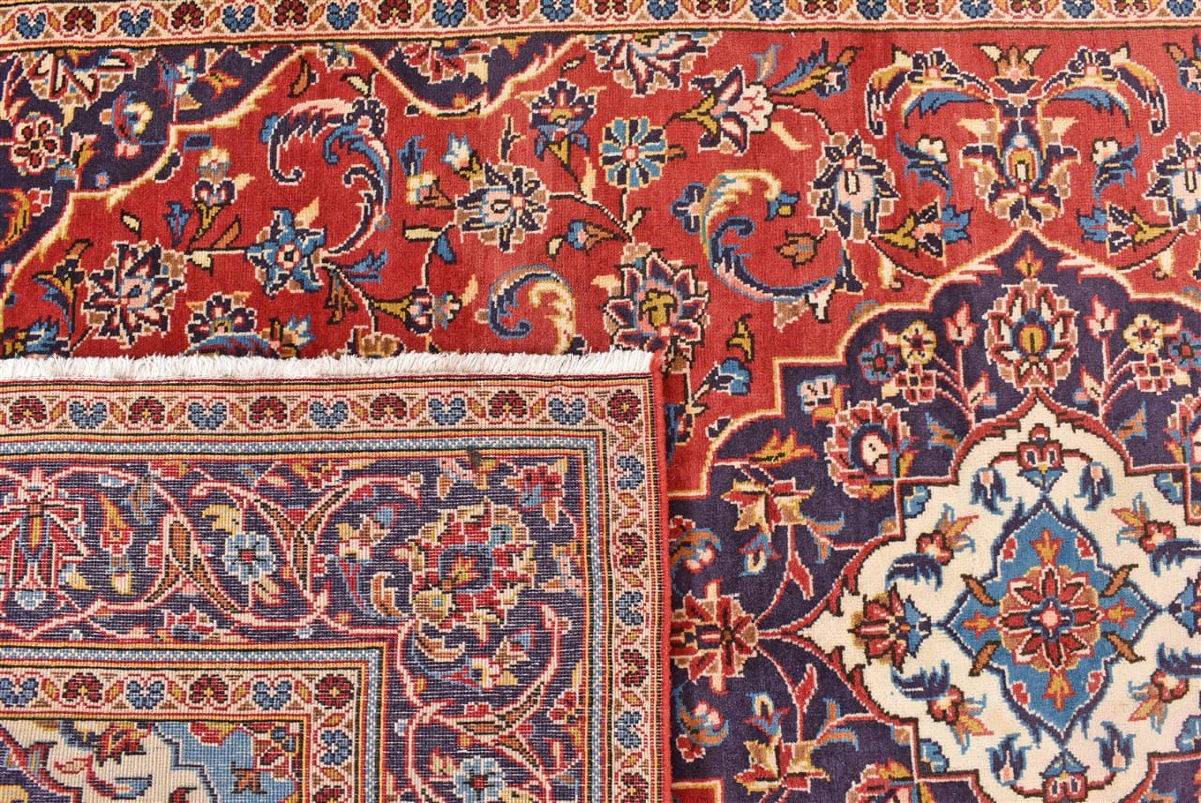 Hand knotted rugs from the city of Kashan (Keshan) are known worldwide. Not only do these Persian rugs have a very popular design, but their quality is undisputedly one of the best. In the Persian Empire the city was considered one of the most important trading places along the famous Silk Road. Kashan rugs usually have a central medallion, floral ornaments and a red background. They are made of high-quality sheep's wool and vegetable dyes.