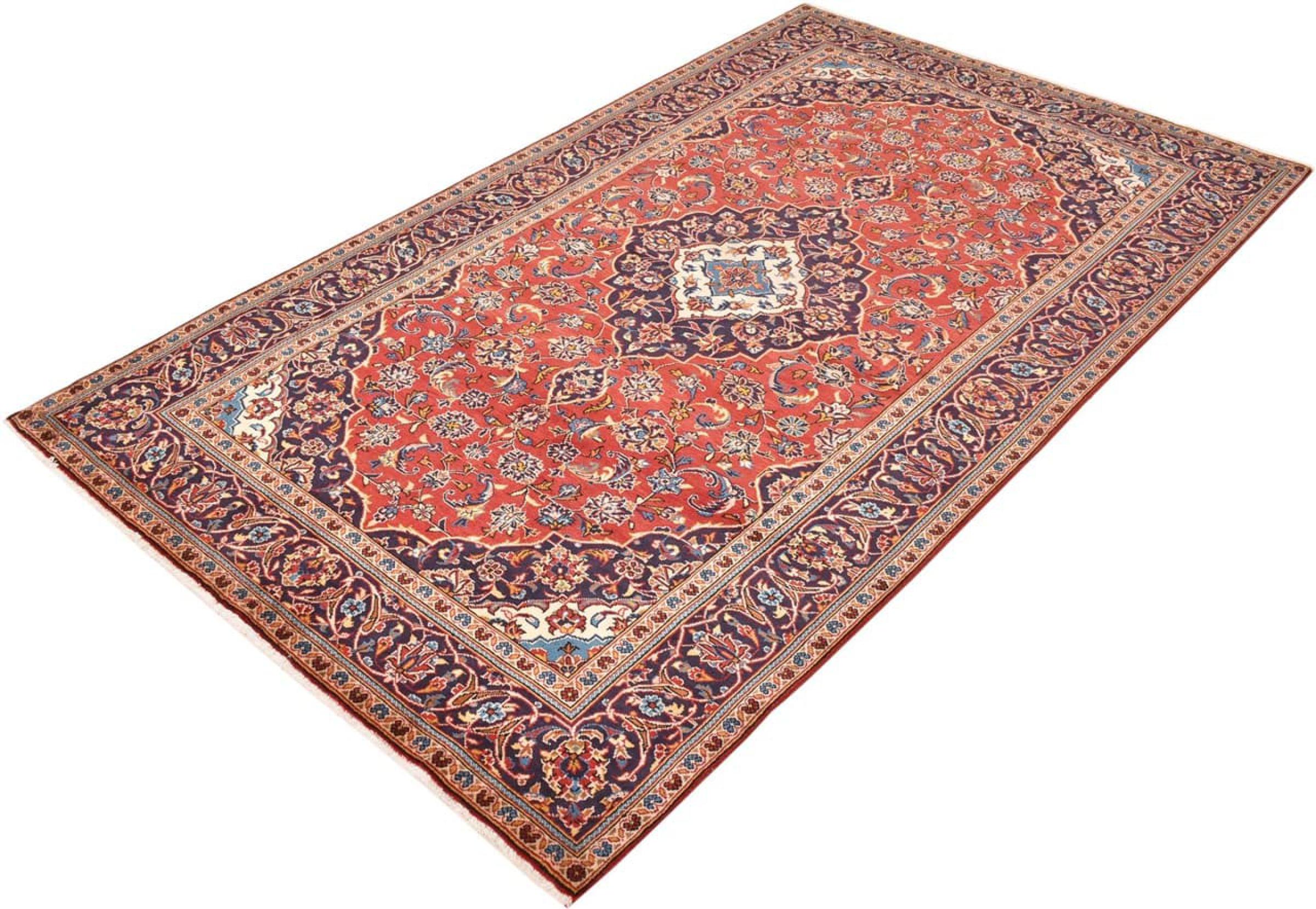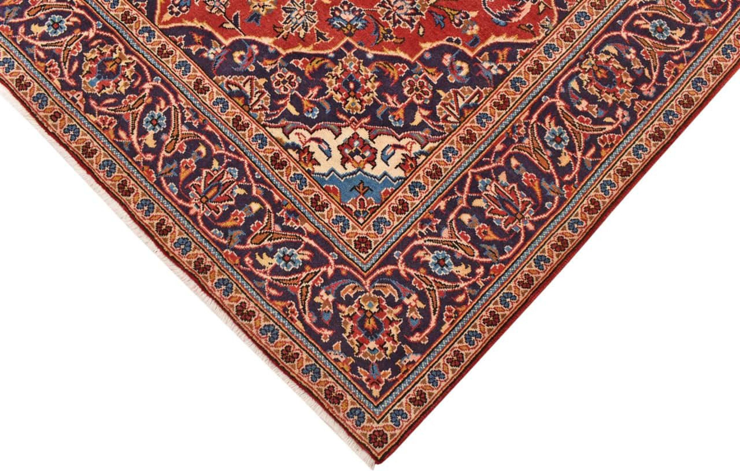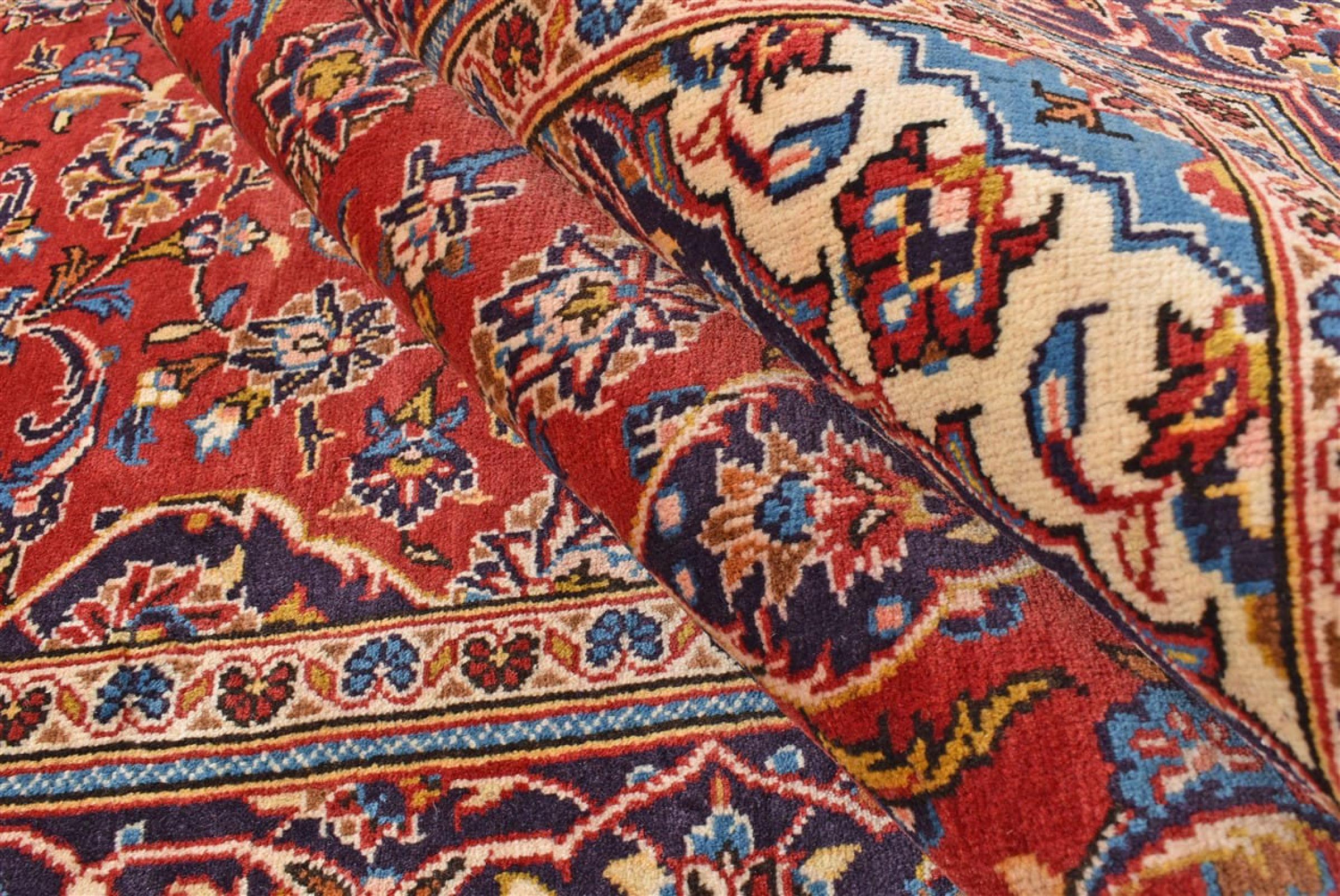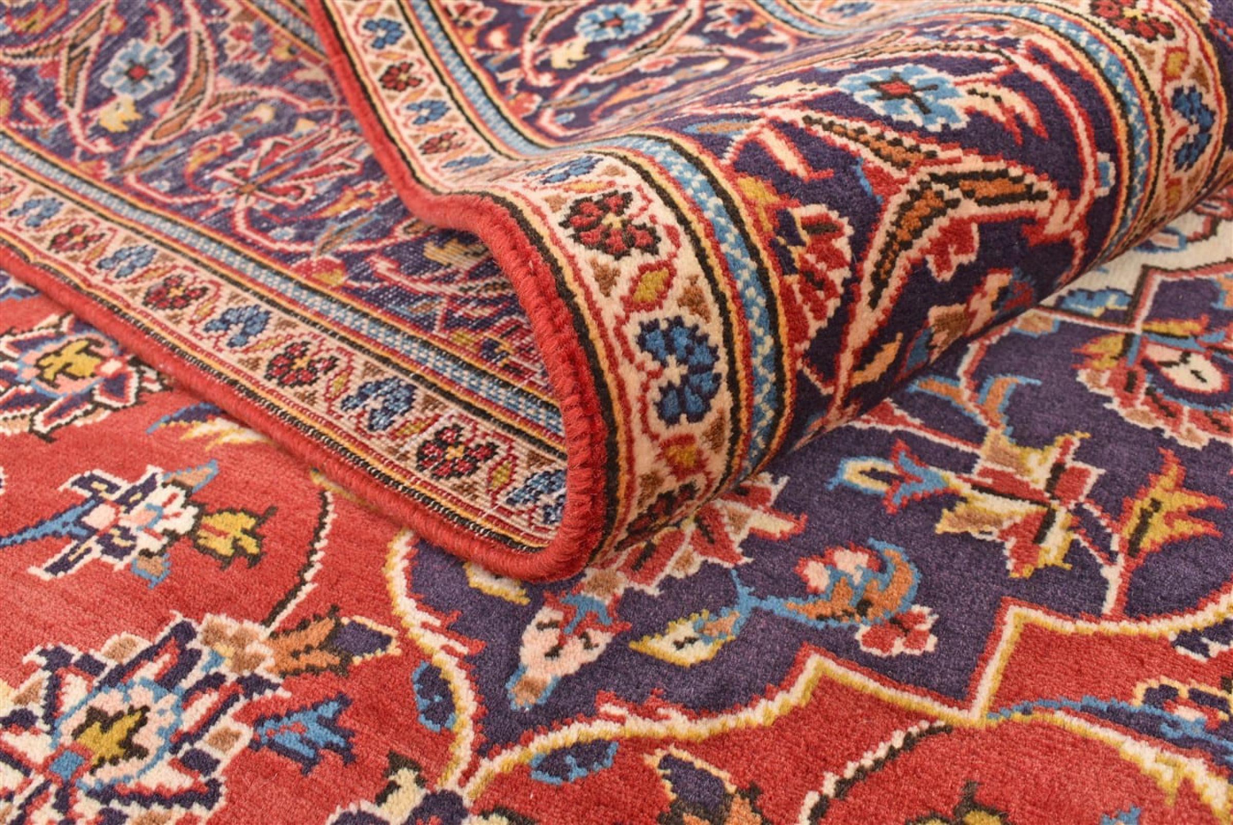 Hand knotted rugs from the city of Kashan (Keshan) are known worldwide. Not only do these Persian rugs have a very popular design, but their quality is undisputedly one of the best. In the Persian Empire the city was considered one of the most important trading places along the famous Silk Road. Kashan rugs usually have a central medallion, floral ornaments and a red background. They are made of high-quality sheep's wool and vegetable dyes.