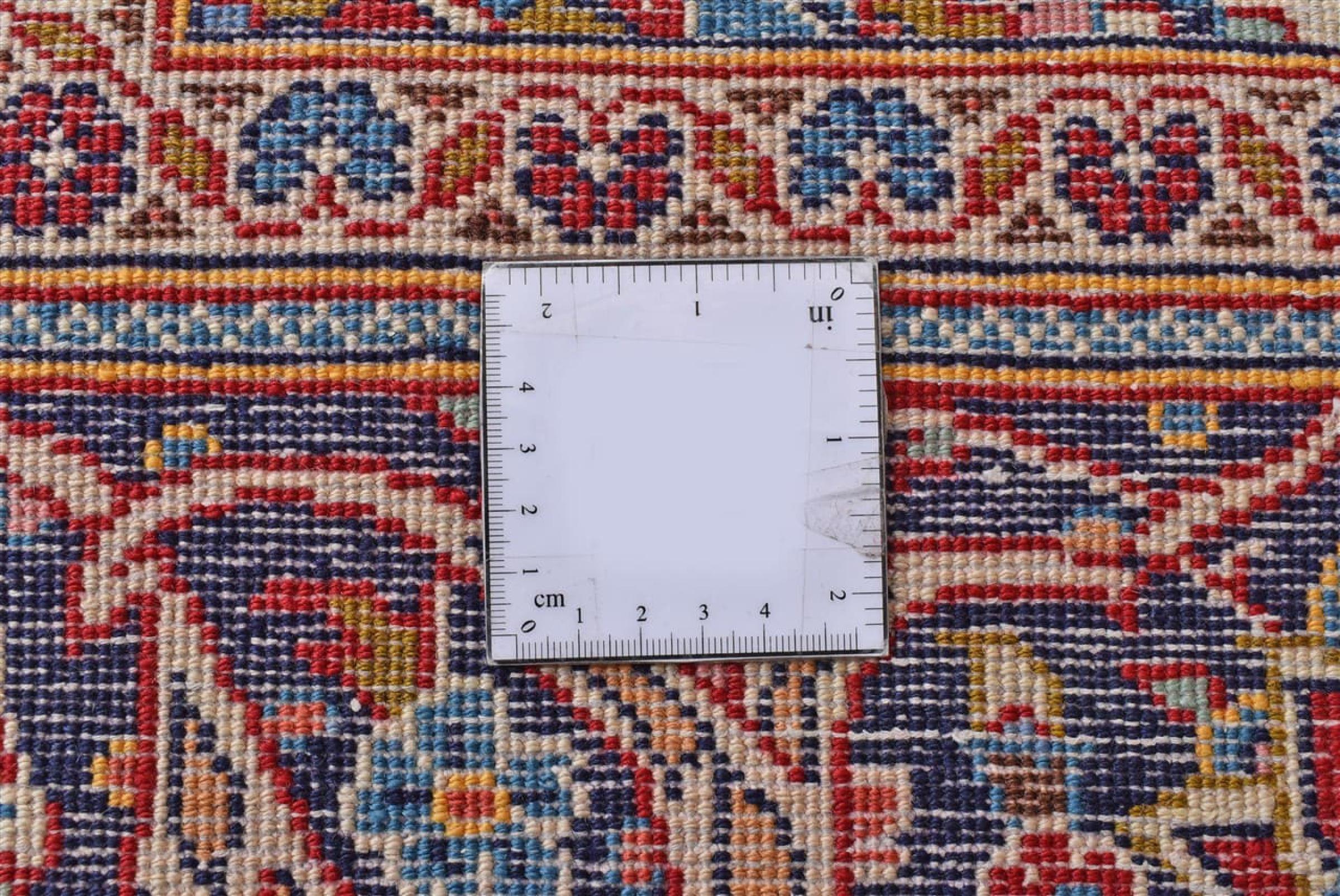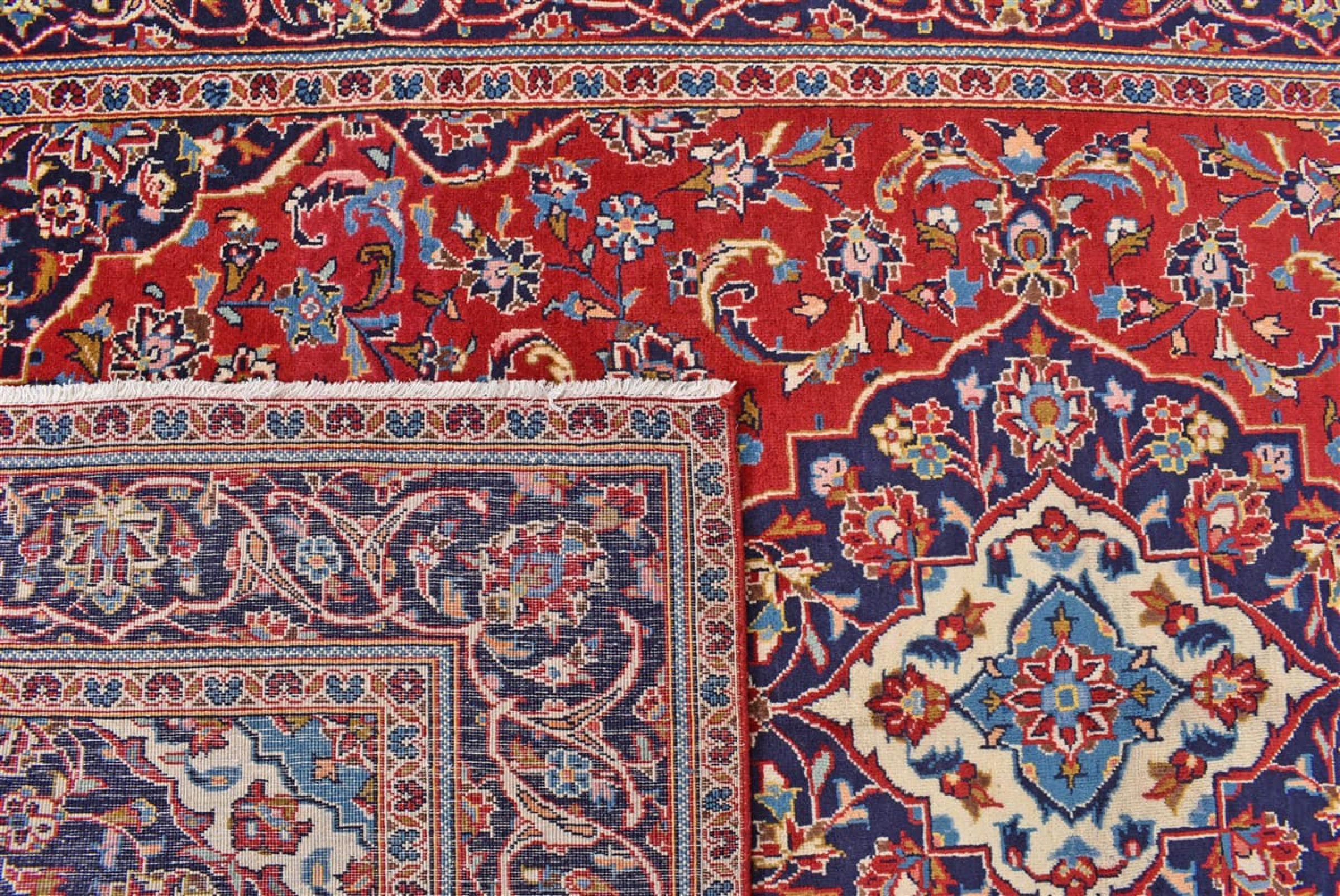 This carpet from Kashan (Keshan) is held in its very traditional and typical Persian design with beautiful ornaments. Kashan rugs are highly popular due to their exceptionally elegant design. These carpets originate from Kashan, a city on the ancient Silk Road. This carpet has been knotted by hand from high grade sheep wool and is going to be an one-of-a-kind highlight in your home.
