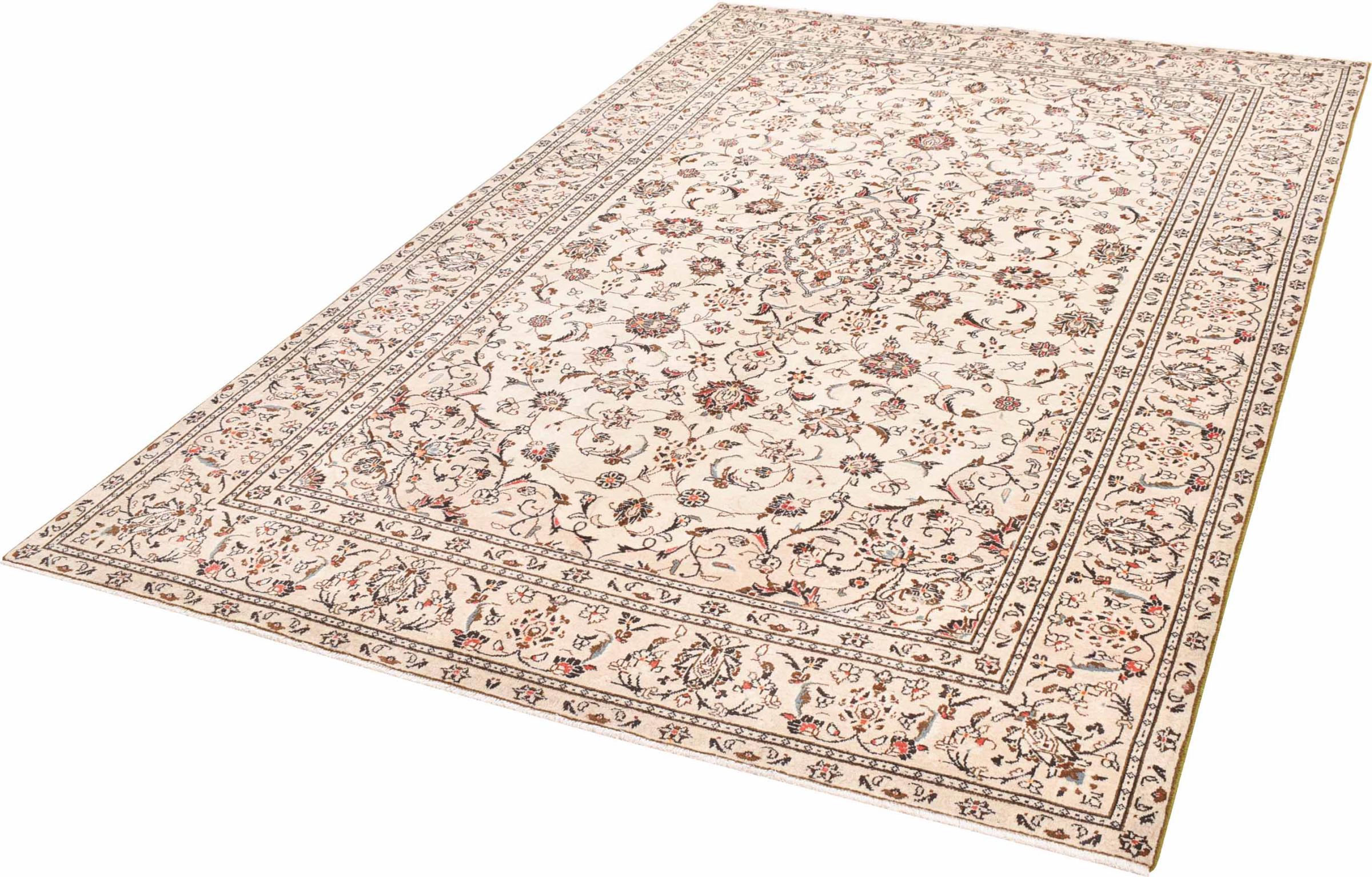 This carpet from Kashan (Keshan) is held in its very traditional and typical Persian design with beautiful ornaments. Kashan rugs are highly popular due to their exceptionally elegant design. These carpets originate from Kashan, a city on the ancient Silk Road. This carpet has been knotted by hand from high grade sheep wool and is going to be an one-of-a-kind highlight in your home.