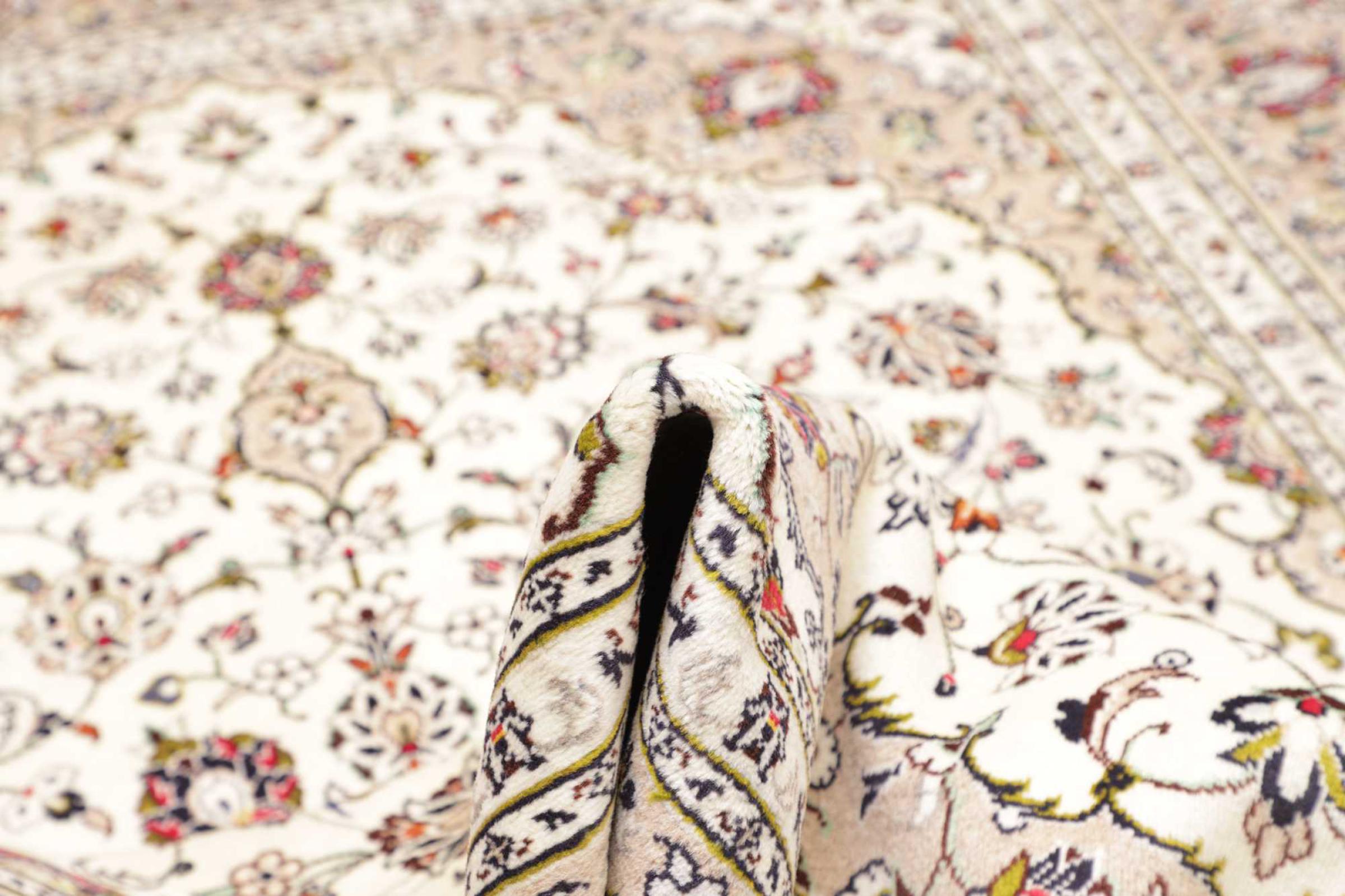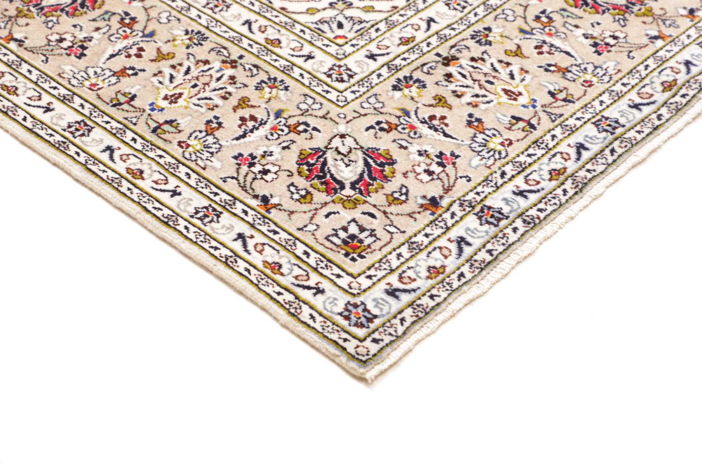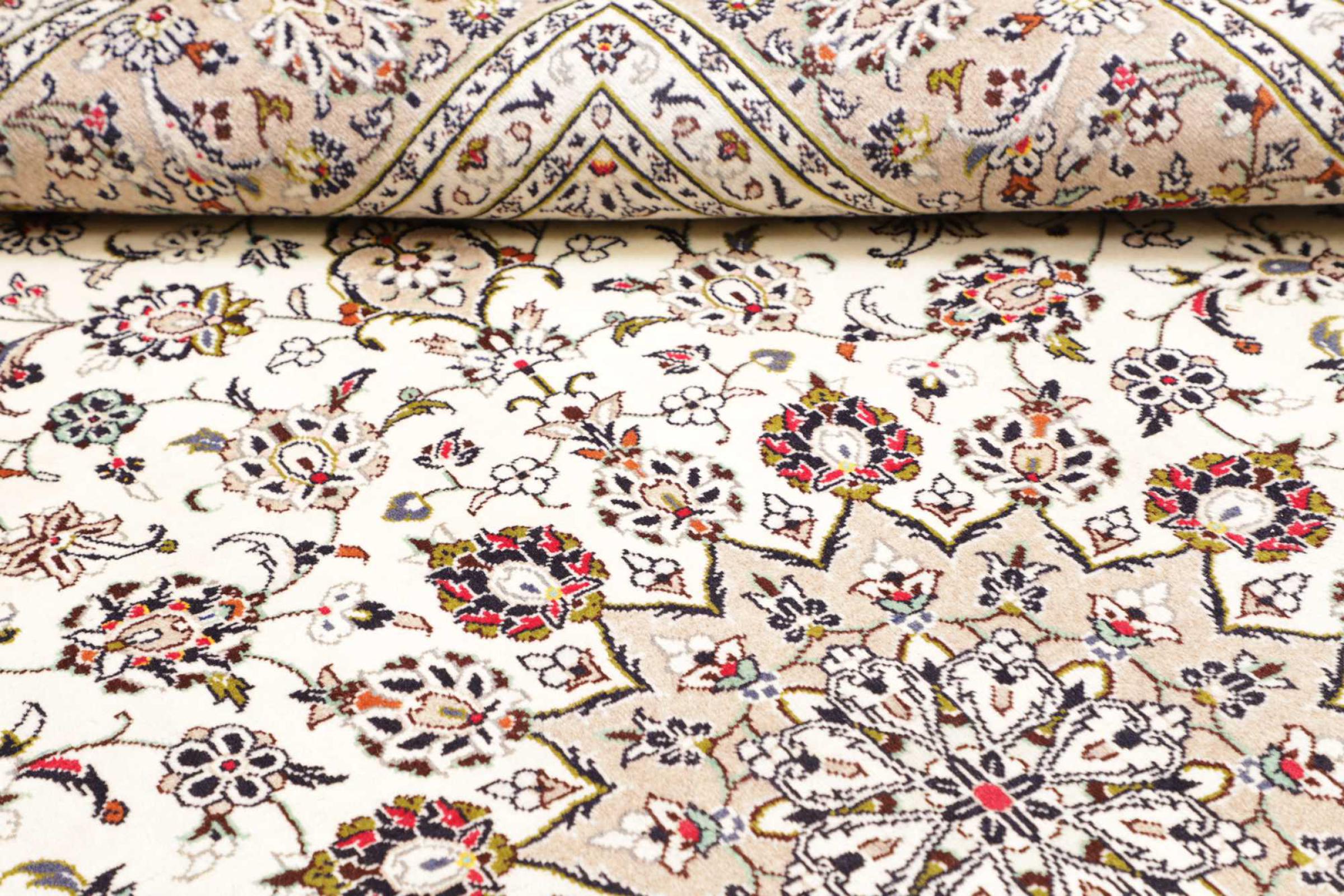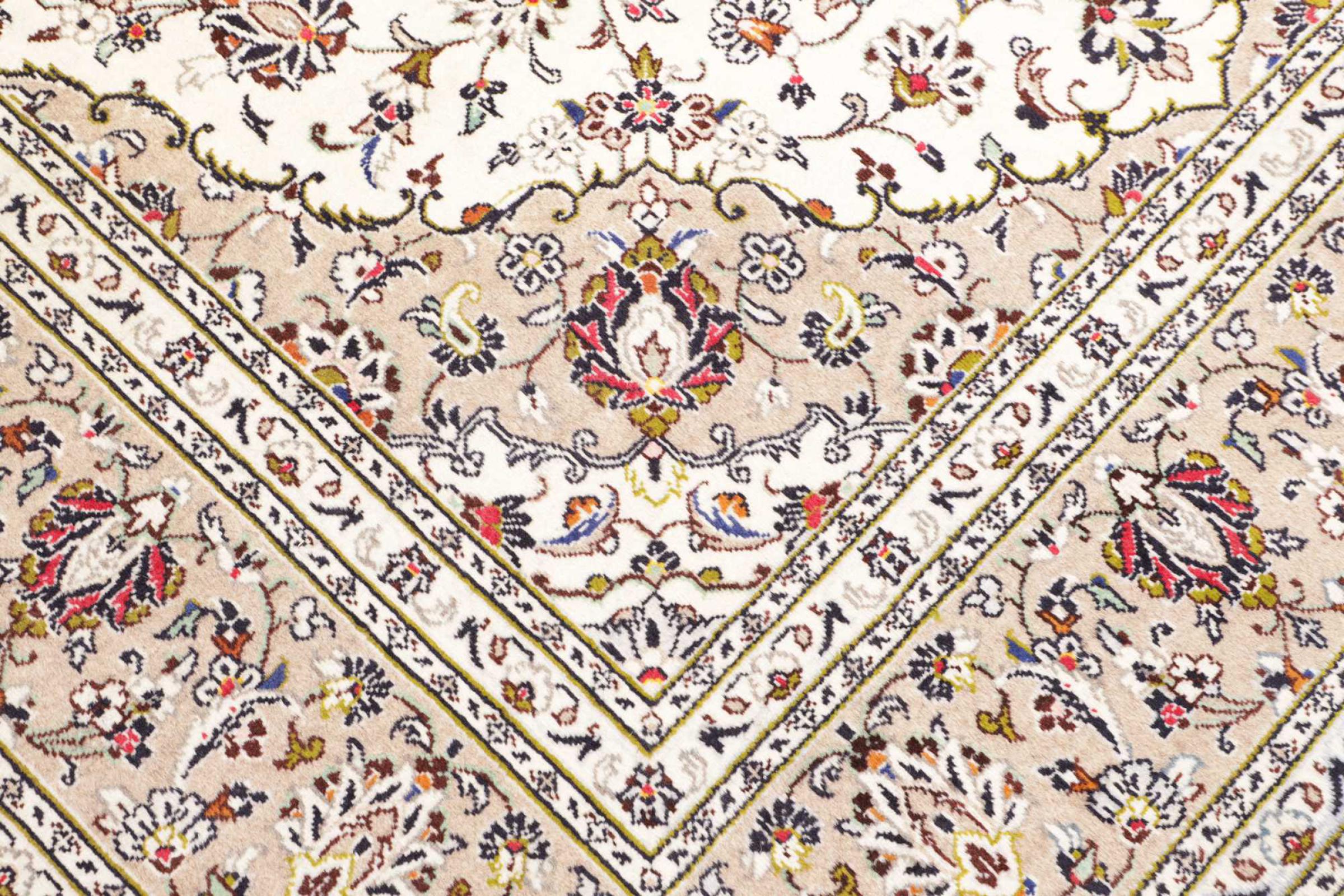 This carpet from Kashan (Keshan) is held in its very traditional and typical Persian design with beautiful ornaments. Kashan rugs are highly popular due to their exceptionally elegant design. These carpets originate from Kashan, a city on the ancient Silk Road. This carpet has been knotted by hand from high grade sheep wool and is going to be an one-of-a-kind highlight in your home.