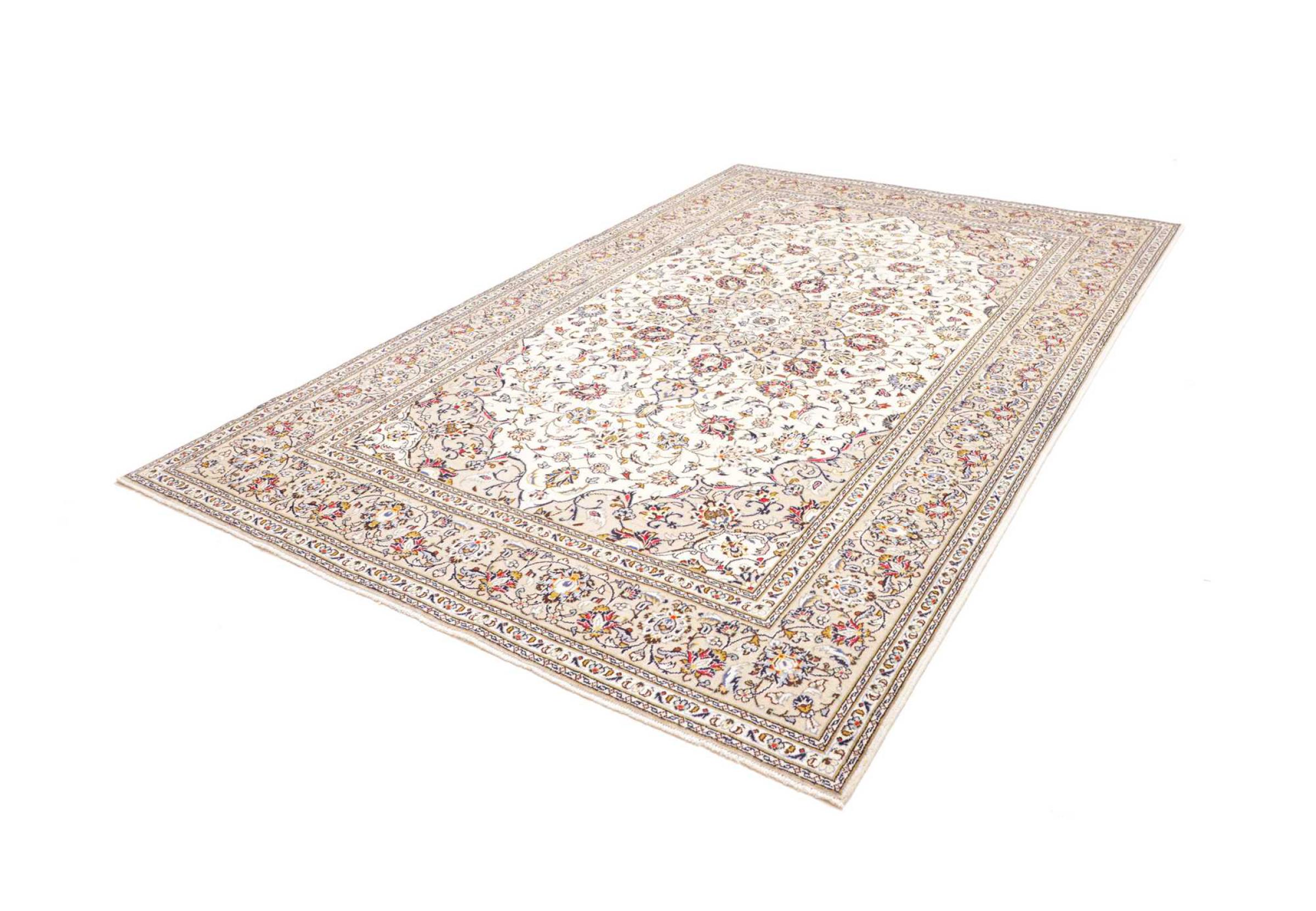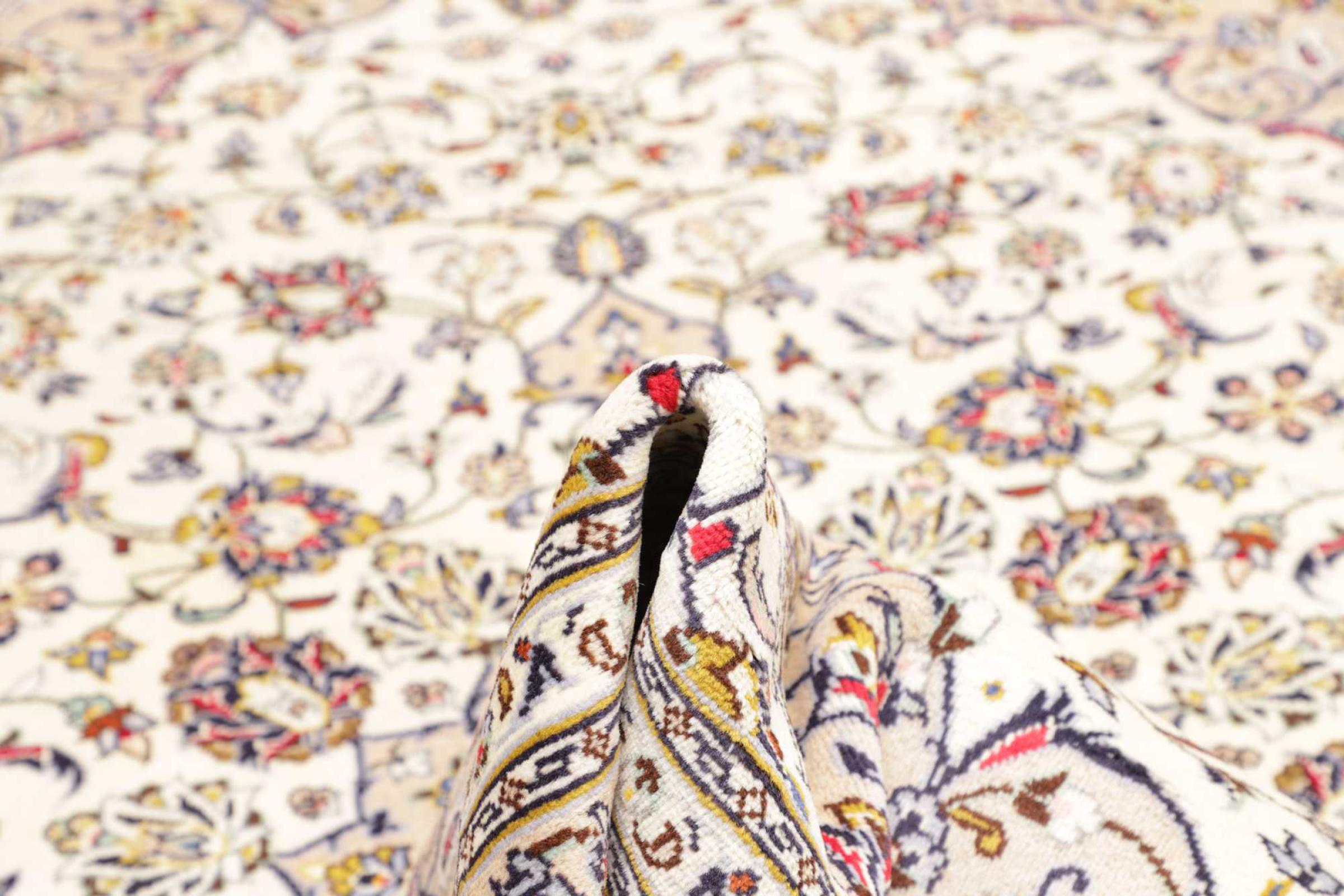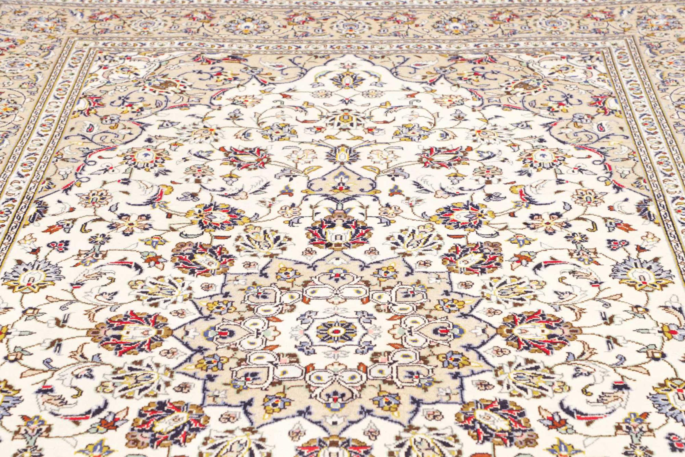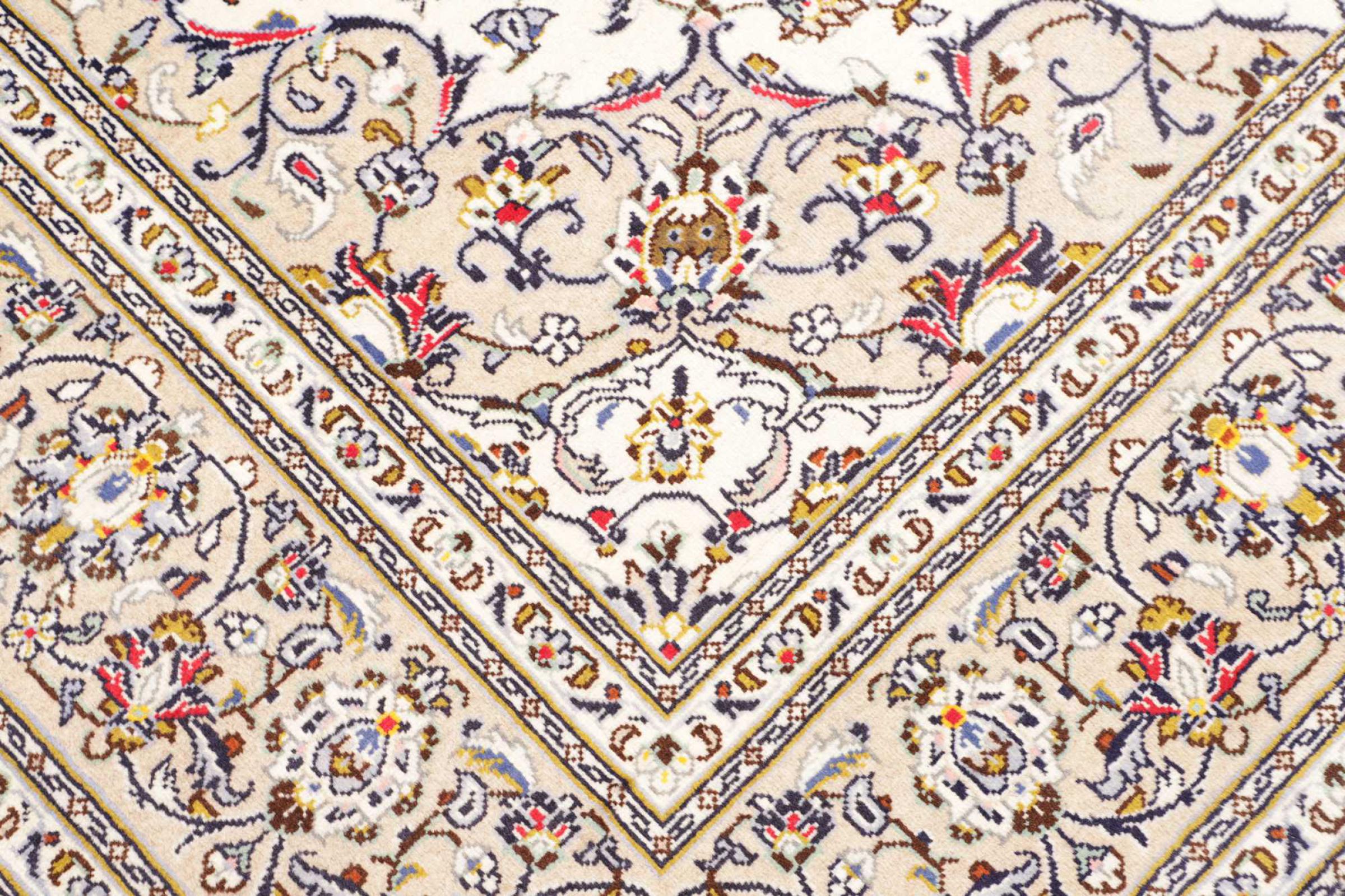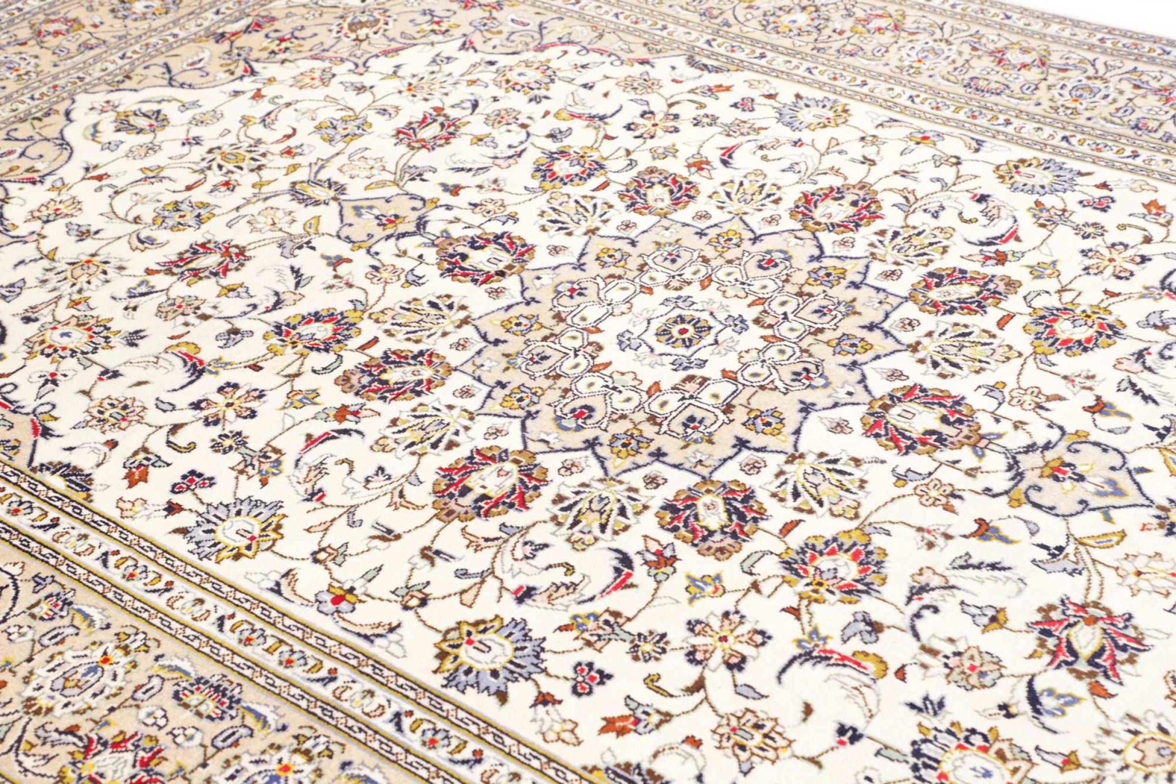 This carpet from Kashan (Keshan) is held in its very traditional and typical Persian design with beautiful ornaments. Kashan rugs are highly popular due to their exceptionally elegant design. These carpets originate from Kashan, a city on the ancient Silk Road. This carpet has been knotted by hand from high grade sheep wool and is going to be an one-of-a-kind highlight in your home.