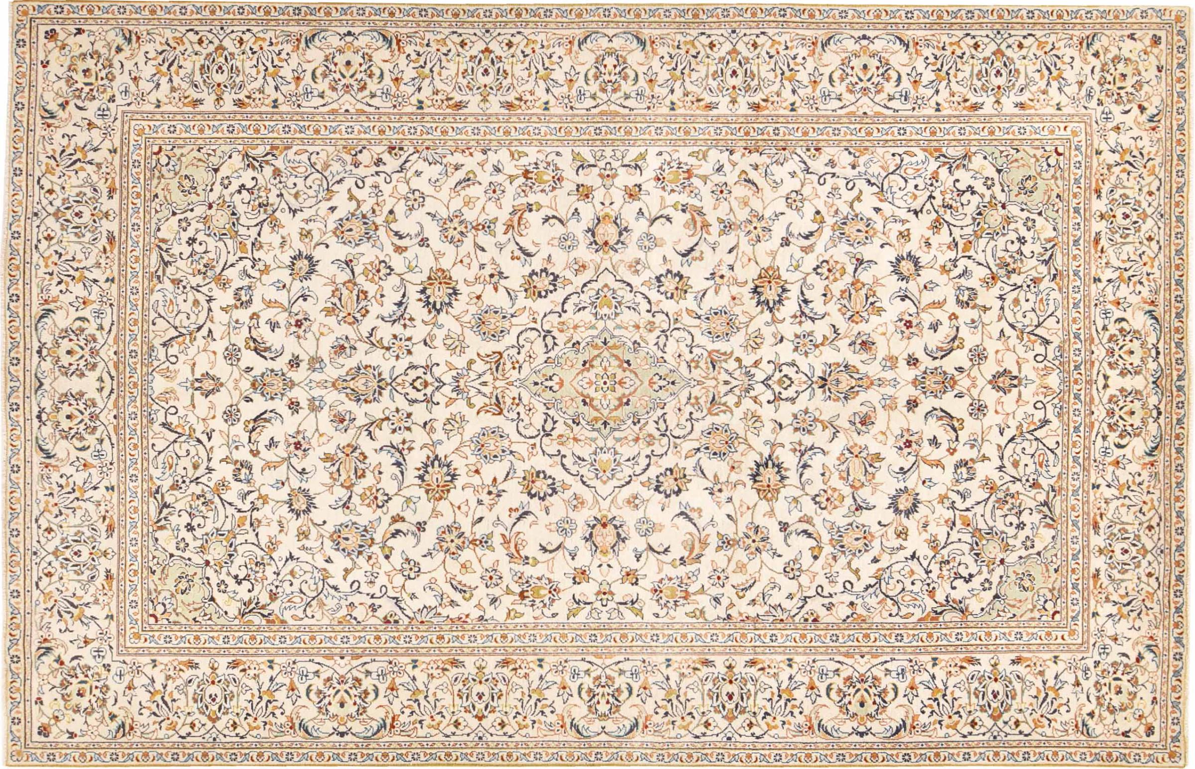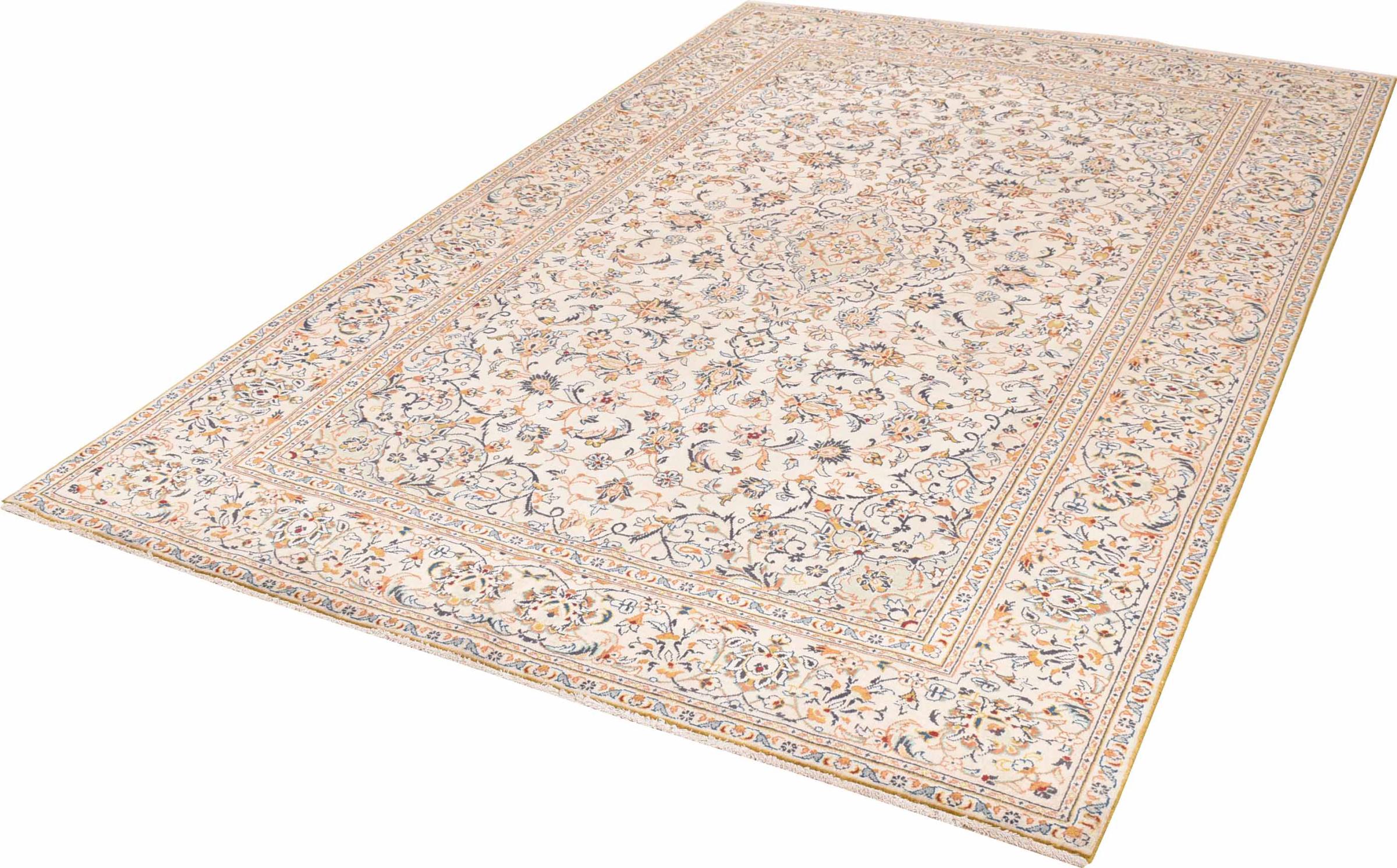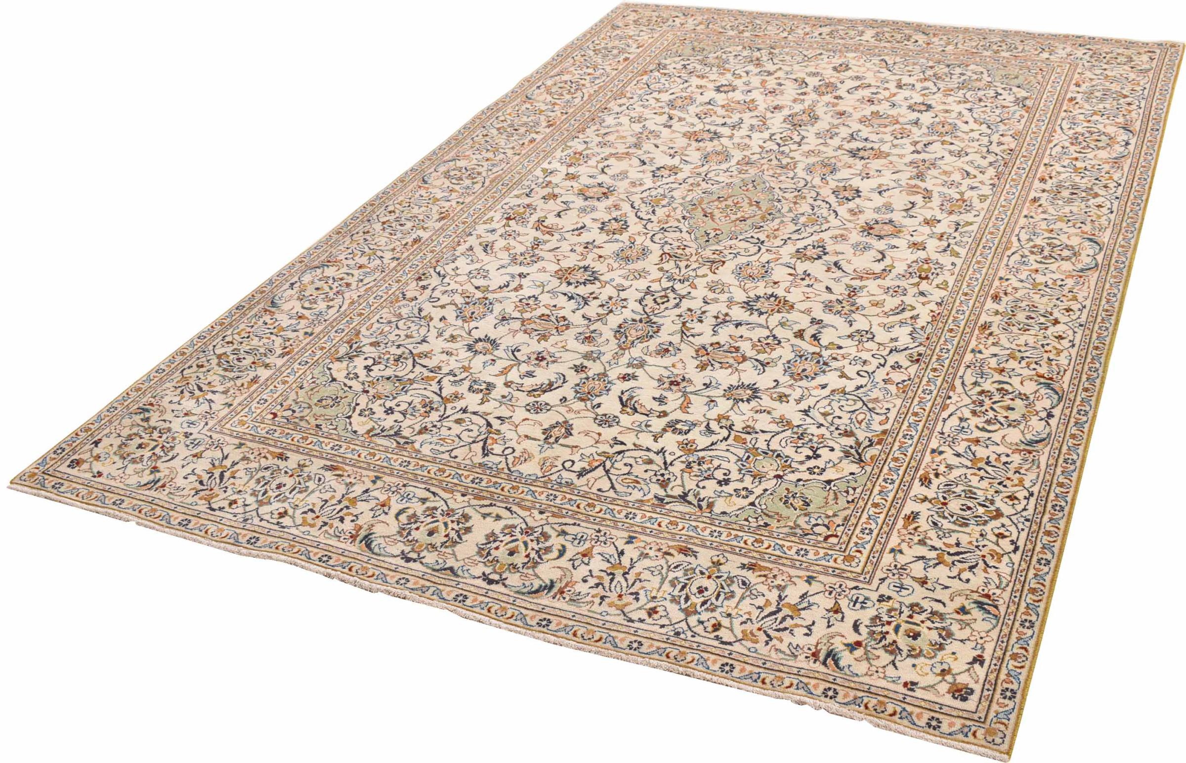 This carpet from Kashan (Keshan) is held in its very traditional and typical Persian design with beautiful ornaments. Kashan rugs are highly popular due to their exceptionally elegant design. These carpets originate from Kashan, a city on the ancient Silk Road. This carpet has been knotted by hand from high grade sheep wool and is going to be an one-of-a-kind highlight in your home.