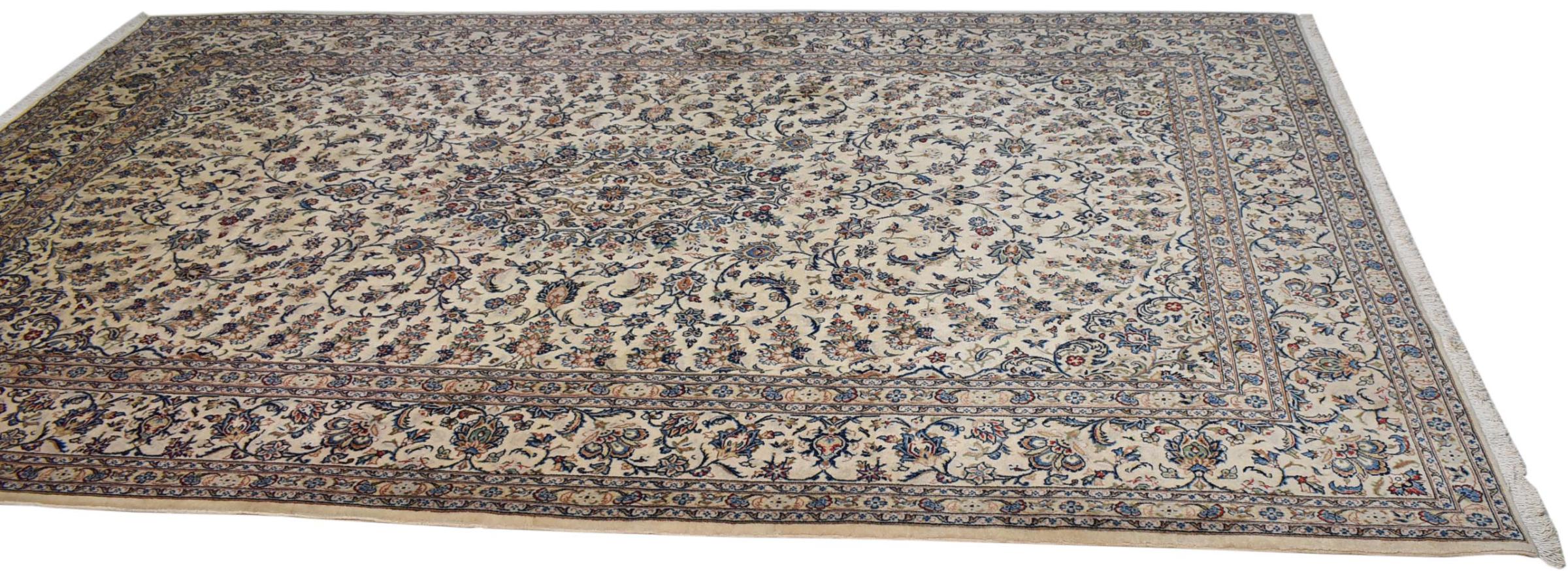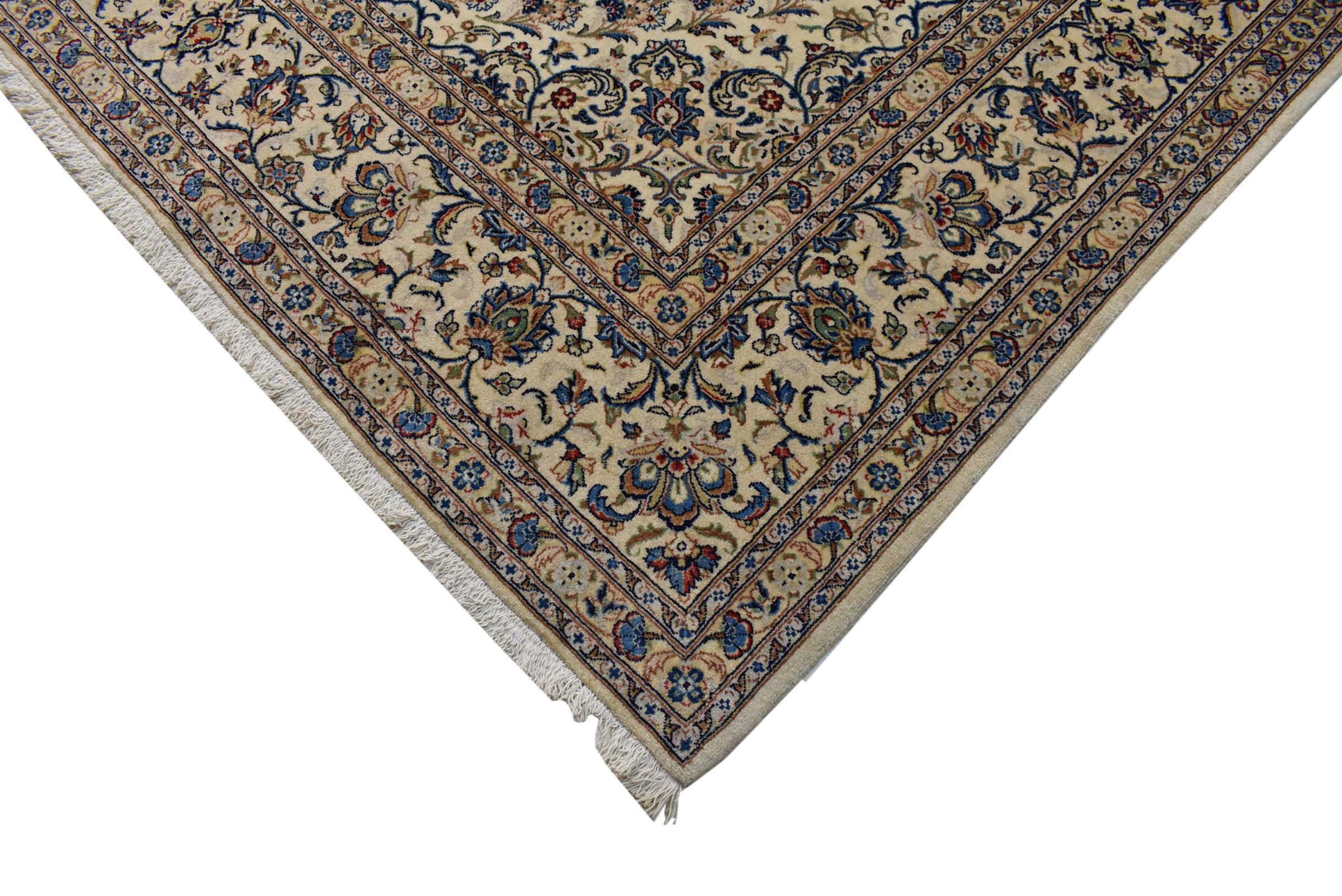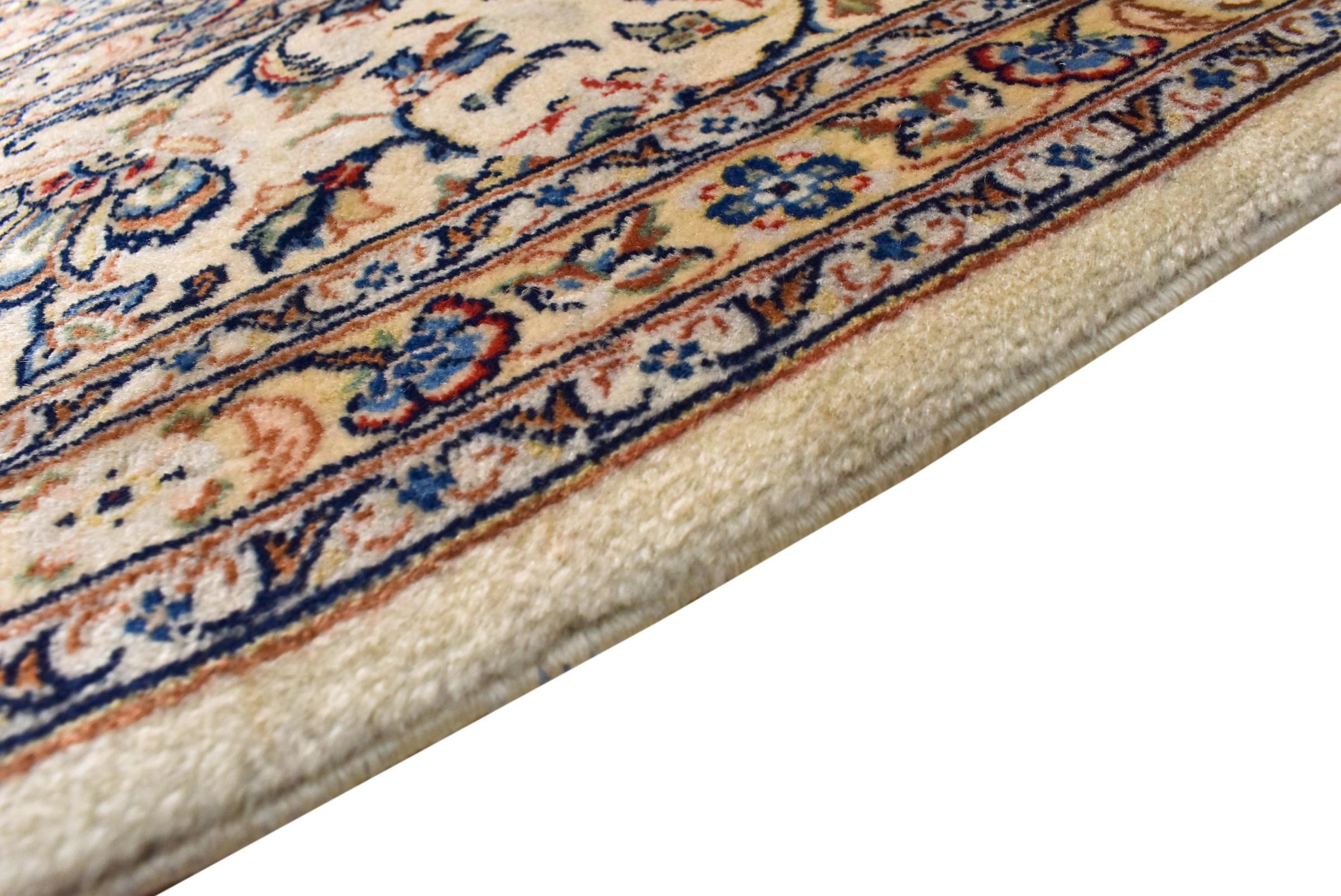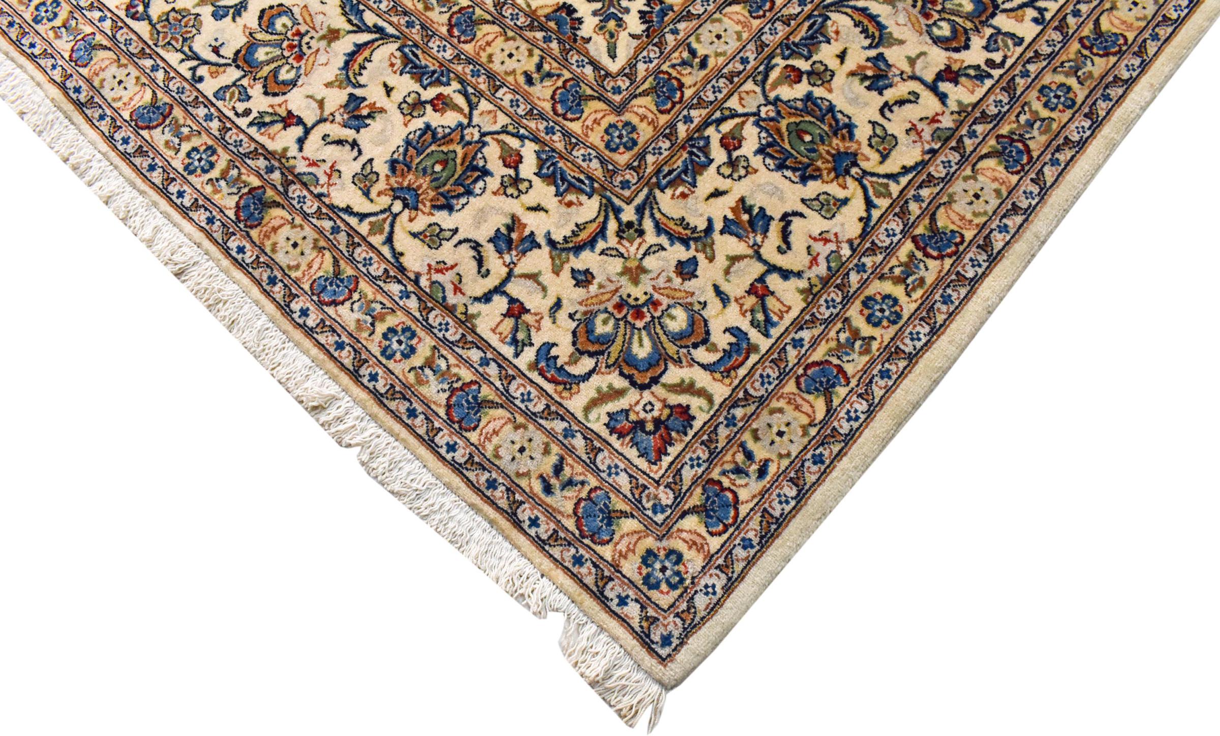 This carpet from Kashan (Keshan) is held in its very traditional and typical Persian design with beautiful ornaments. Kashan rugs are highly popular due to their exceptionally elegant design. These carpets originate from Kashan, a city on the ancient Silk Road. This carpet has been knotted by hand from high grade sheep wool and is going to be an one-of-a-kind highlight in your home.