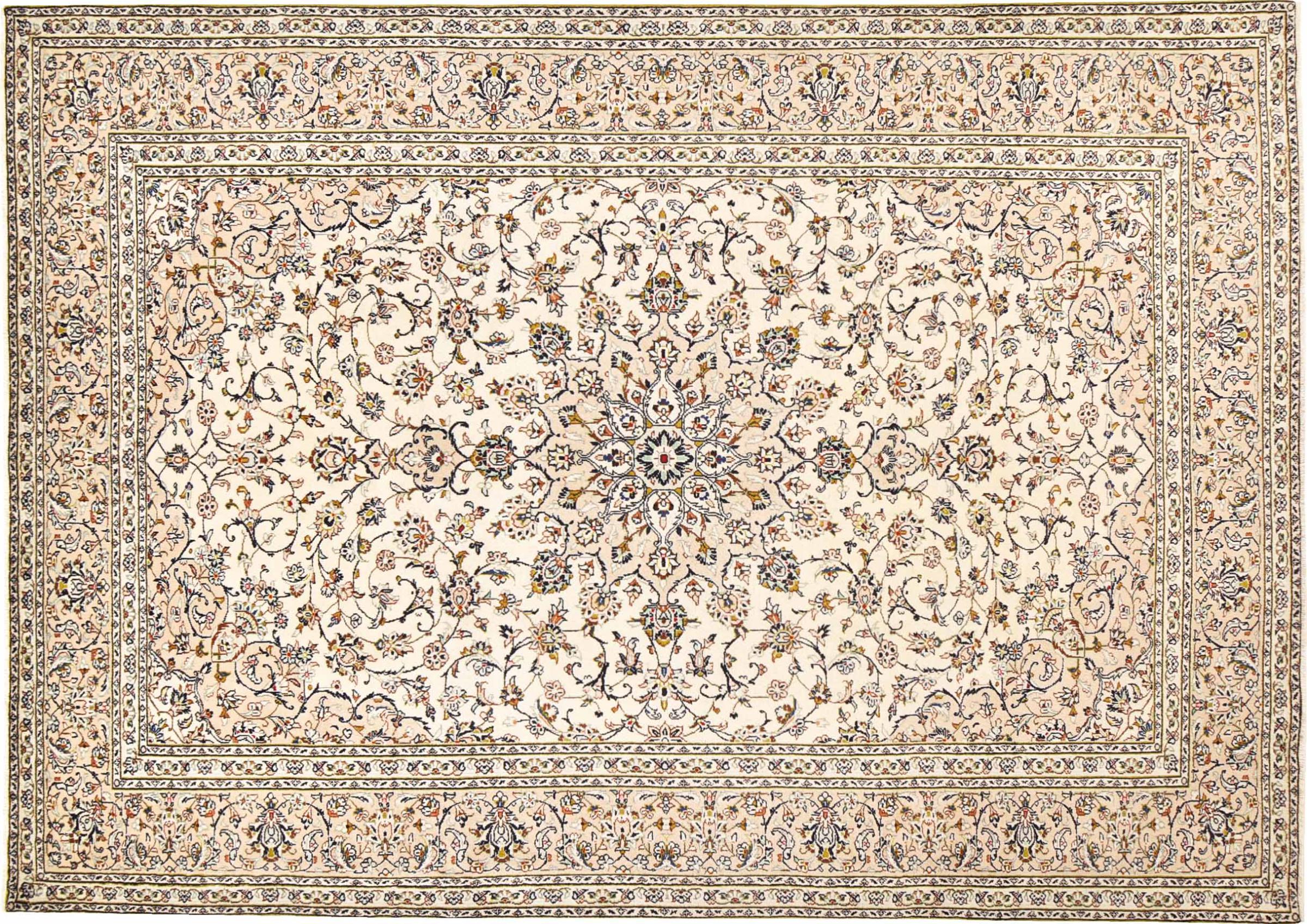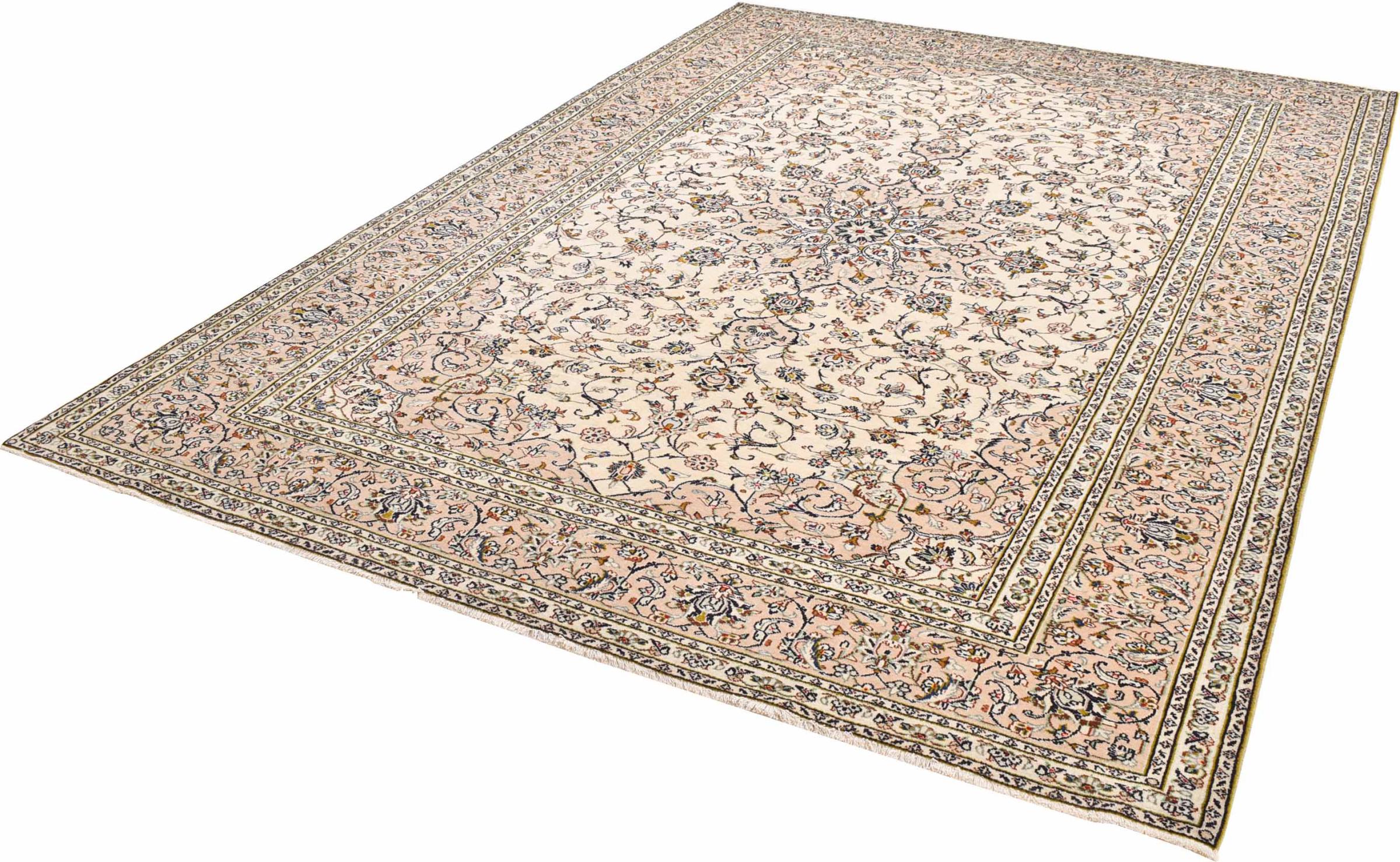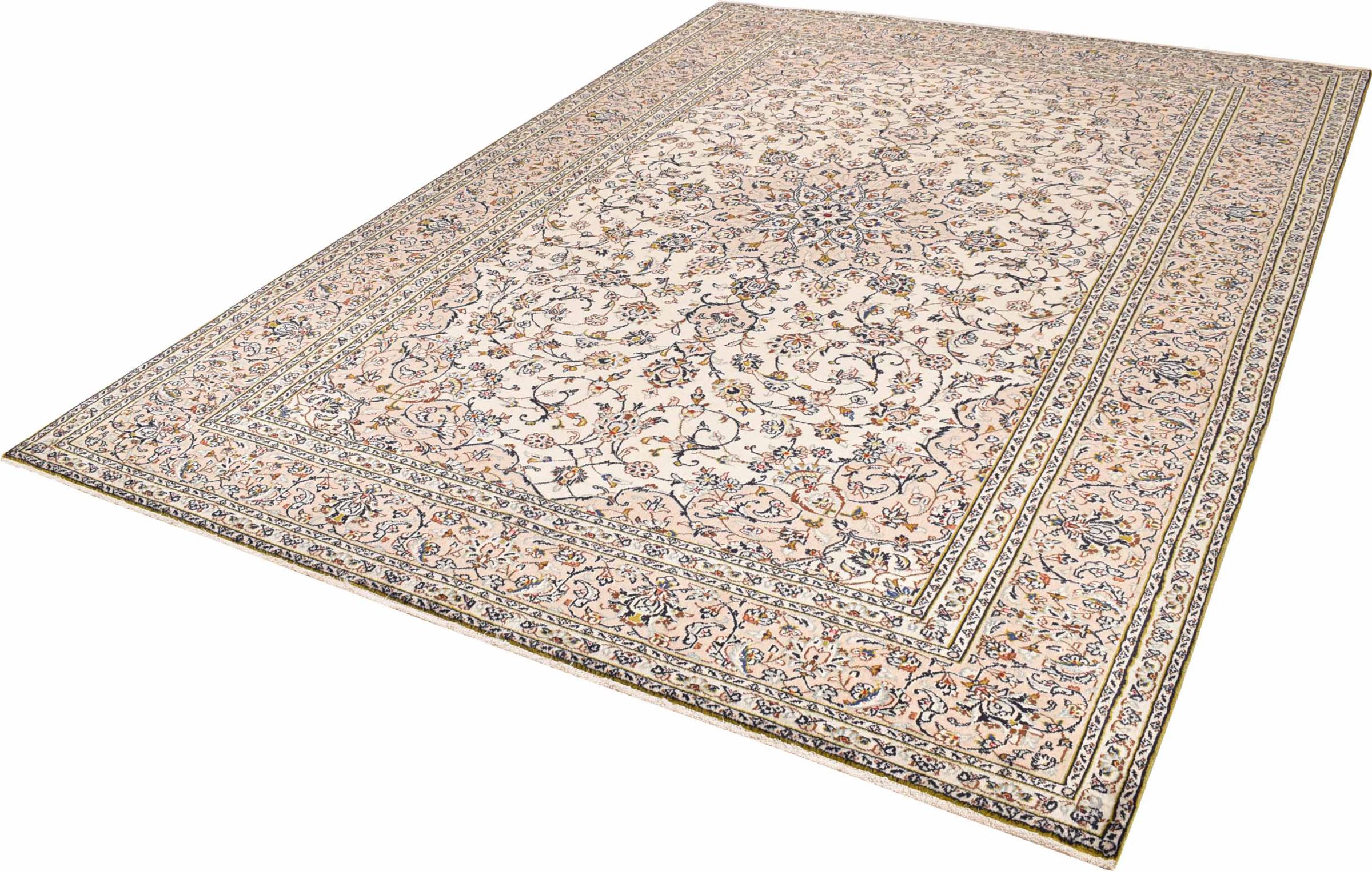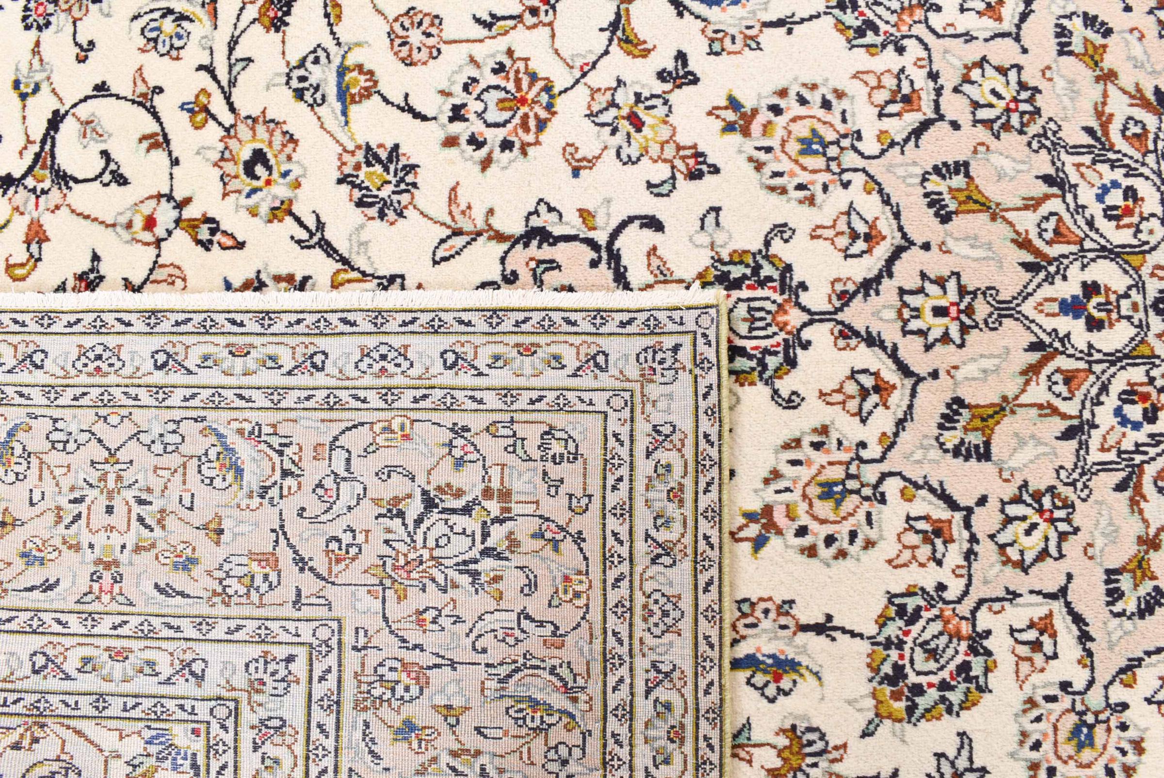 This carpet from Kashan (Keshan) is held in its very traditional and typical Persian design with beautiful ornaments. Kashan rugs are highly popular due to their exceptionally elegant design. These carpets originate from Kashan, a city on the ancient Silk Road. This carpet has been knotted by hand from high grade sheep wool and is going to be an one-of-a-kind highlight in your home.