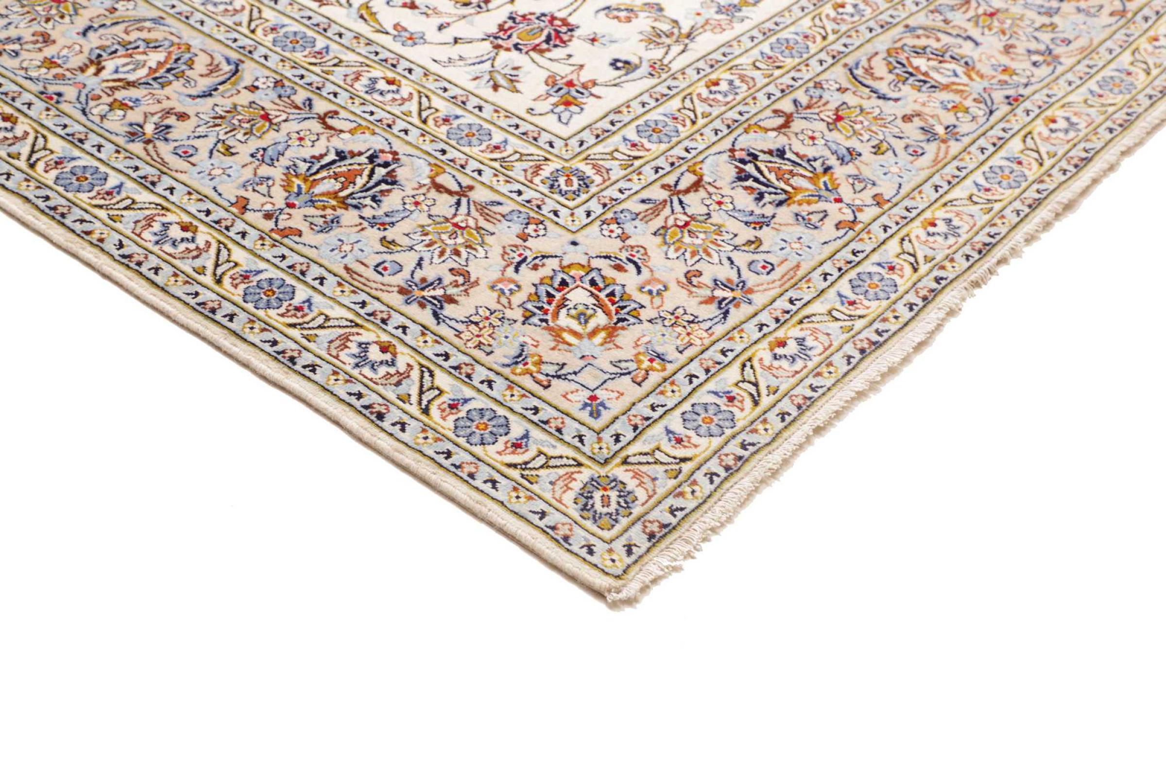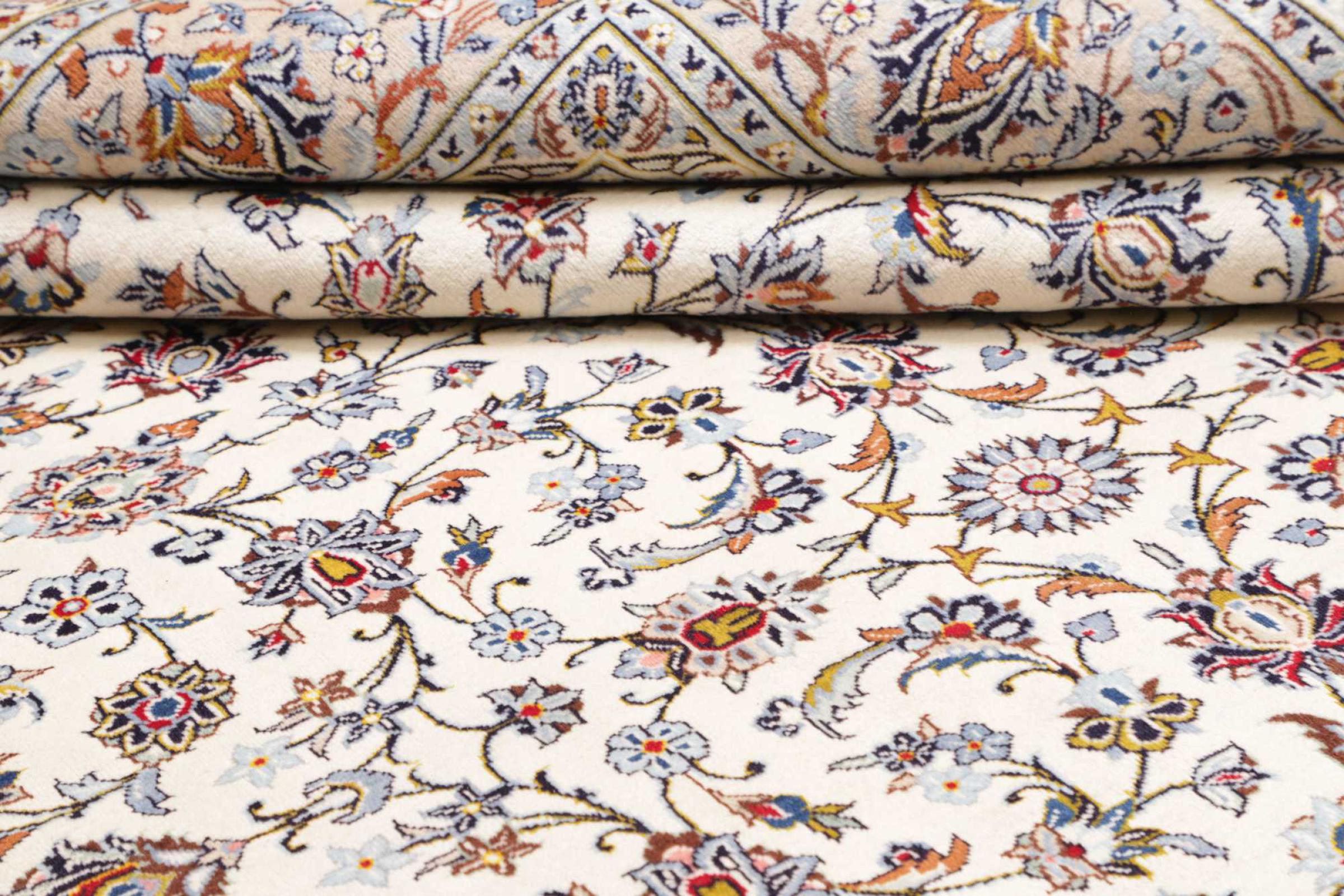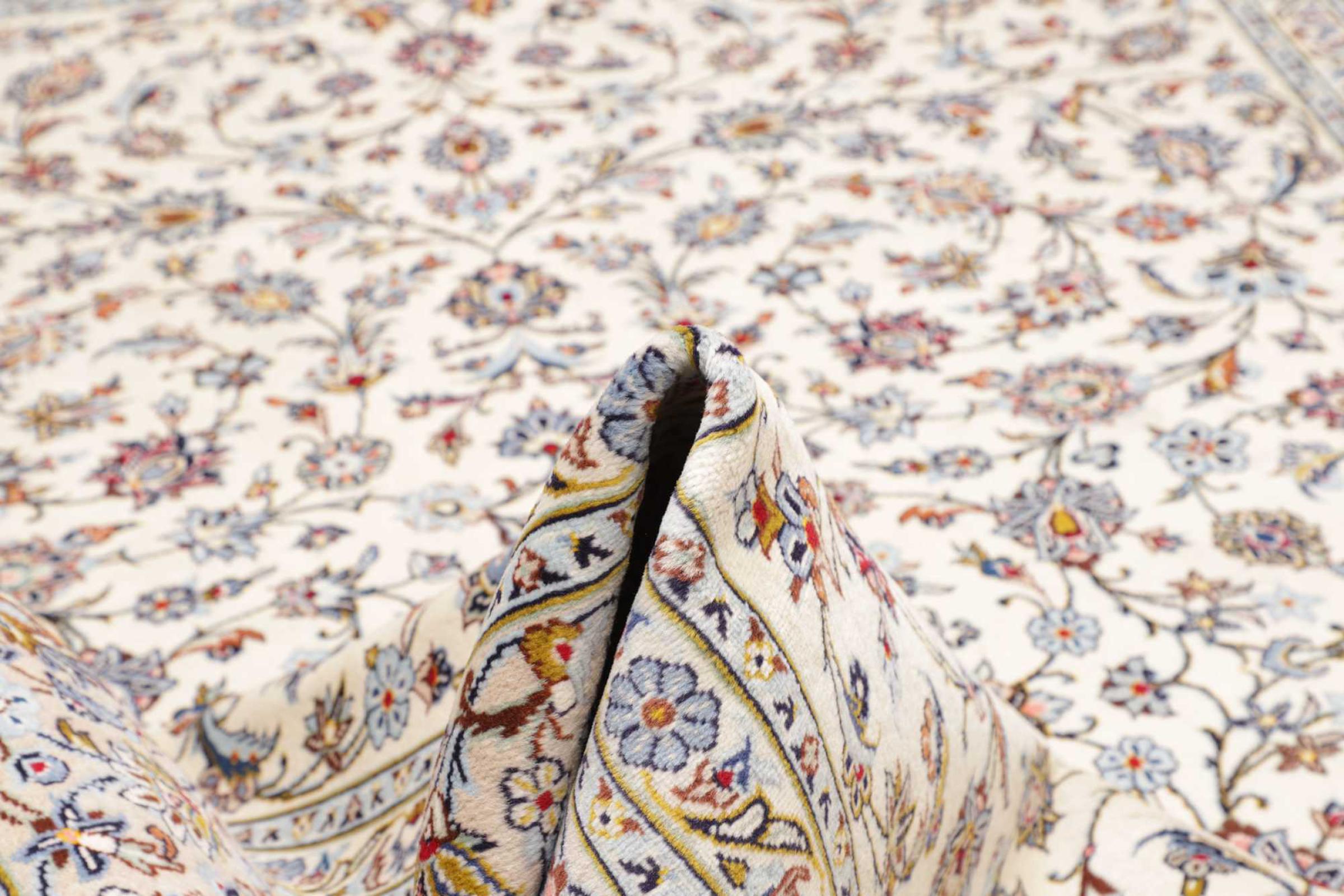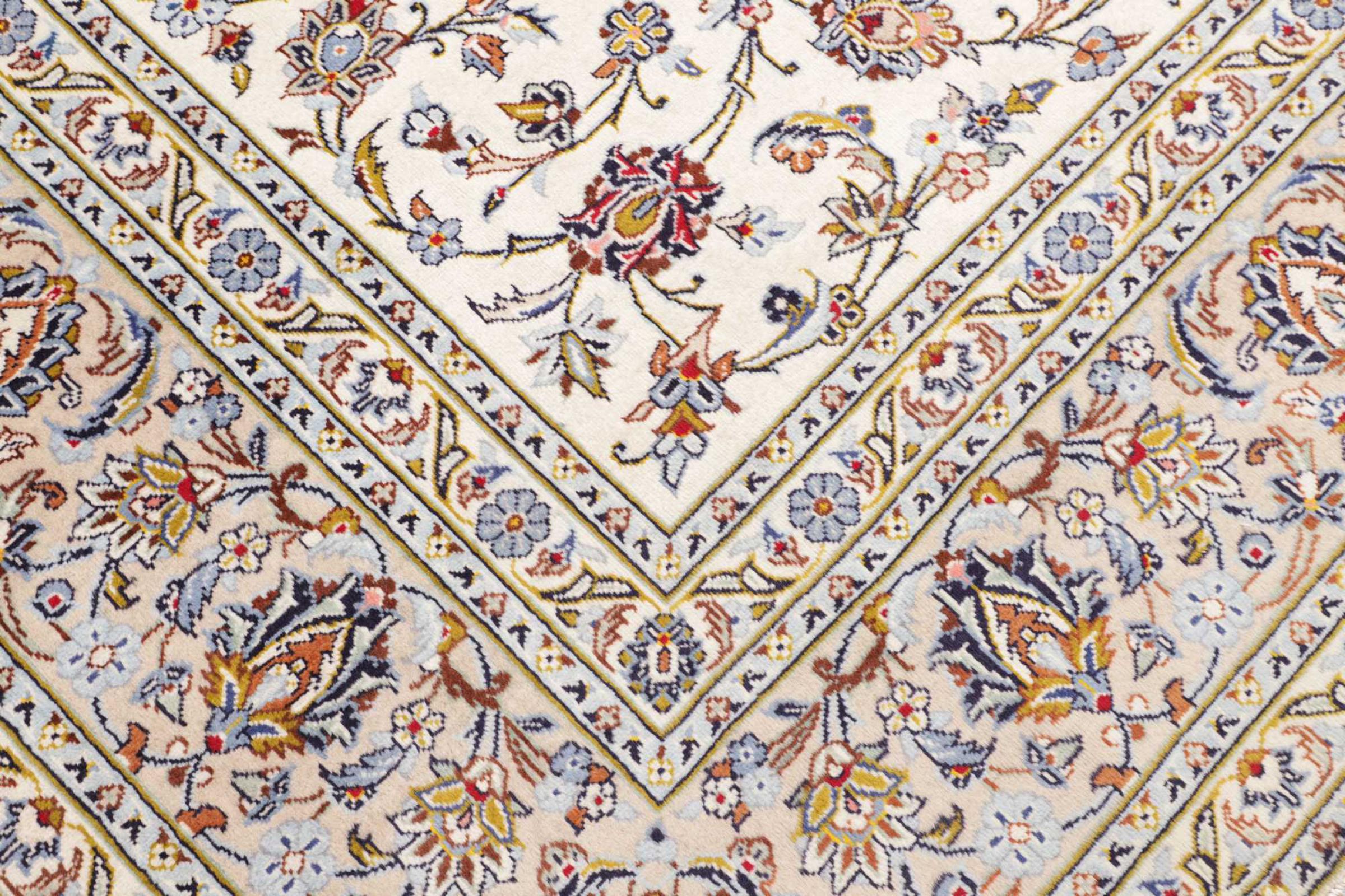This carpet from Kashan (Keshan) is held in its very traditional and typical Persian design with beautiful ornaments. Kashan rugs are highly popular due to their exceptionally elegant design. These carpets originate from Kashan, a city on the ancient Silk Road. This carpet has been knotted by hand from high grade sheep wool and is going to be an one-of-a-kind highlight in your home.