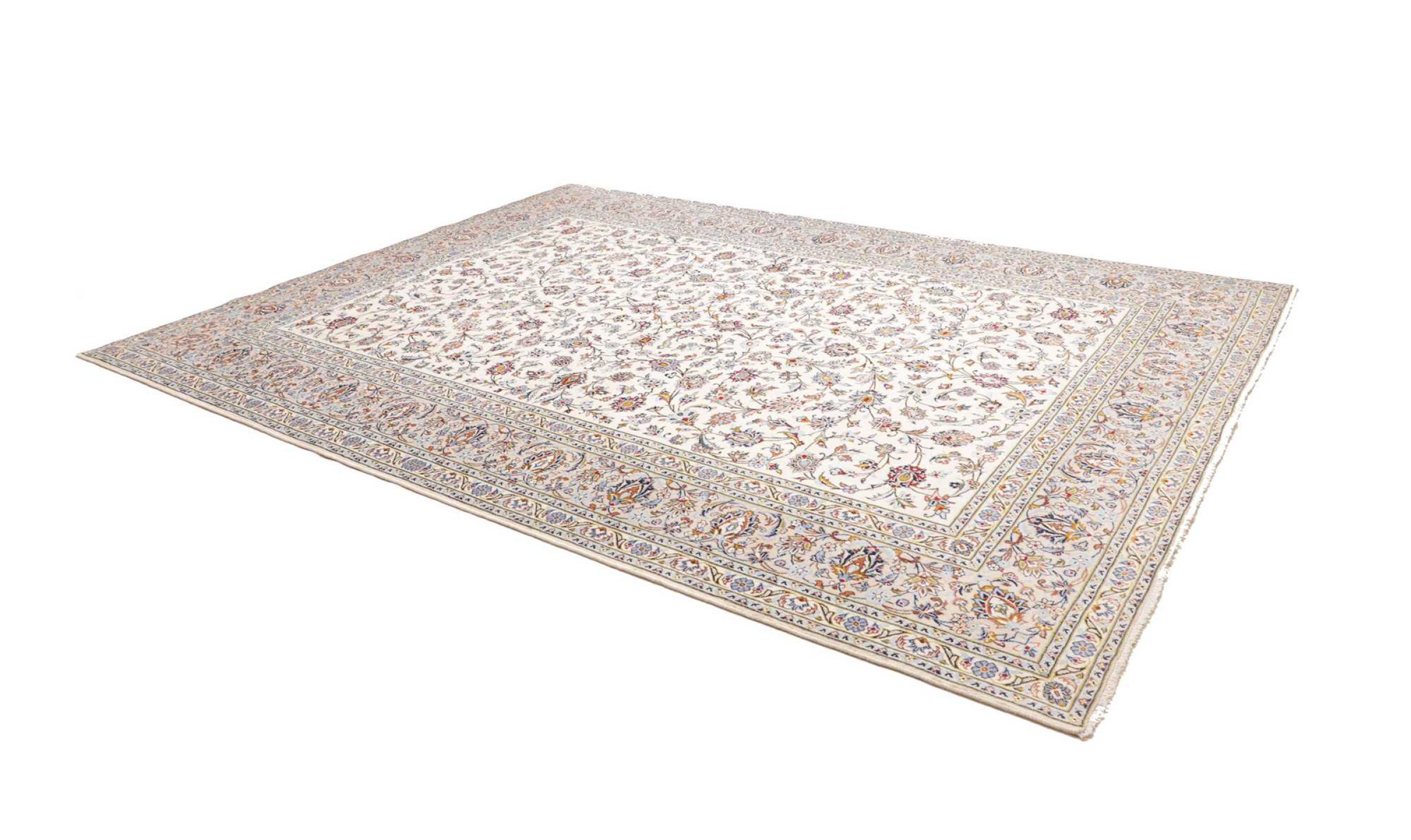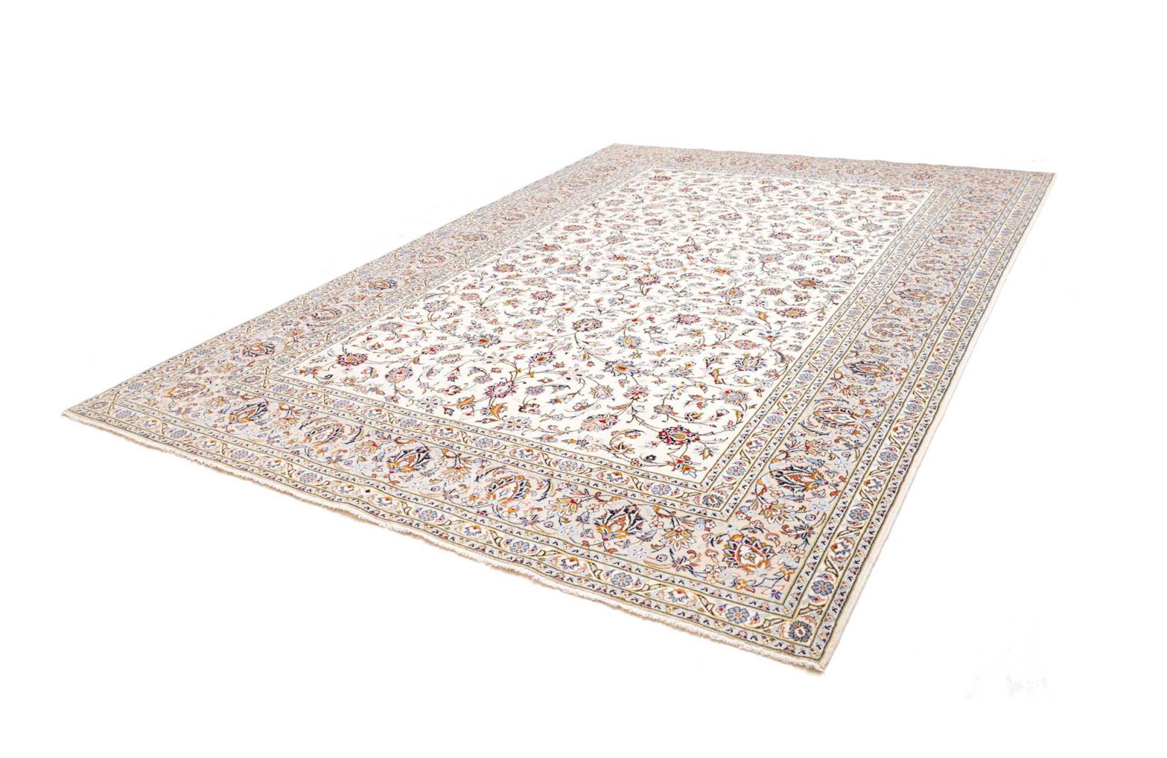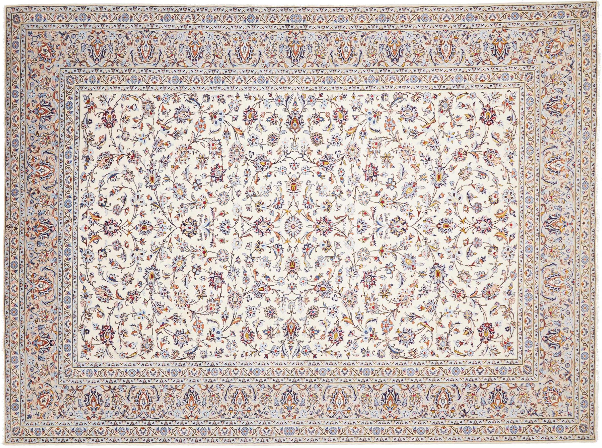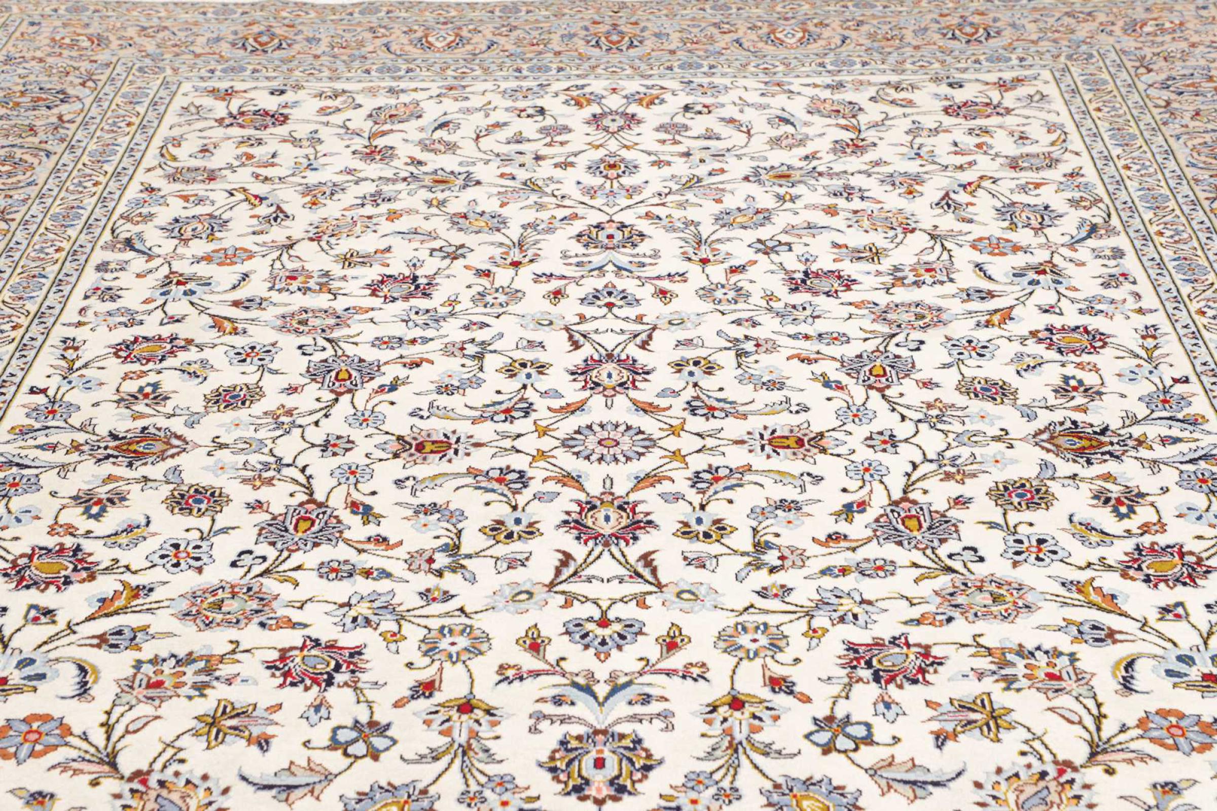 This carpet from Kashan (Keshan) is held in its very traditional and typical Persian design with beautiful ornaments. Kashan rugs are highly popular due to their exceptionally elegant design. These carpets originate from Kashan, a city on the ancient Silk Road. This carpet has been knotted by hand from high grade sheep wool and is going to be an one-of-a-kind highlight in your home.