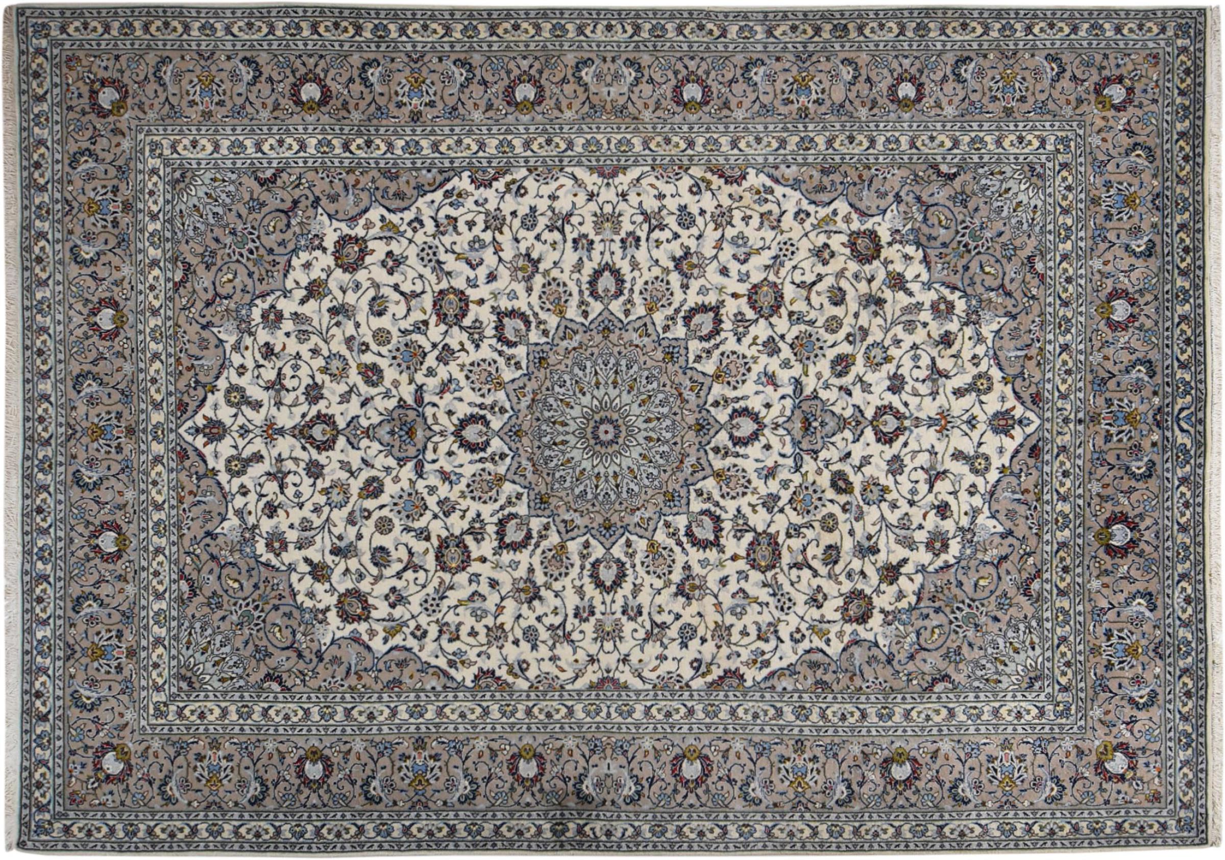 This carpet from Kashan (Keshan) is held in its very traditional and typical Persian design with beautiful ornaments. Kashan rugs are highly popular due to their exceptionally elegant design. These carpets originate from Kashan, a city on the ancient Silk Road. This carpet has been knotted by hand from high grade sheep wool and is going to be an one-of-a-kind highlight in your home.