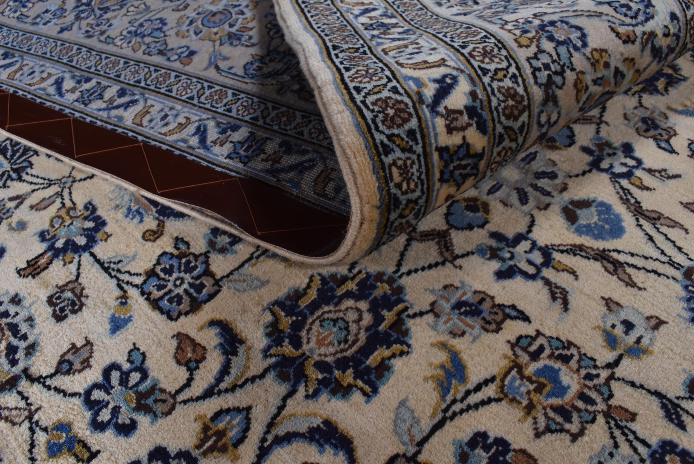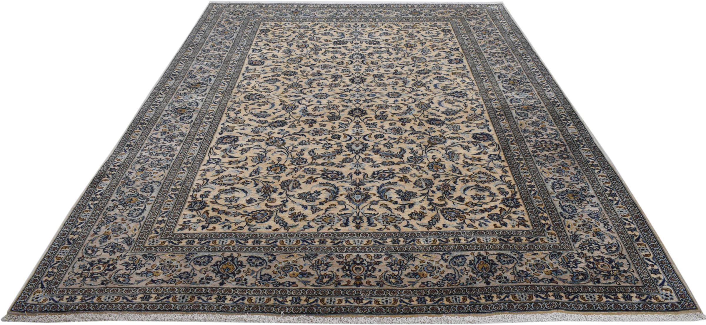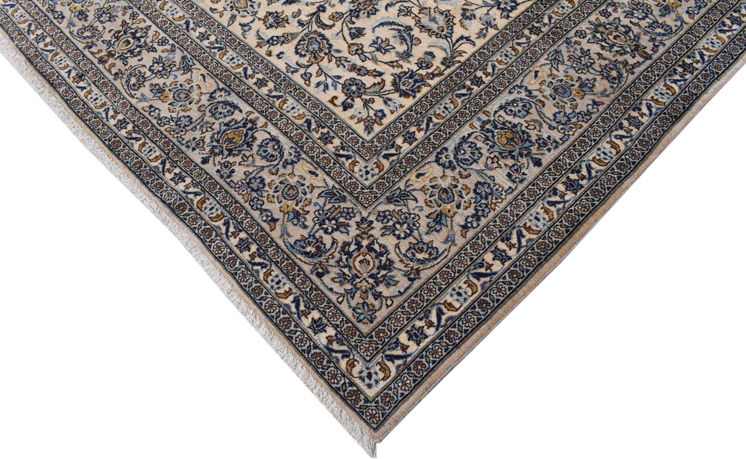 This carpet from Kashan (Keshan) is held in its very traditional and typical Persian design with beautiful ornaments. Kashan rugs are highly popular due to their exceptionally elegant design. These carpets originate from Kashan, a city on the ancient Silk Road. This carpet has been knotted by hand from high grade sheep wool and is going to be an one-of-a-kind highlight in your home.