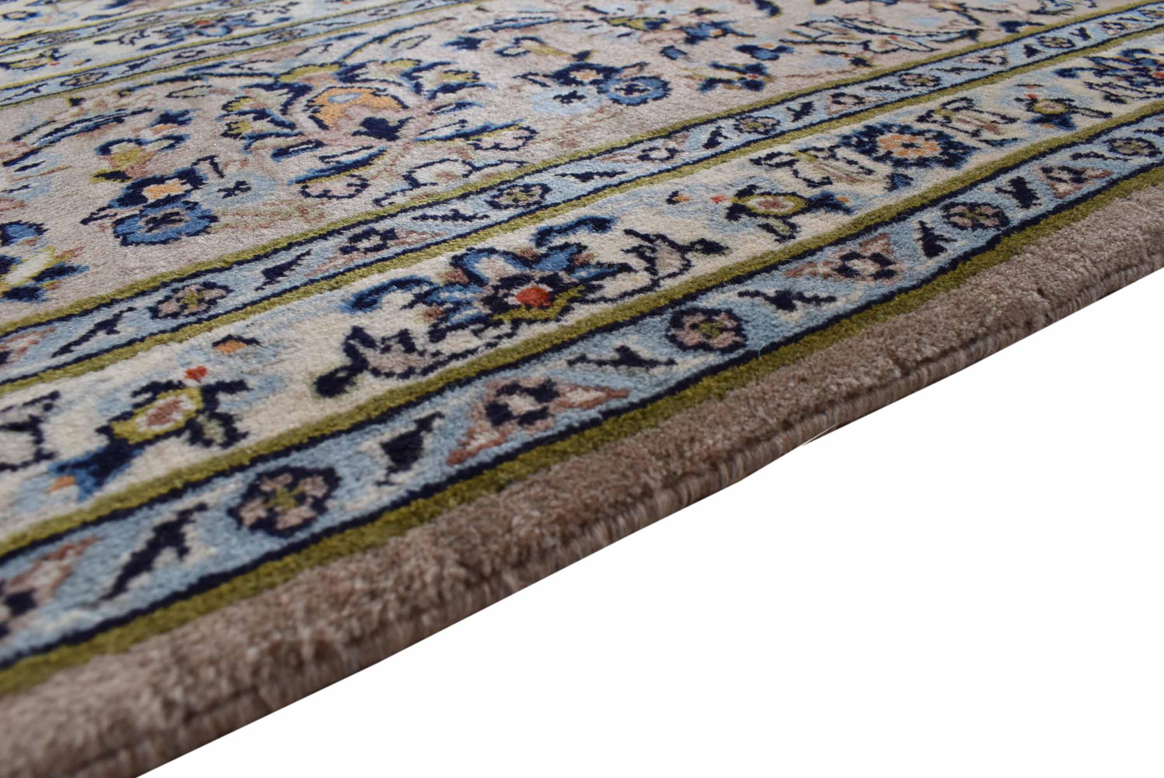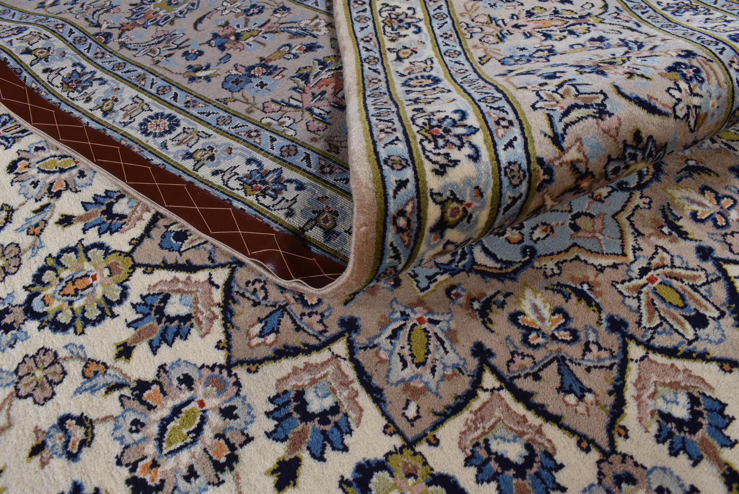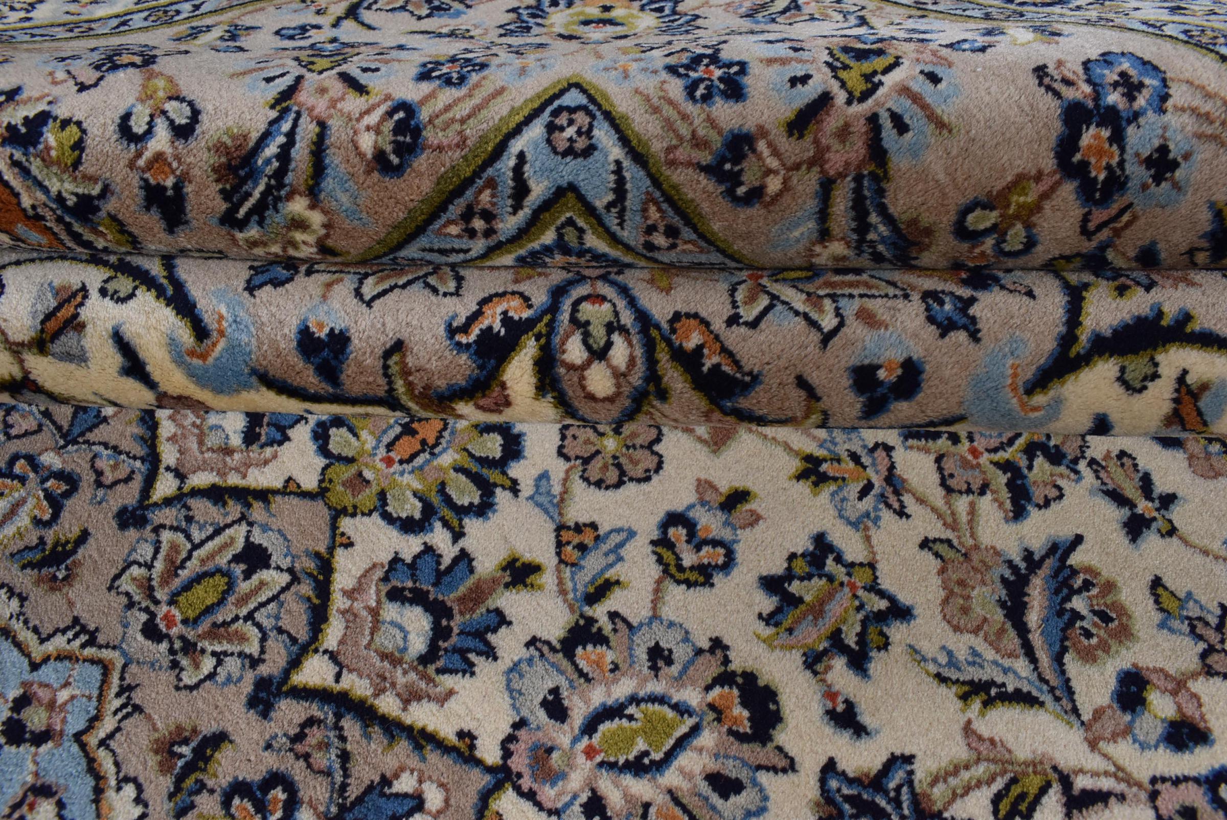 This carpet from Kashan (Keshan) is held in its very traditional and typical Persian design with beautiful ornaments. Kashan rugs are highly popular due to their exceptionally elegant design. These carpets originate from Kashan, a city on the ancient Silk Road. This carpet has been knotted by hand from high grade sheep wool and is going to be an one-of-a-kind highlight in your home.