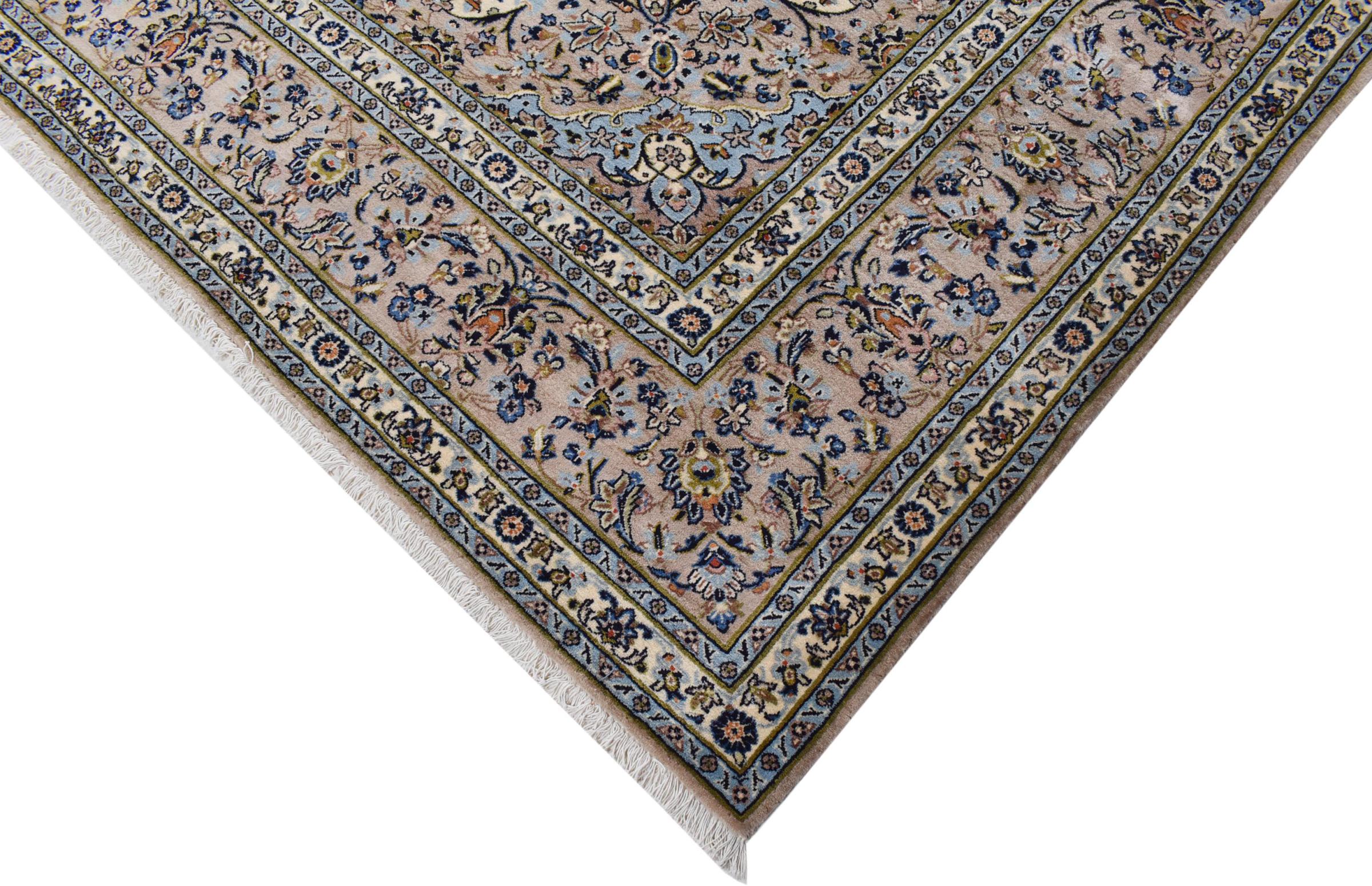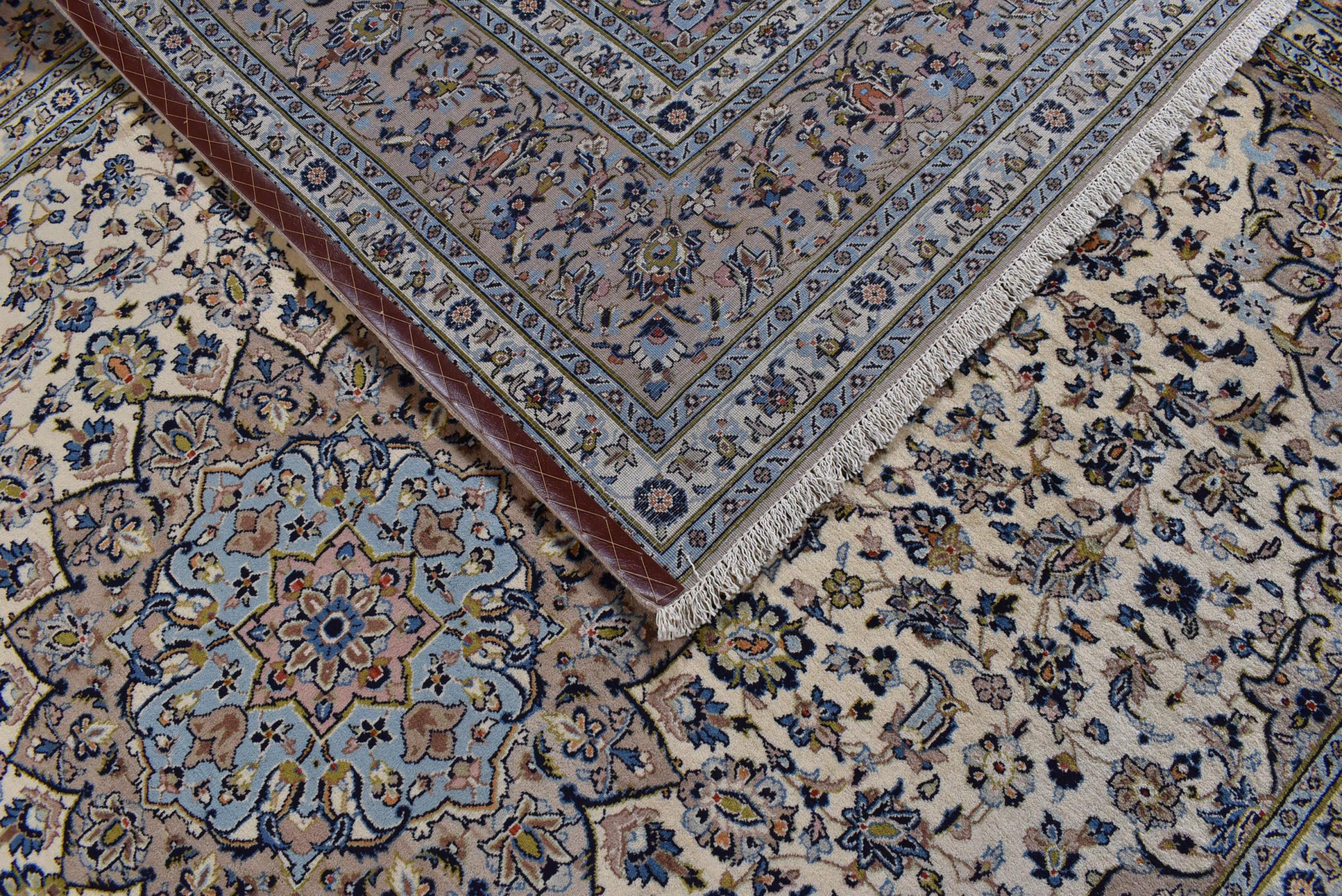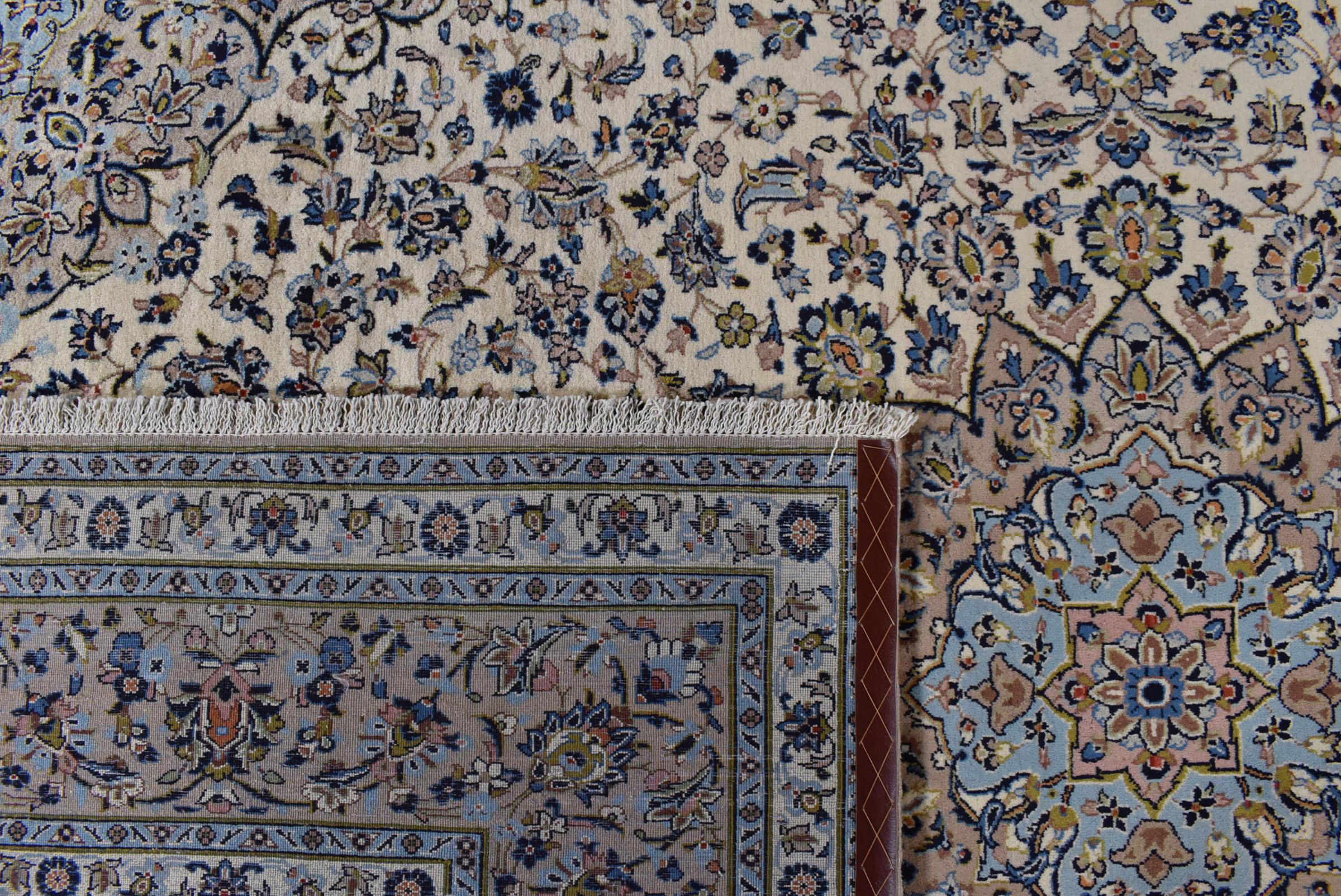 This carpet from Kashan (Keshan) is held in its very traditional and typical Persian design with beautiful ornaments. Kashan rugs are highly popular due to their exceptionally elegant design. These carpets originate from Kashan, a city on the ancient Silk Road. This carpet has been knotted by hand from high grade sheep wool and is going to be an one-of-a-kind highlight in your home.