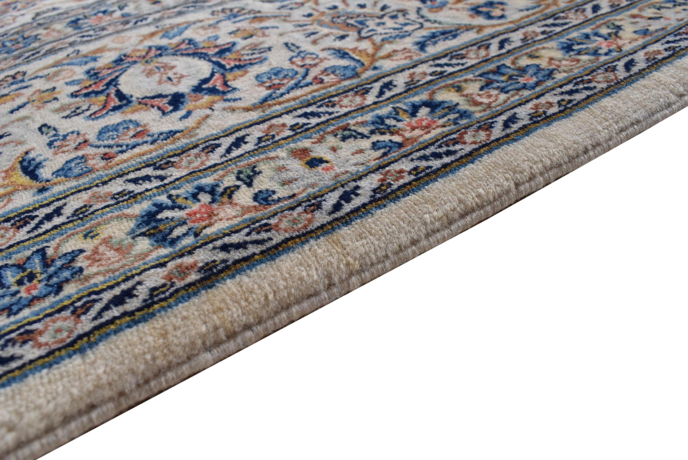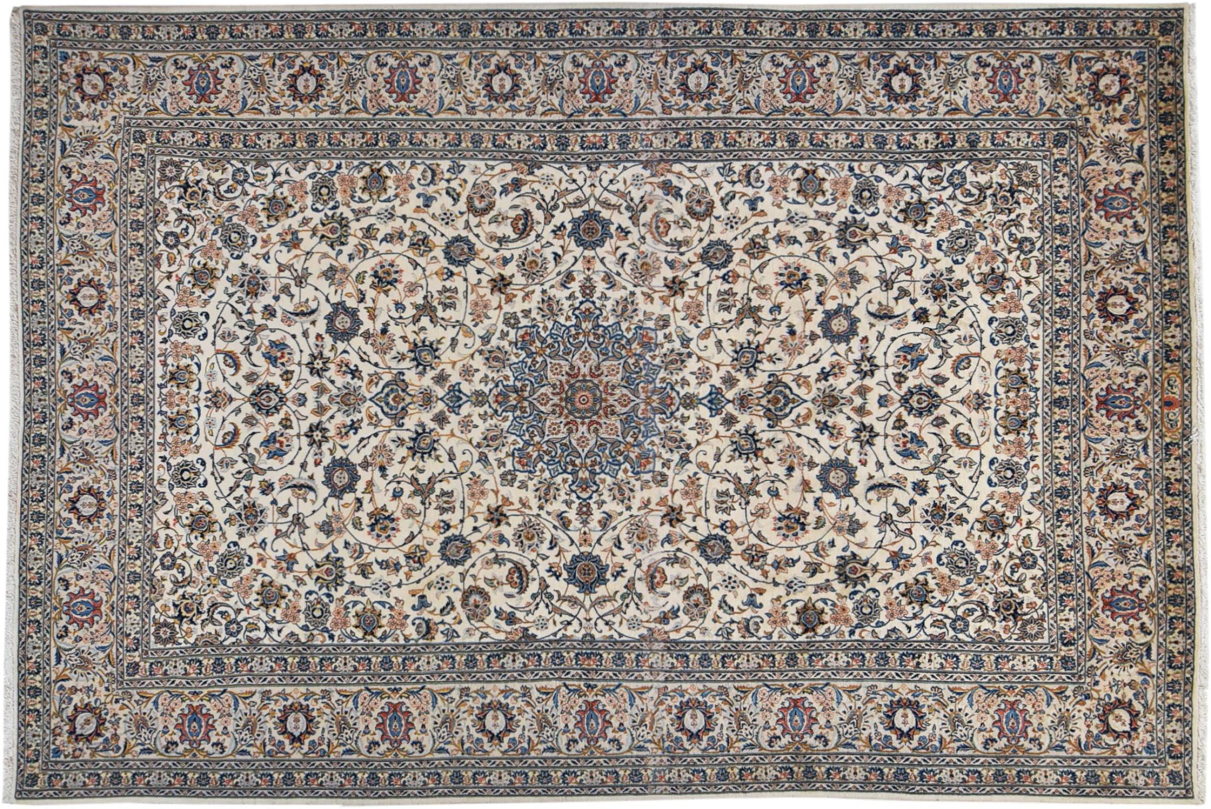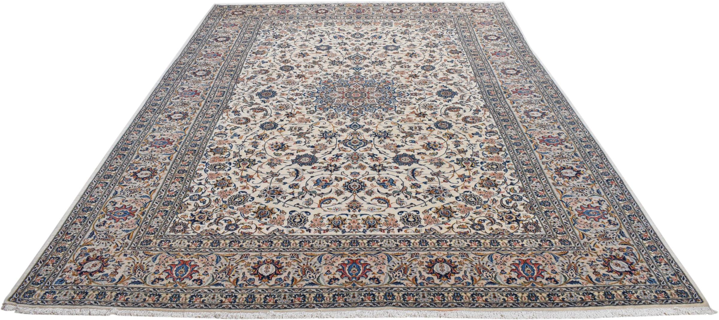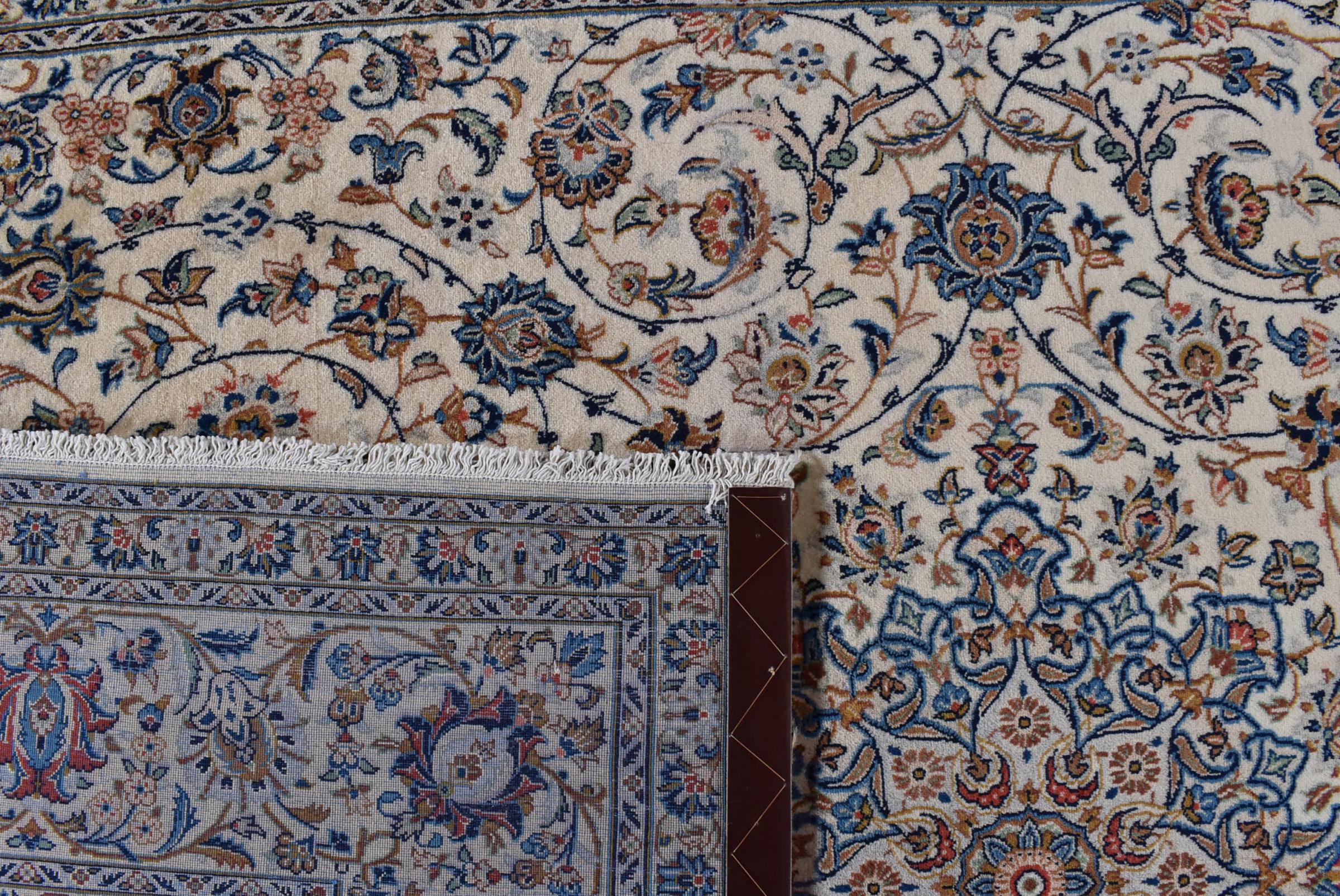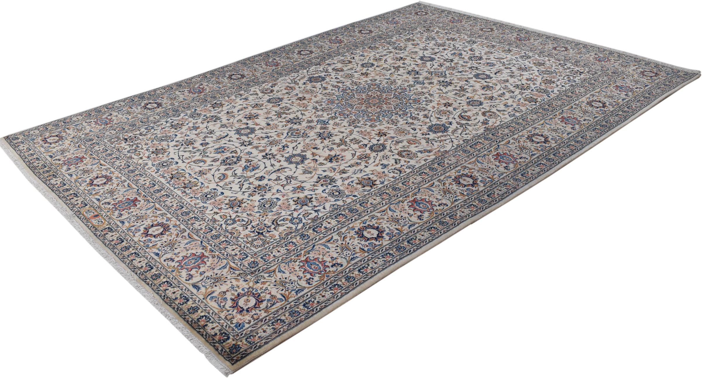 This carpet from Kashan (Keshan) is held in its very traditional and typical Persian design with beautiful ornaments. Kashan rugs are highly popular due to their exceptionally elegant design. These carpets originate from Kashan, a city on the ancient Silk Road. This carpet has been knotted by hand from high grade sheep wool and is going to be an one-of-a-kind highlight in your home.