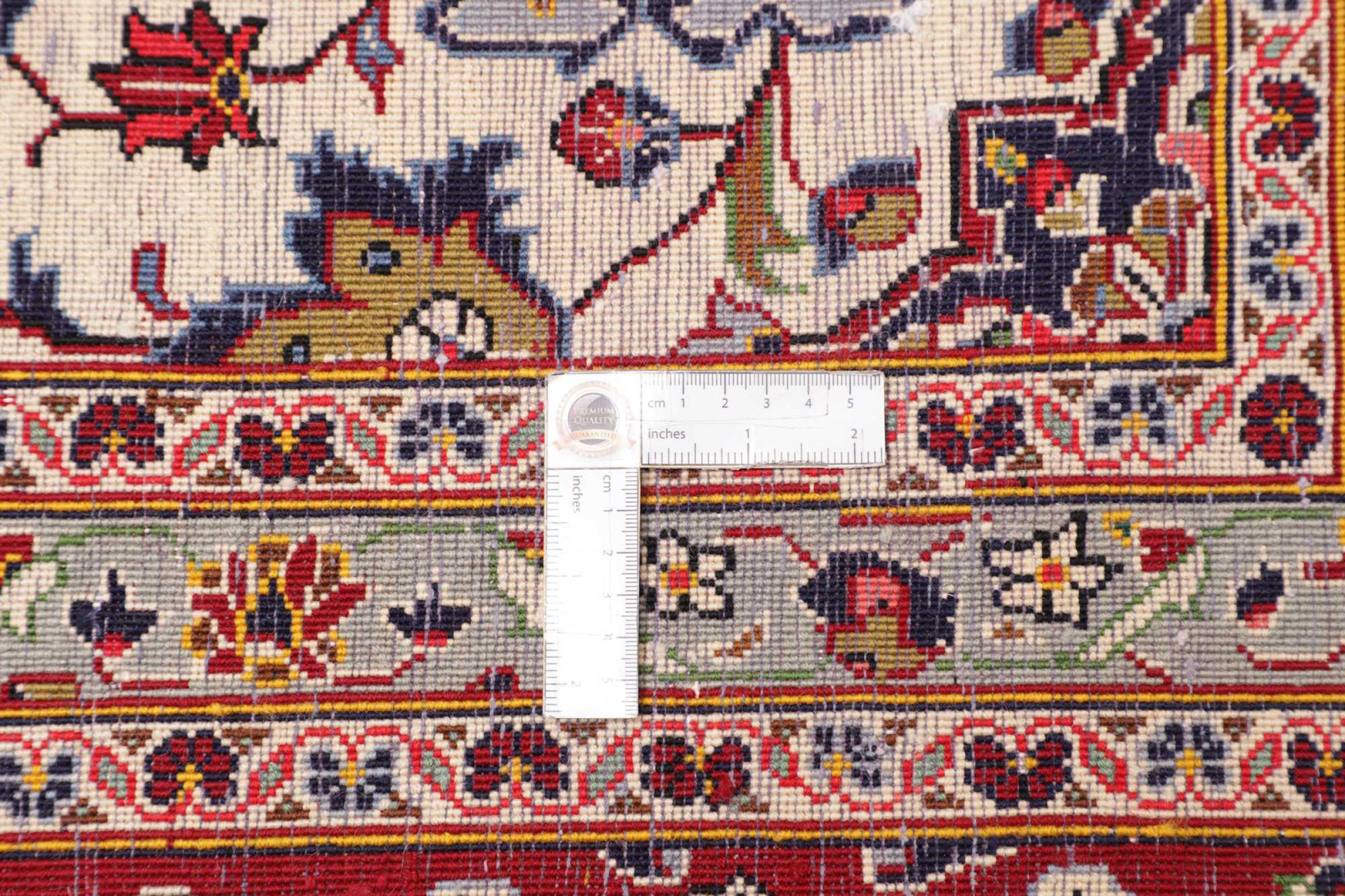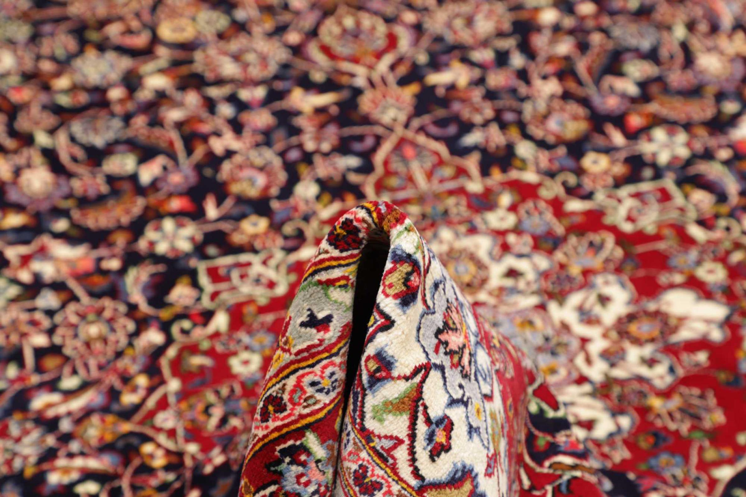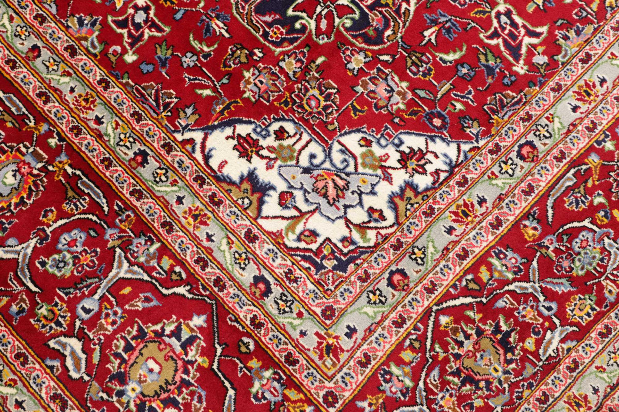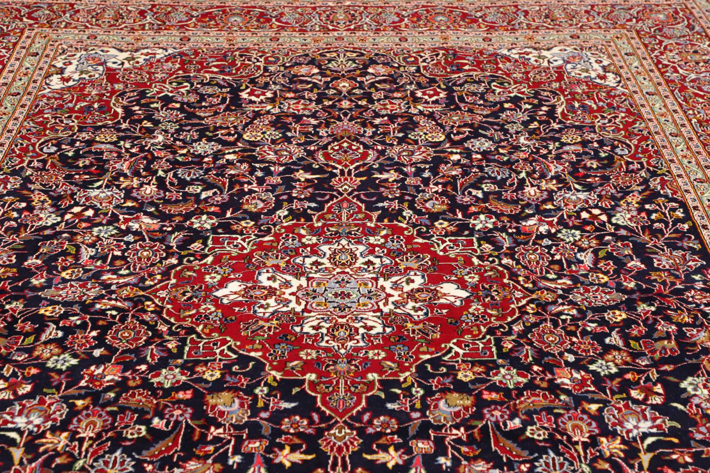 This carpet from Kashan (Keshan) is held in its very traditional and typical Persian design with beautiful ornaments. Kashan rugs are highly popular due to their exceptionally elegant design. These carpets originate from Kashan, a city on the ancient Silk Road. This carpet has been knotted by hand from high grade sheep wool and is going to be an one-of-a-kind highlight in your home.