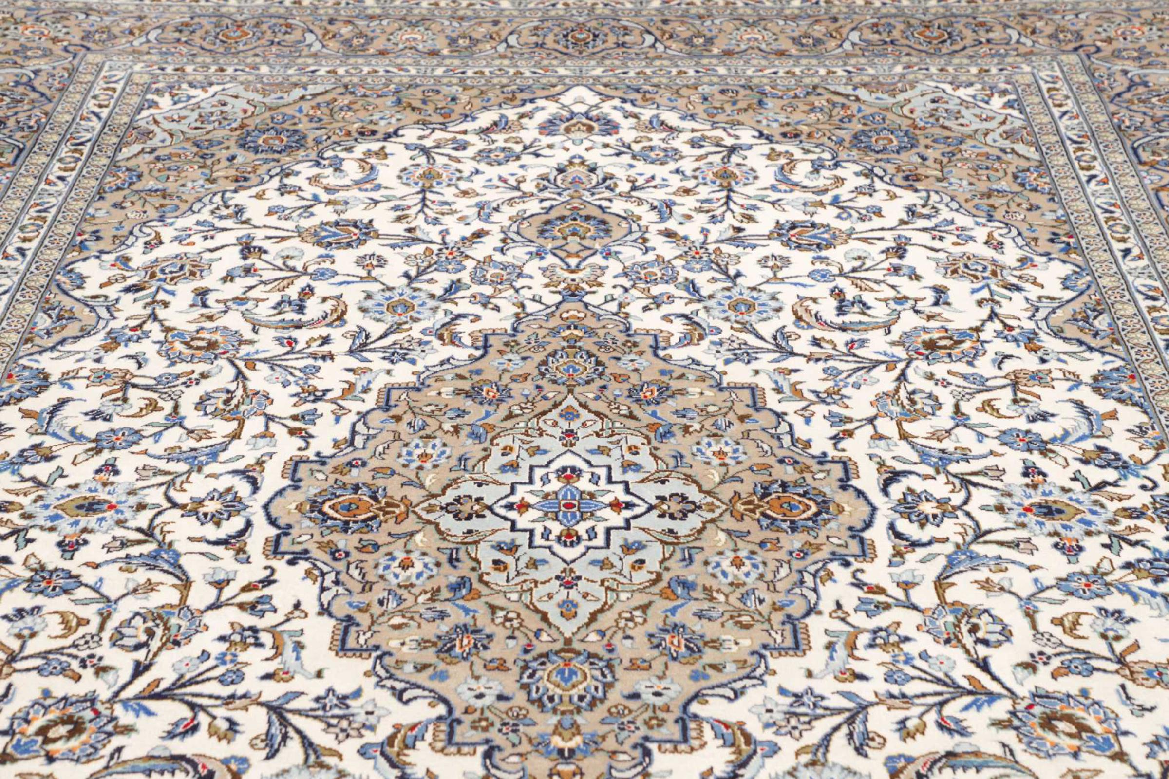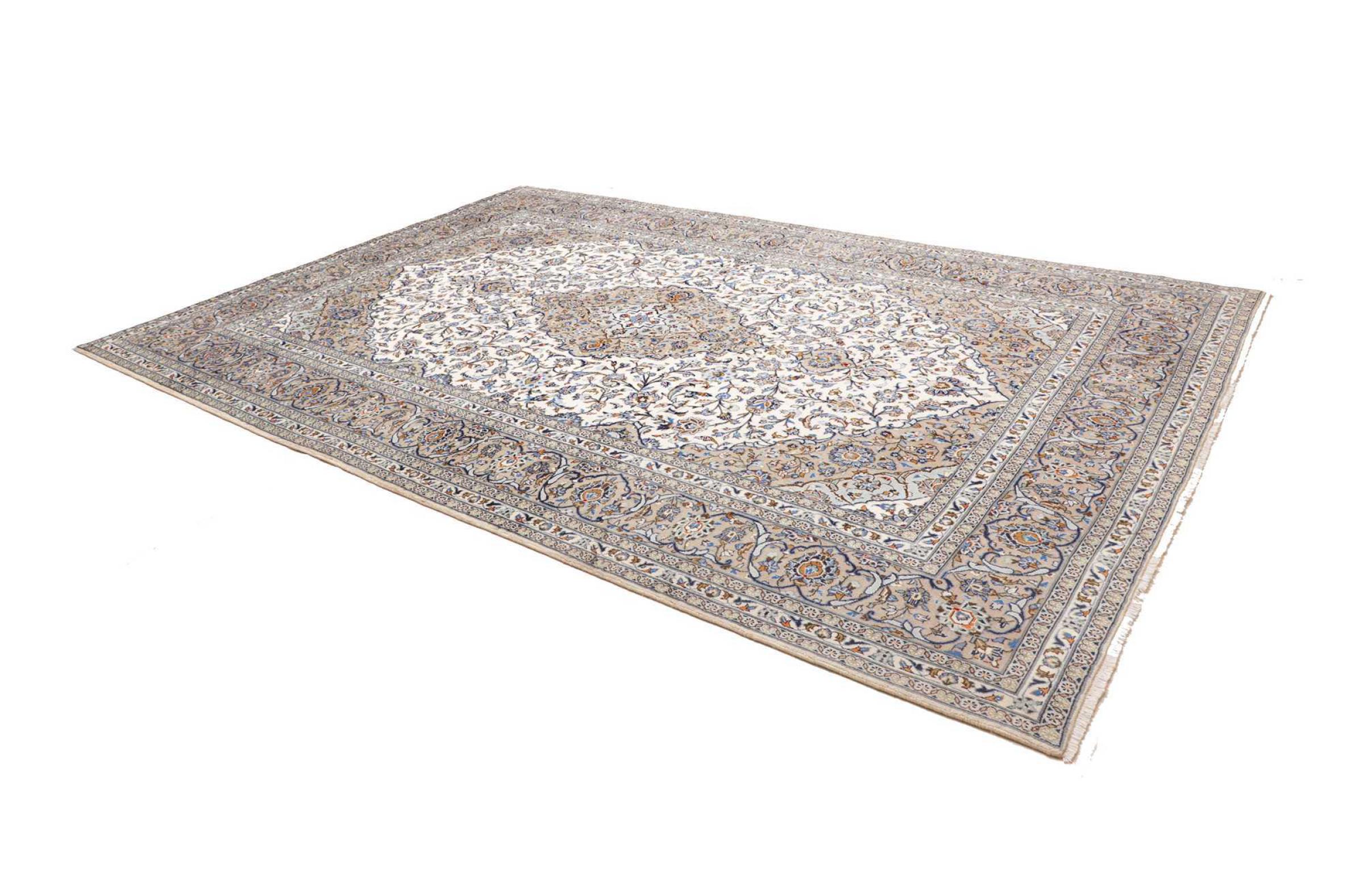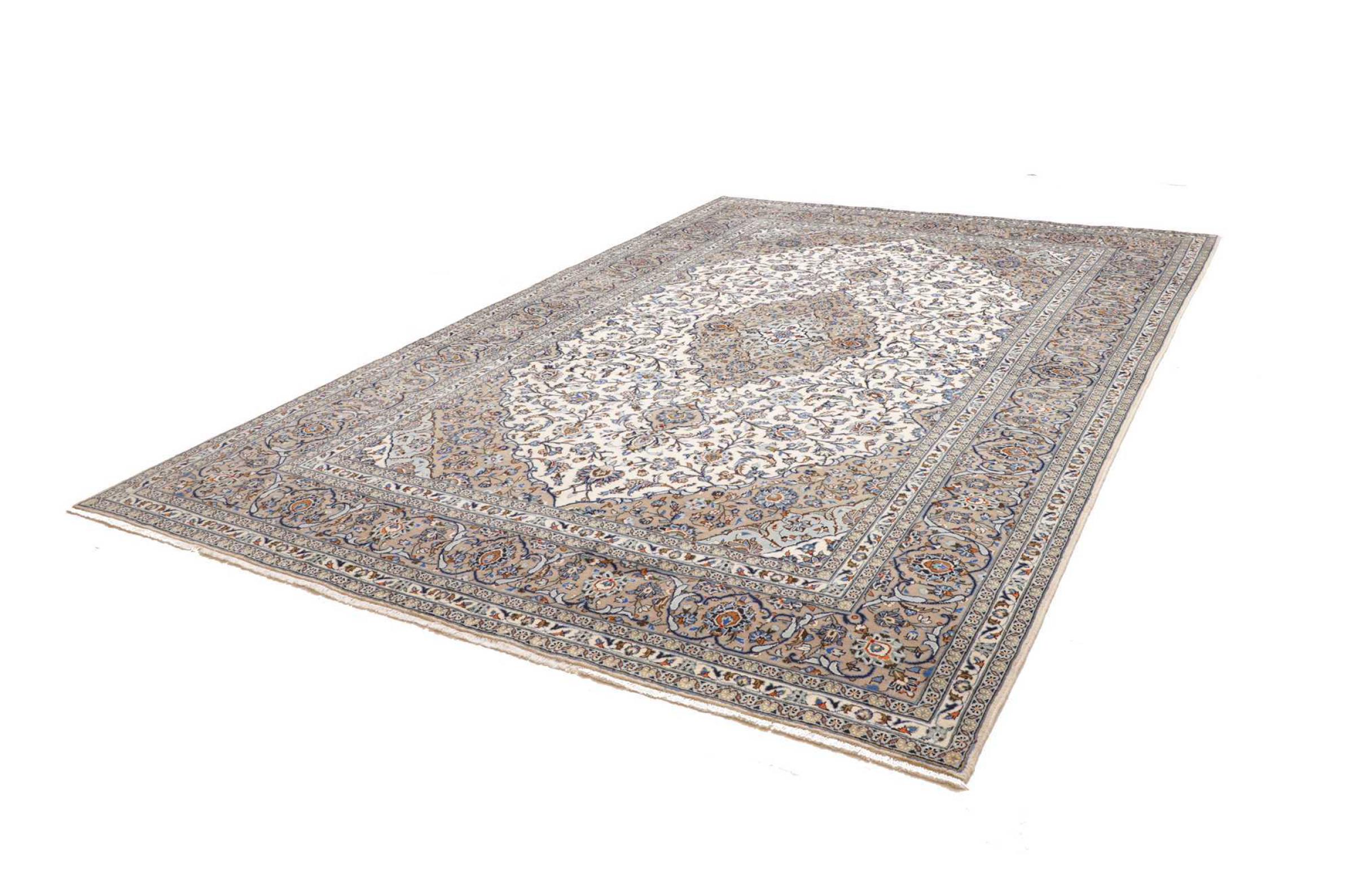 This carpet from Kashan (Keshan) is held in its very traditional and typical Persian design with beautiful ornaments. Kashan rugs are highly popular due to their exceptionally elegant design. These carpets originate from Kashan, a city on the ancient Silk Road. This carpet has been knotted by hand from high grade sheep wool and is going to be an one-of-a-kind highlight in your home.