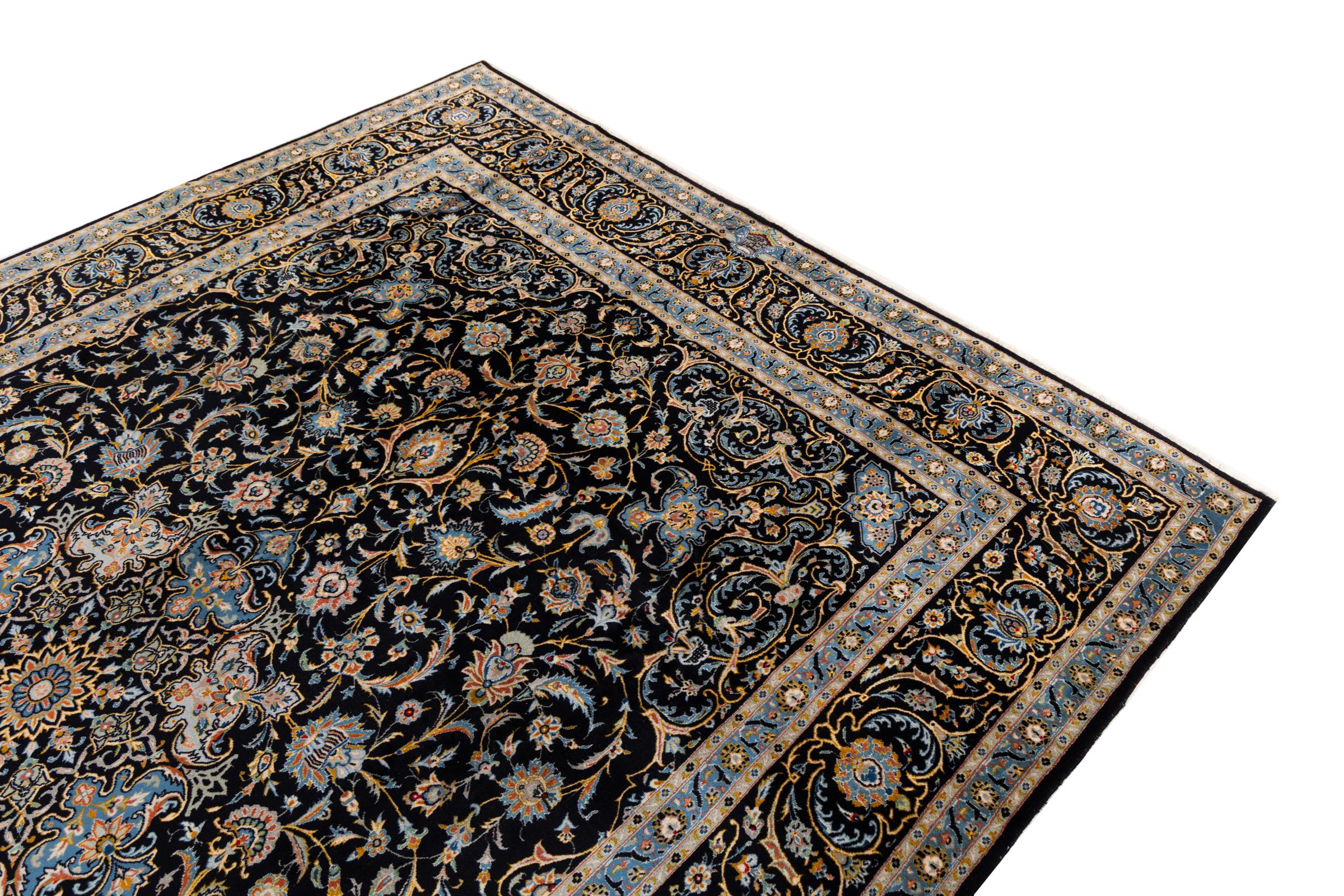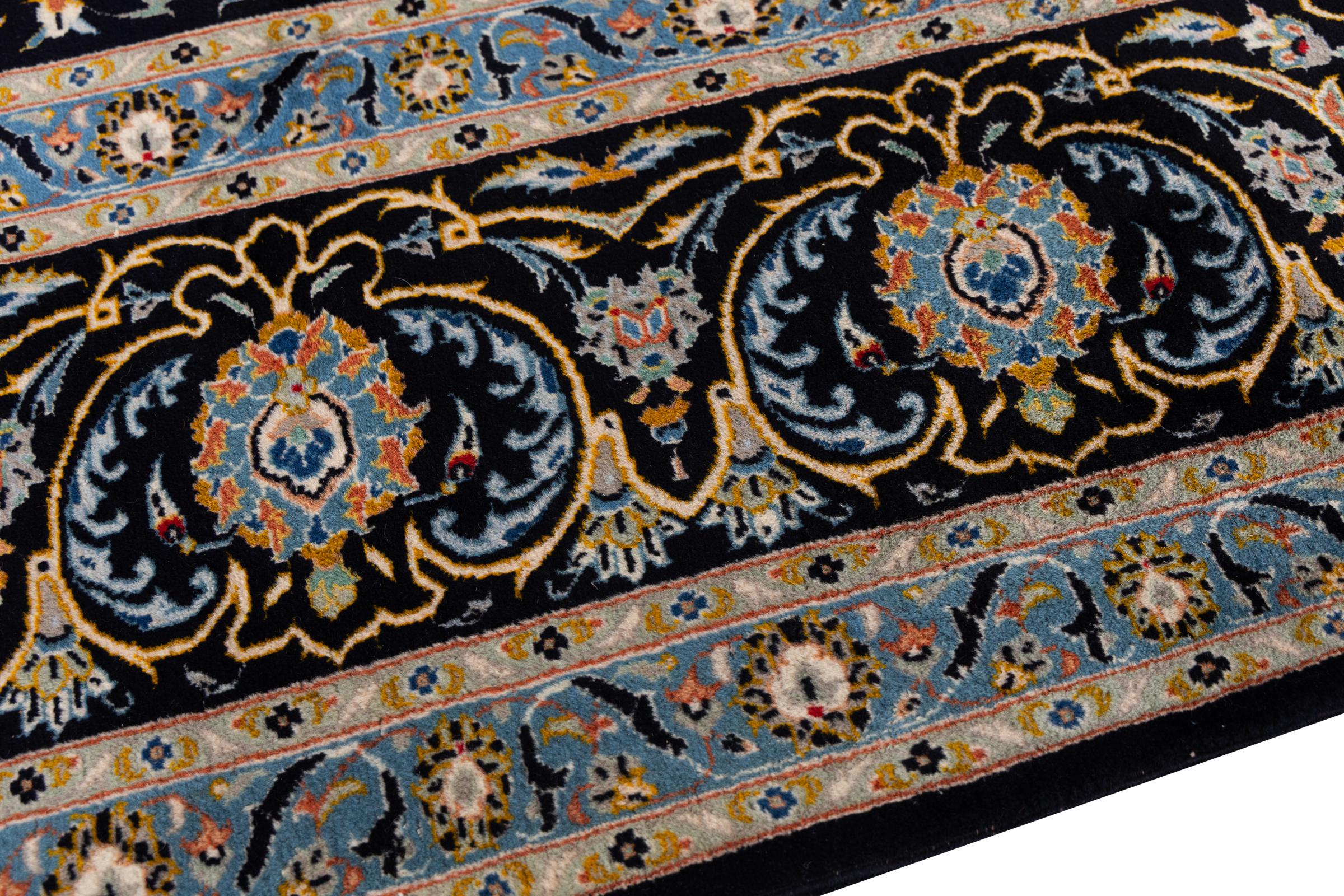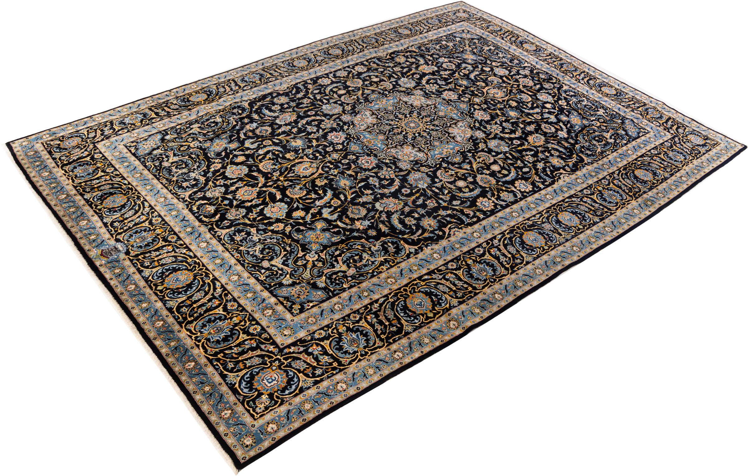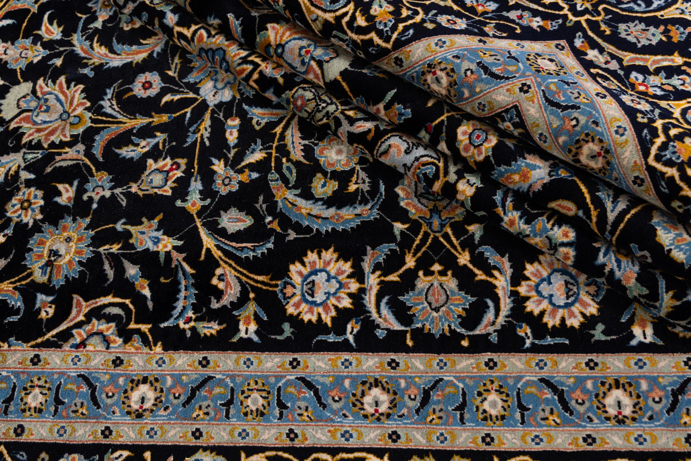 This carpet from Kashan (Keshan) is held in its very traditional and typical Persian design with beautiful ornaments. Kashan rugs are highly popular due to their exceptionally elegant design. These carpets originate from Kashan, a city on the ancient Silk Road. This carpet has been knotted by hand from high grade sheep wool and is going to be an one-of-a-kind highlight in your home.