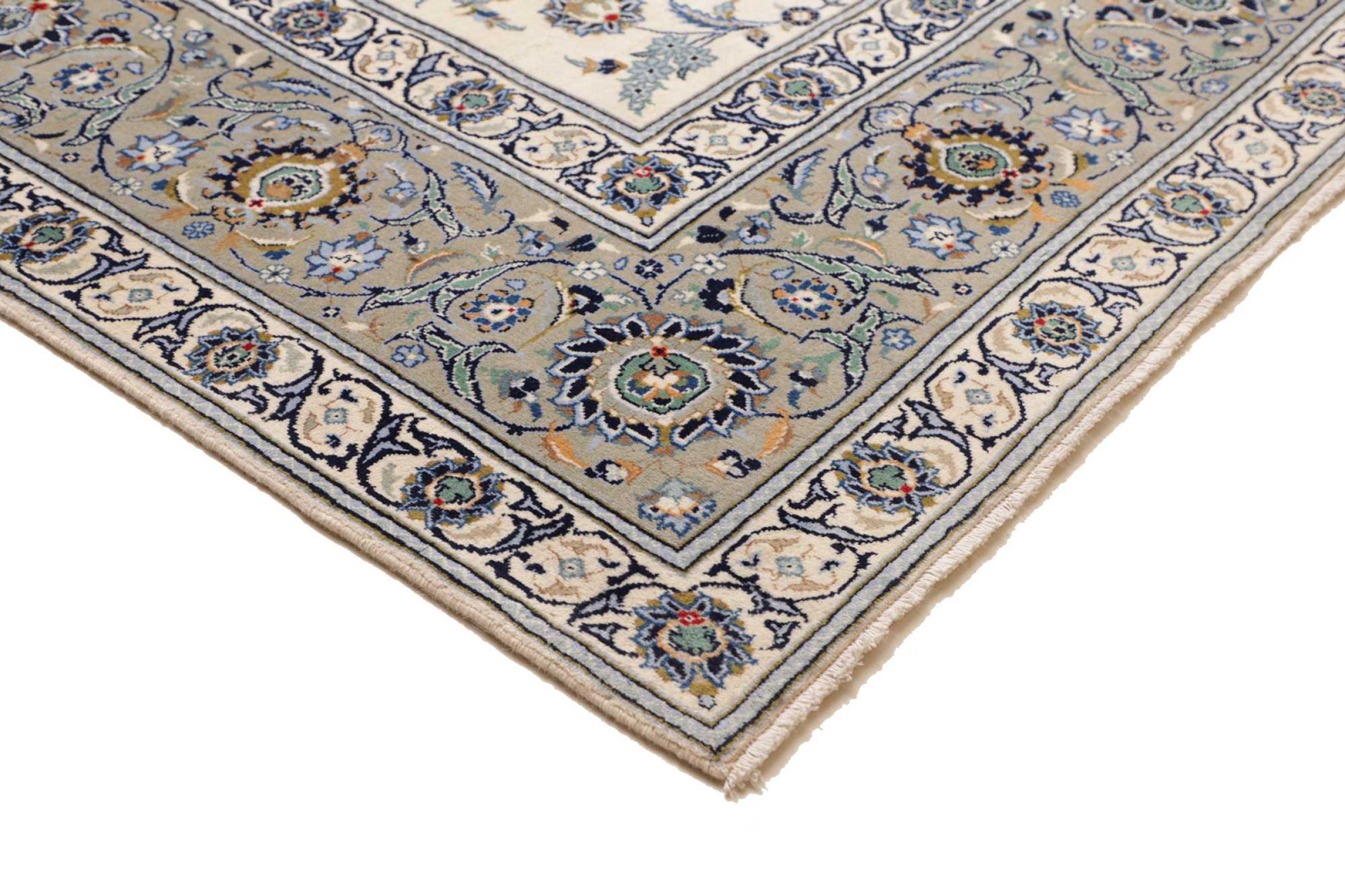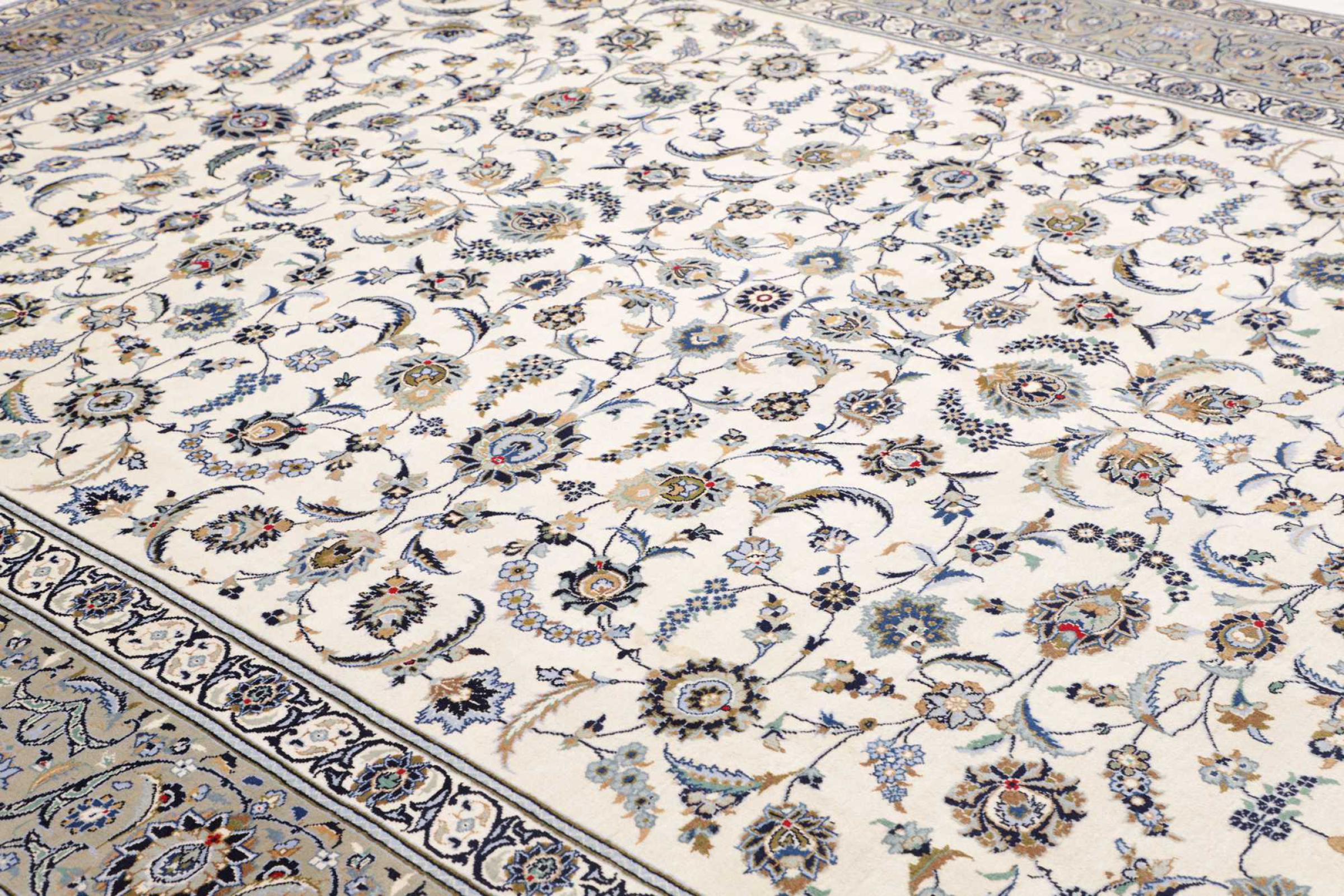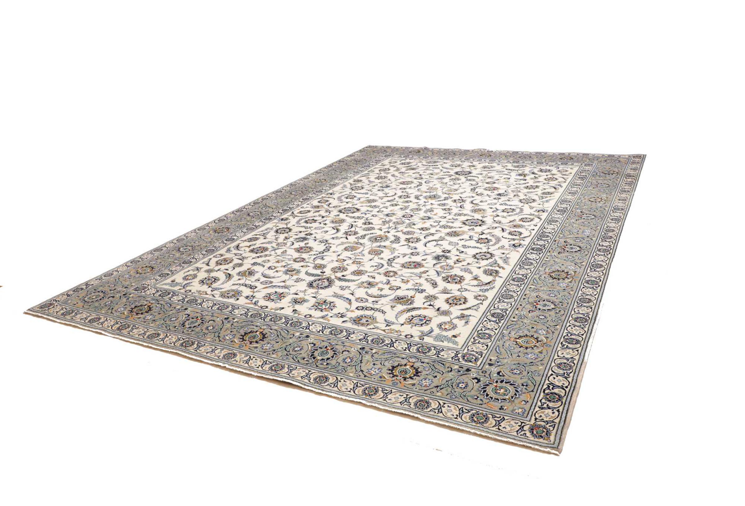This carpet from Kashan (Keshan) is held in its very traditional and typical Persian design with beautiful ornaments. Kashan rugs are highly popular due to their exceptionally elegant design. These carpets originate from Kashan, a city on the ancient Silk Road. This carpet has been knotted by hand from high grade sheep wool and is going to be an one-of-a-kind highlight in your home.