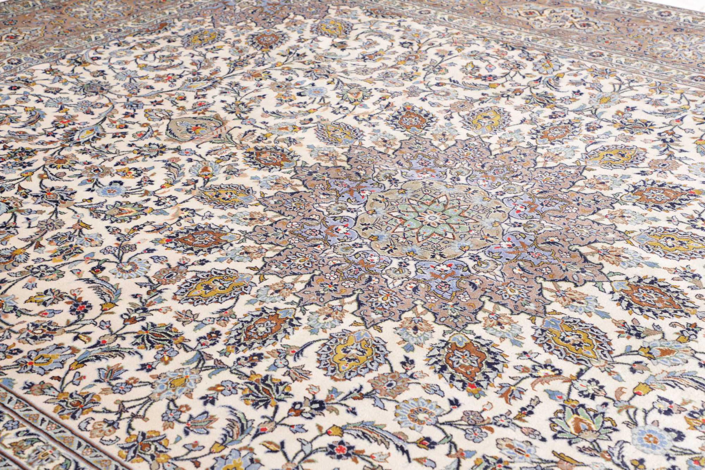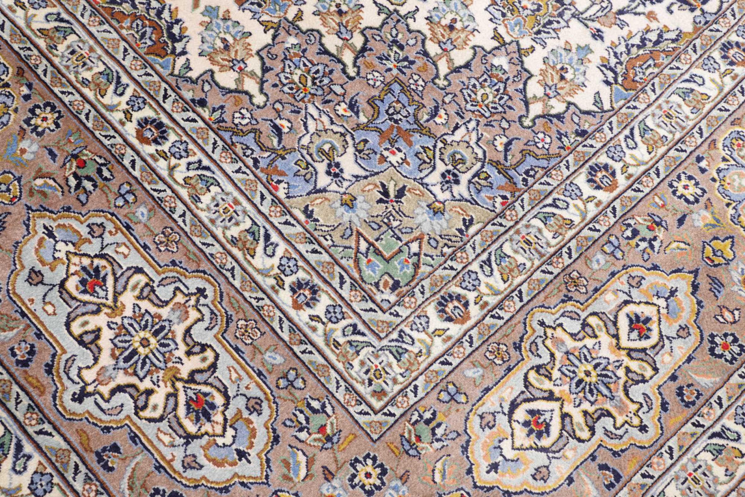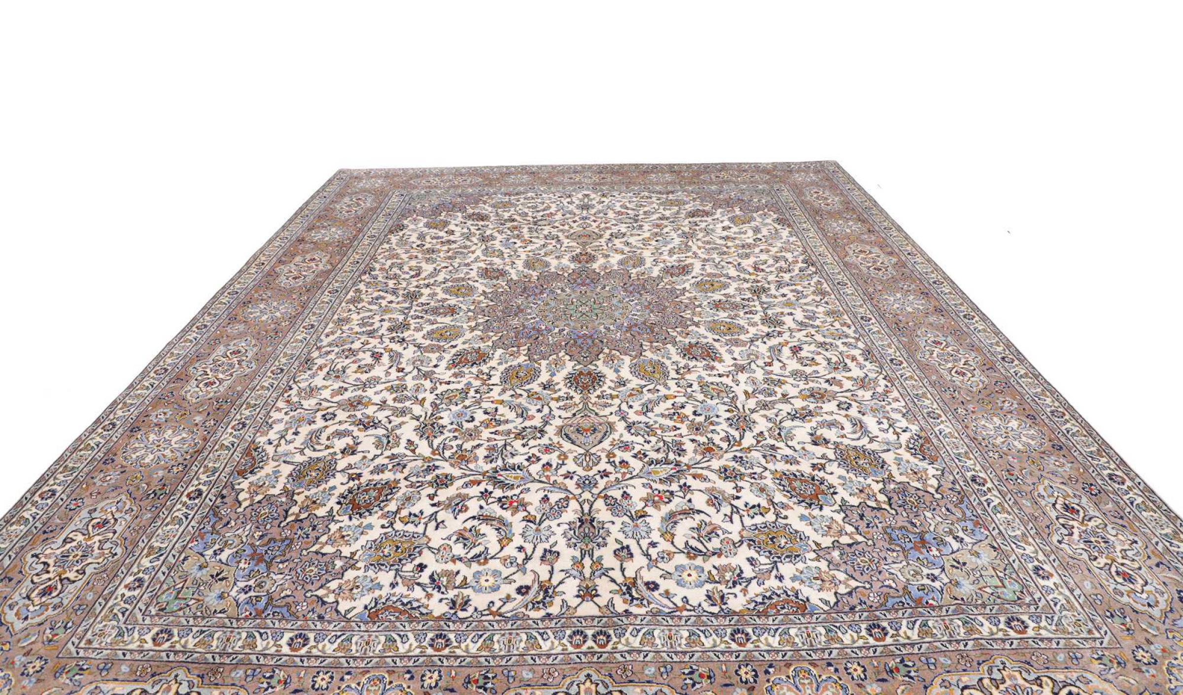 This carpet from Kashan (Keshan) is held in its very traditional and typical Persian design with beautiful ornaments. Kashan rugs are highly popular due to their exceptionally elegant design. These carpets originate from Kashan, a city on the ancient Silk Road. This carpet has been knotted by hand from high grade sheep wool and is going to be an one-of-a-kind highlight in your home.