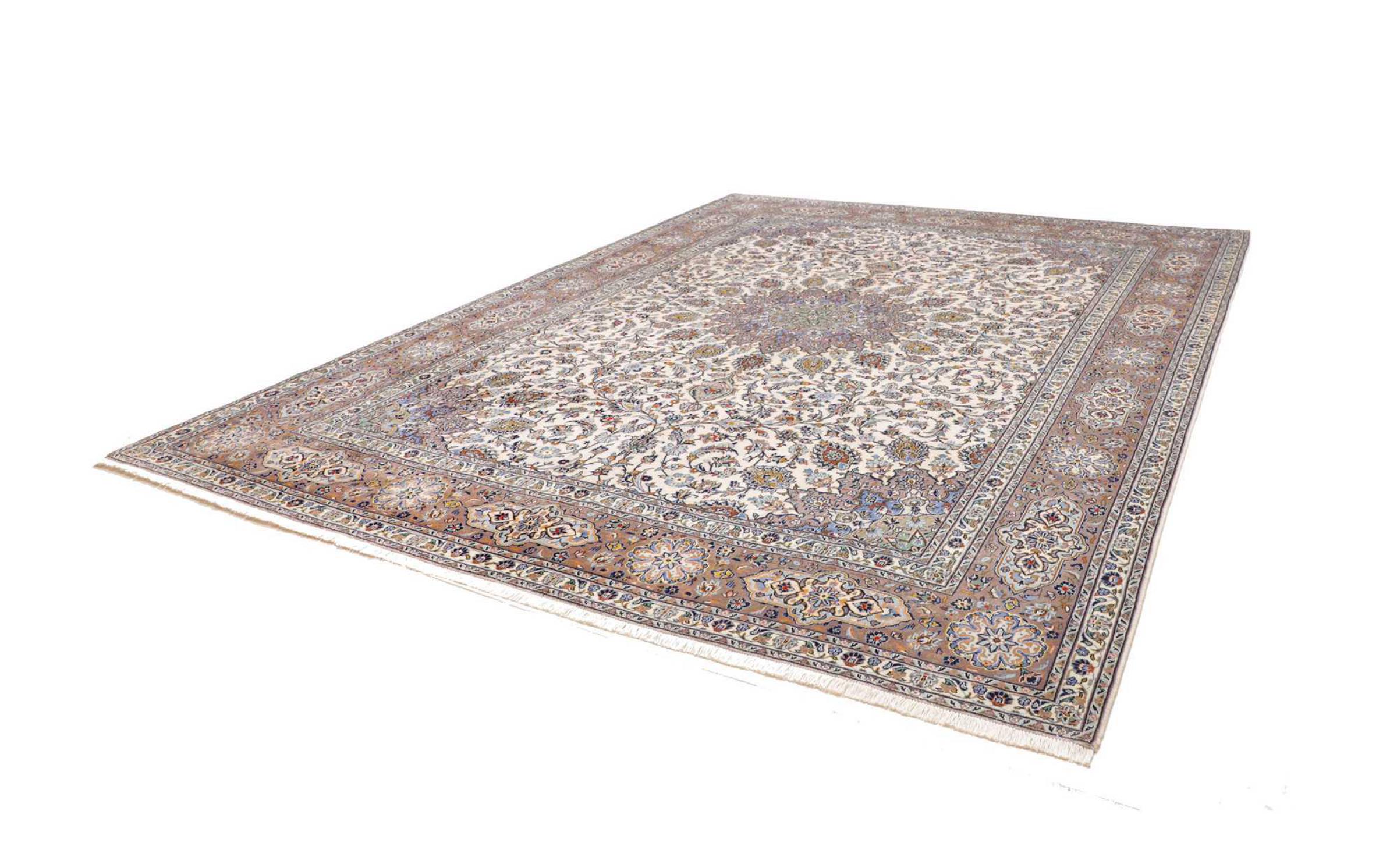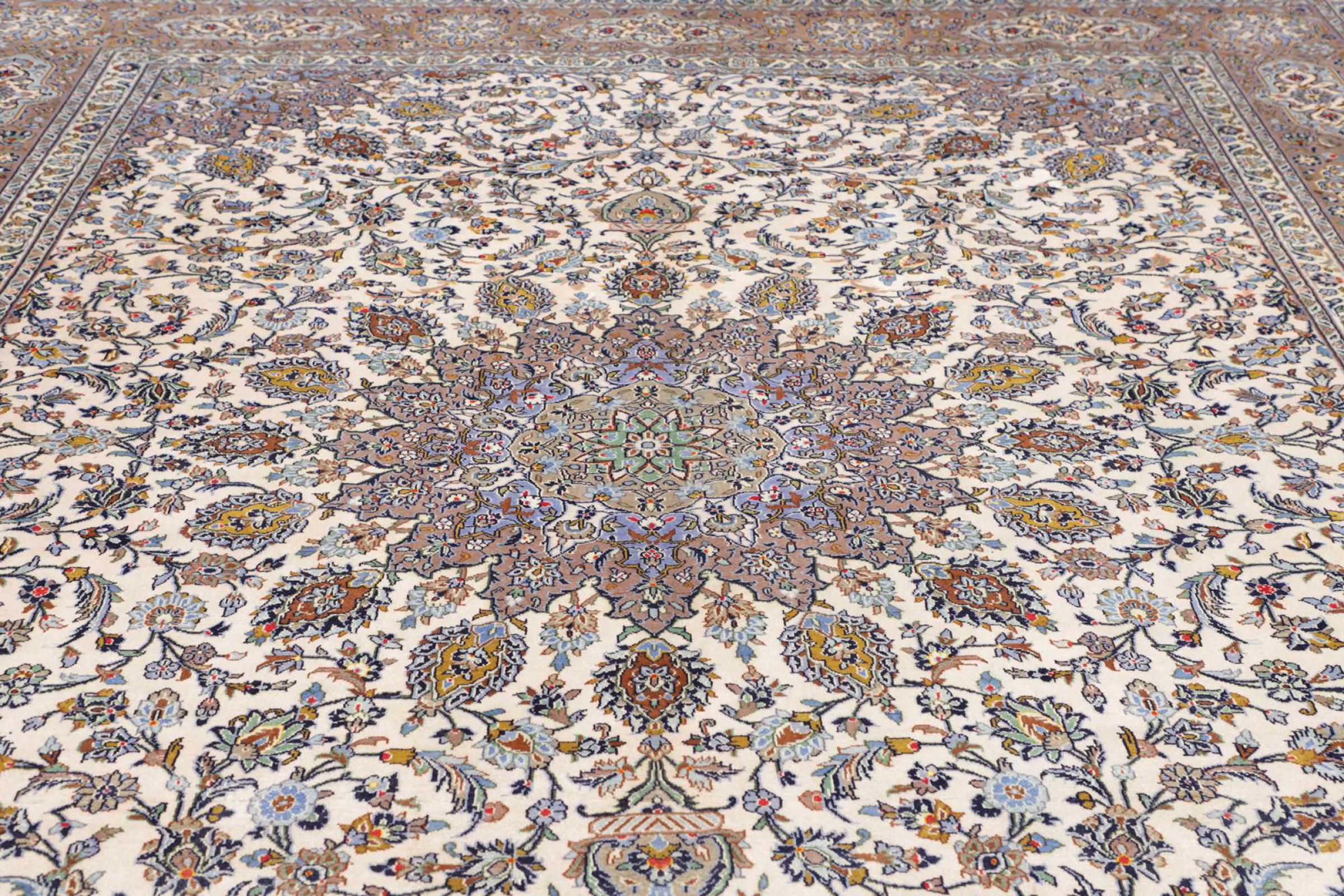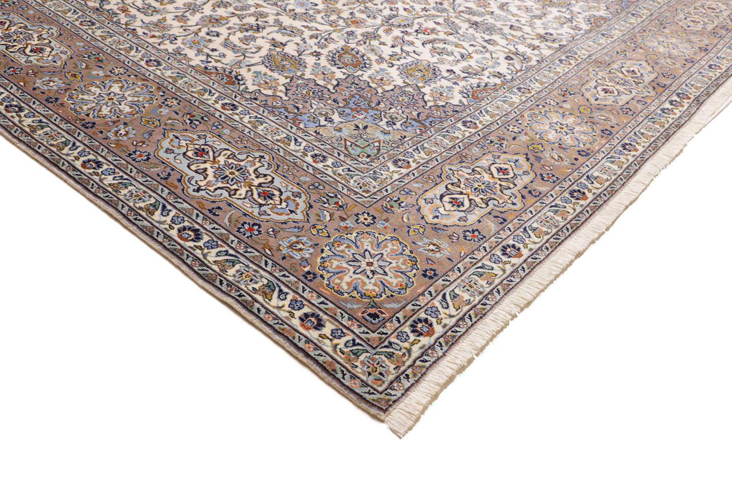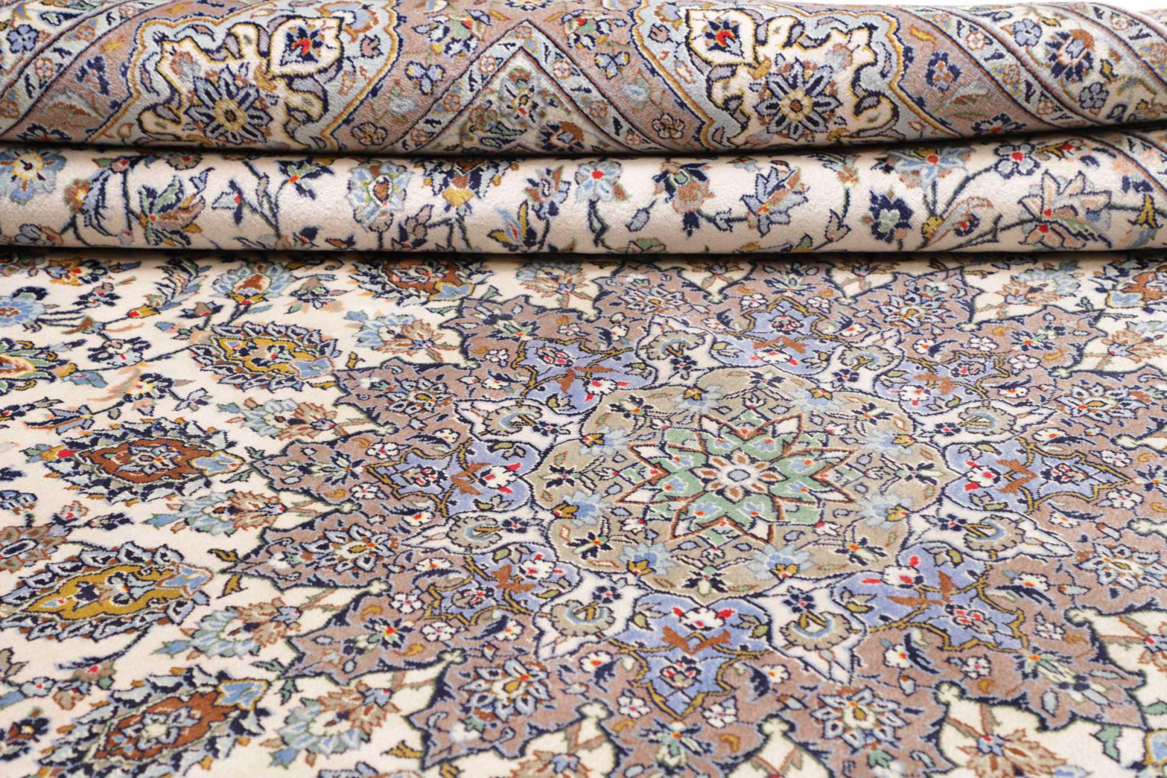 This carpet from Kashan (Keshan) is held in its very traditional and typical Persian design with beautiful ornaments. Kashan rugs are highly popular due to their exceptionally elegant design. These carpets originate from Kashan, a city on the ancient Silk Road. This carpet has been knotted by hand from high grade sheep wool and is going to be an one-of-a-kind highlight in your home.