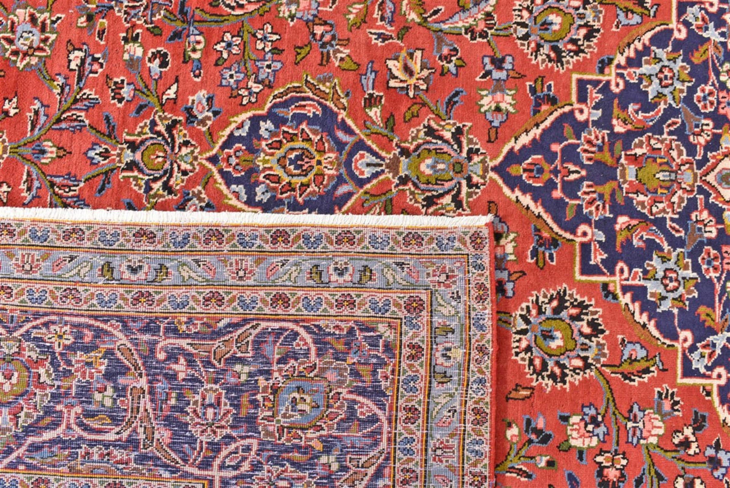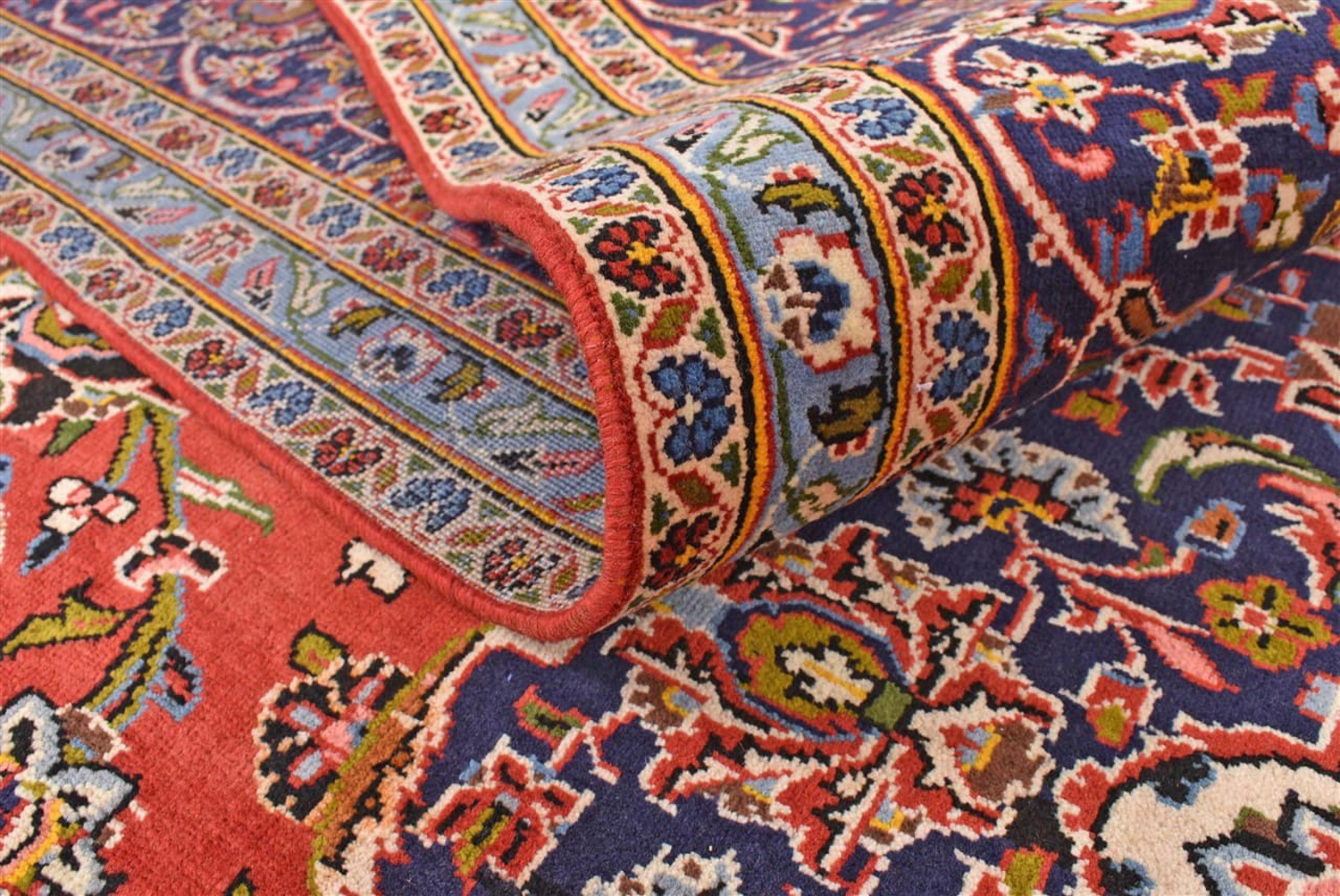 This carpet from Kashan (Keshan) is held in its very traditional and typical Persian design with beautiful ornaments. Kashan rugs are highly popular due to their exceptionally elegant design. These carpets originate from Kashan, a city on the ancient Silk Road. This carpet has been knotted by hand from high grade sheep wool and is going to be an one-of-a-kind highlight in your home.